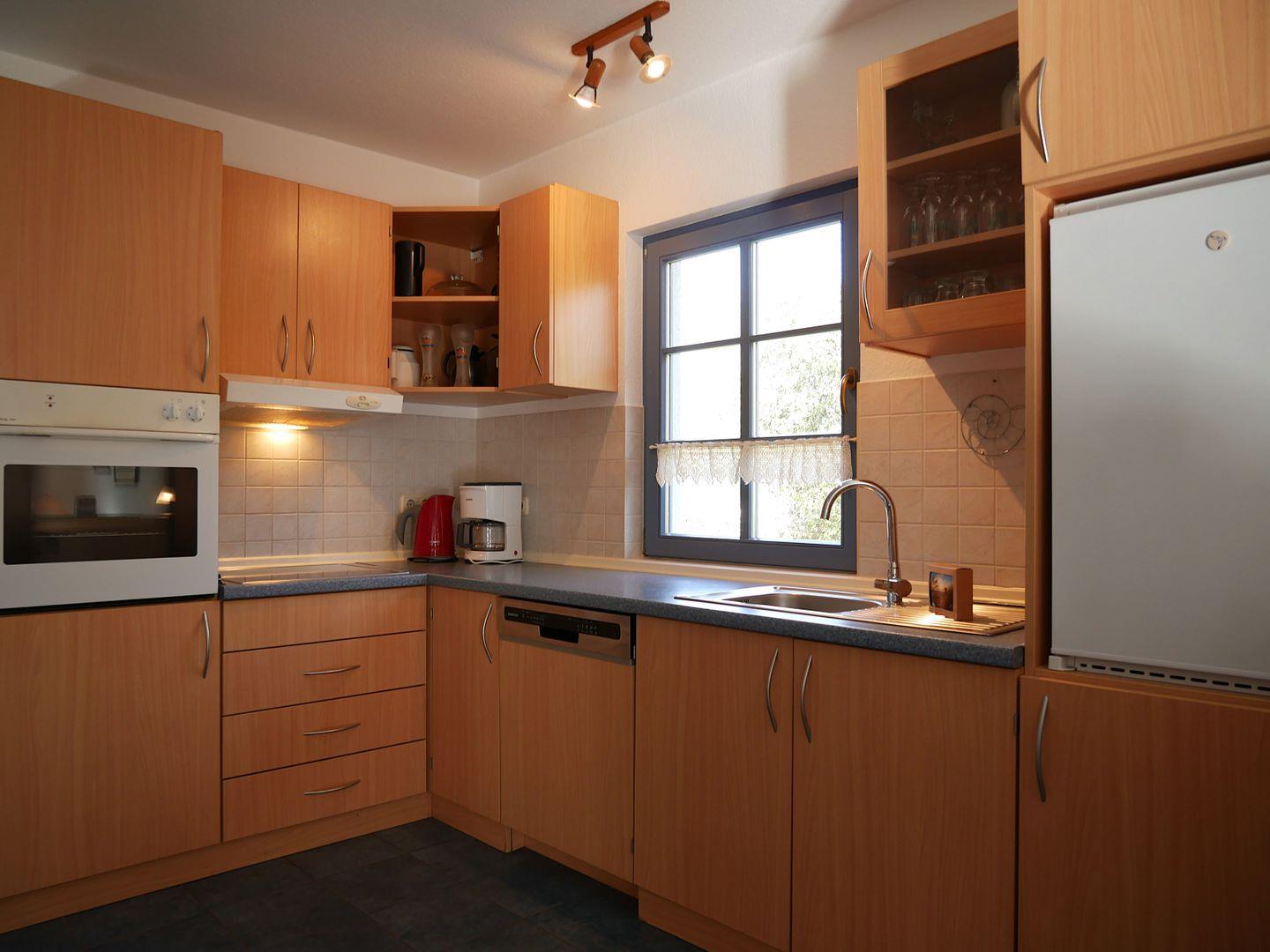 Die integrierte Küche ist mit allen notwendigen technischen Geräten, wie Kühlschrank mit Gefrierfach, Herd mit Backofen, Geschirrspülmaschine, Kaffeemaschine und diverse andere Utensilien ausgestattet und bietet Ihnen gute Möglichkeiten, sich bei Bedarf selbst zu versorgen.