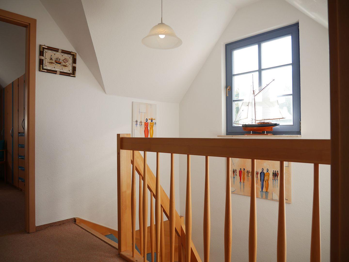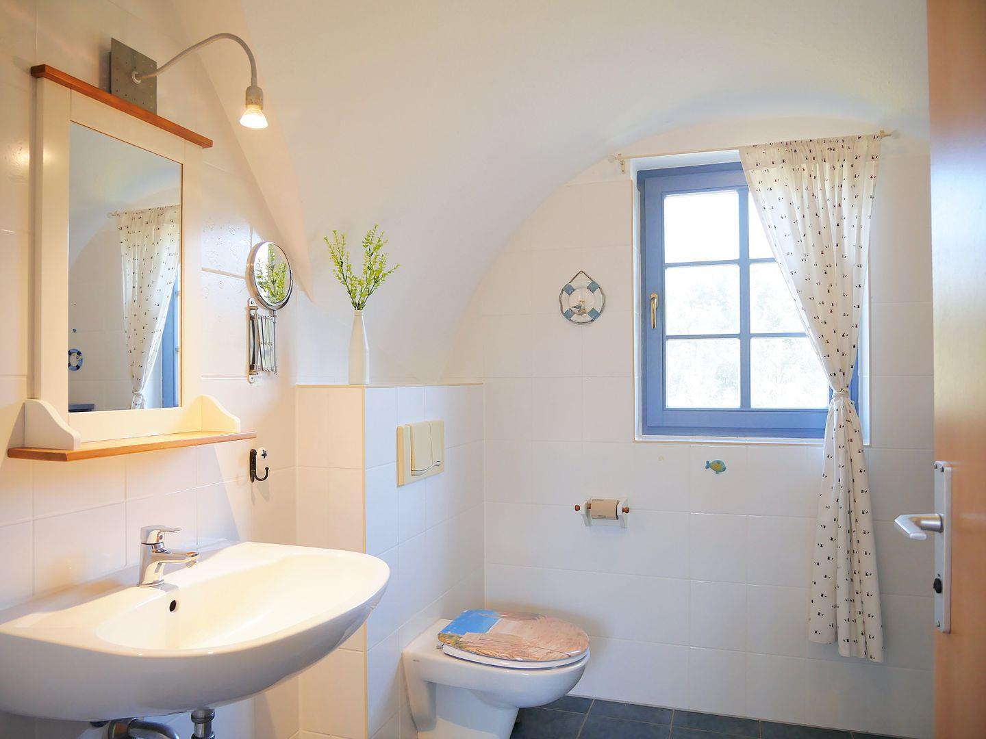 Weiterhin hält das Obergeschoss ein Tageslichtbadezimmer mit Dusche, Waschtisch und WC für Sie bereit. Ein zusätzliches Gäste-WC mit Fenster befindet sich in der unteren Etage.