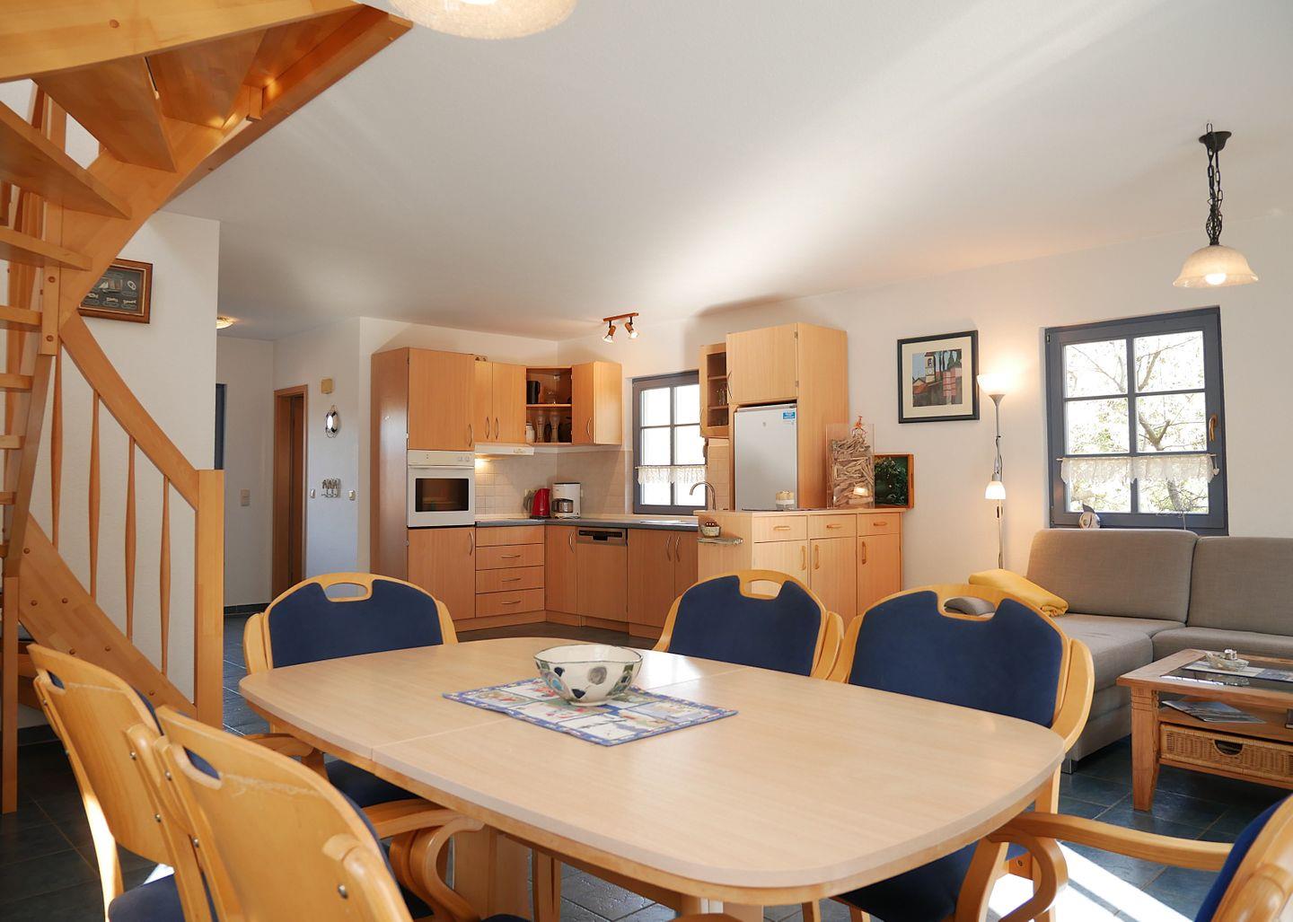 Die untere Etage des Hauses wurde in offener Bauweise gestaltet und begrüßt Sie mit einem großzügigen, kombiniertem Wohn- und Essbereich mit integrierter Küche und Blick in den Garten. Eine gemütliche Sofaecke mit zwei Sesseln, TV-Gerät und Kamin laden zum relaxen und erholen ein. Der angrenzende Esstisch bietet genügend Platz für ausgiebige Mahlzeiten und gesellige Abende. Hier befindet sich auch der Zugang zu der möblierten Terrasse mit dem großzügigen Garten, der genügend Platz zum Sonnenbaden bietet.