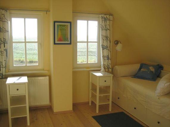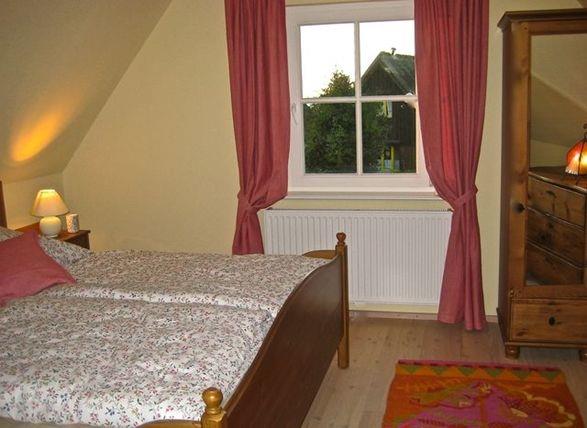 Über eine Treppe gelangen Sie in die obere Etage des Ferienhauses. Hier verfügen Sie über zwei separate Schlafzimmer, die entweder mit einem Doppelbett oder zwei Einzelbetten möbliert sind. Die beiden Einzelbetten lassen sich jeweils bei Bedarf ausziehen und bieten somit zwei weitere Schlafplätze. Genügend Stauraum befindet sich ebenfalls in beiden Zimmern.