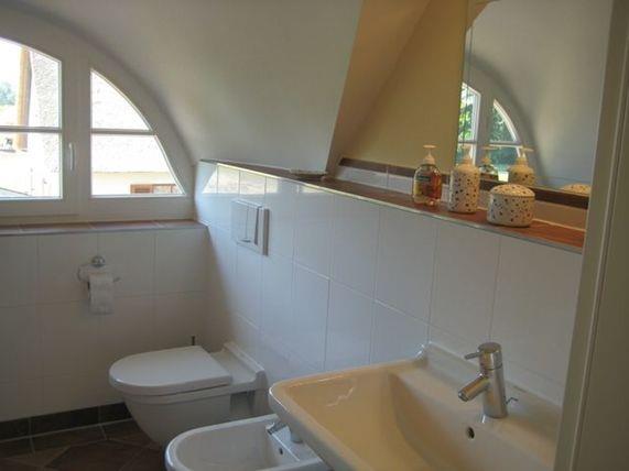 Das Badezimmer mit Fenster ist mit einer Badewanne, Waschtisch und WC ausgestattet. Im Erdgeschoss des Hauses befindet sich außerdem das Gästebadezimmer mit ebenerdiger Dusche, Waschtisch und WC.