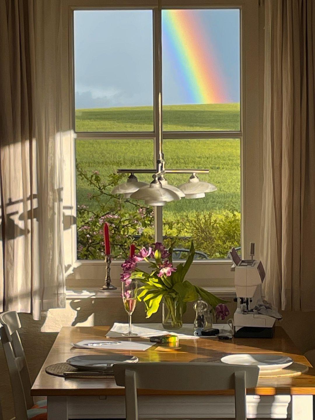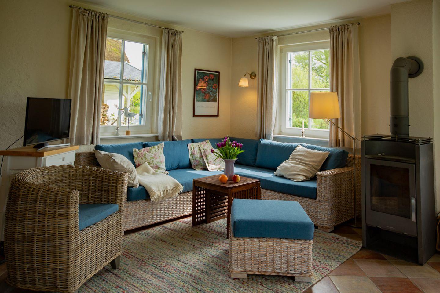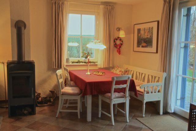 Der charmant eingerichtete Wohn- und Essbereich lädt mit seiner Sofaecke, dem TV-Gerät, WLAN, dem Kamin und der gemütlichen Sitzecke mit Esstisch zu entspannten Stunden ein. Außerdem befindet sich hier der Zugang zur möblierten Terrasse mit Grill, von der Sie einen tollen Blick in den angrenzenden Garten und die weiten Felder und Wiesen haben.