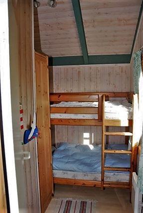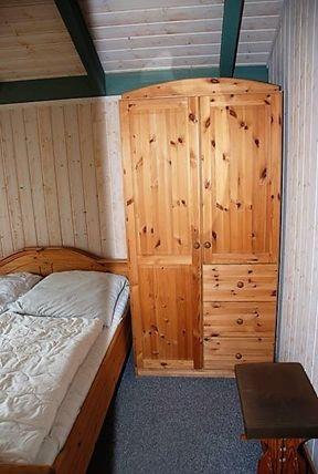 Zwei weitere separate Schlafzimmer sind entweder mit einem kleinen Doppelbett (durchgehende Matratze) oder mit einem Etagenbett und jeweils einem Kleiderschrank möbliert.