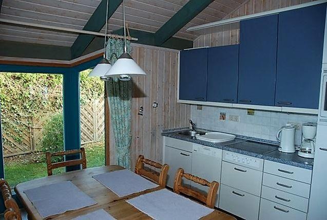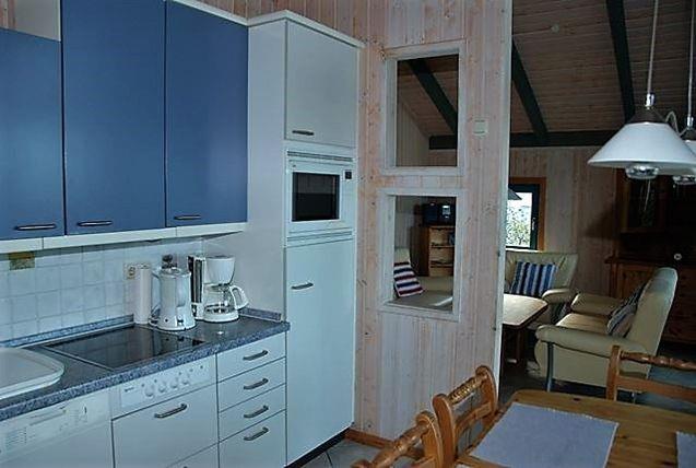Ein kombinierter und offen gestalteter Wohn- und Essbereich mit integrierter Küche laden zu geselligen Stunden mit der Familie ein. Sie verfügen über eine gemütliche Sofaecke mit TV-Gerät und einen Esstisch mit Stühlen. Außerdem befindet sich hier der Zugang zu der möblierten und überdachten Terrasse. Die integrierte Küche ist mit einem Kühlschrank mit Gefrierfach, einem Herd, einer Geschirrspülmaschine, Wasserkocher und Kaffeemaschine ausgestattet und bietet Ihnen gute Möglichkeiten, sich bei Bedarf selbst zu versorgen.