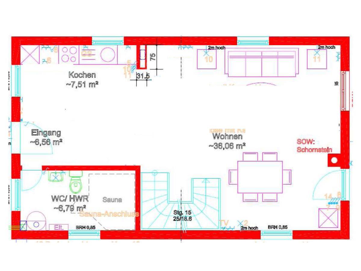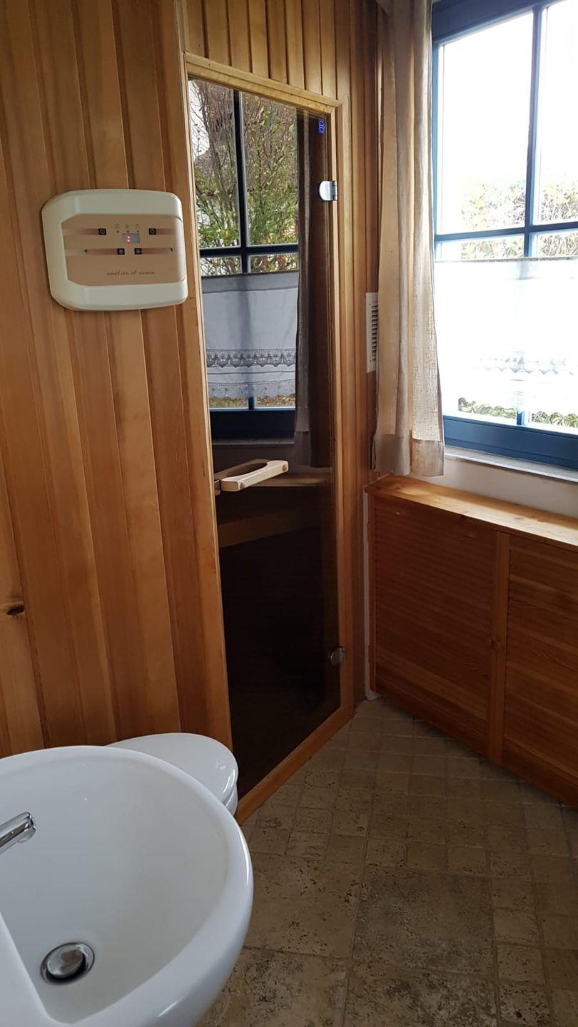Im Erdgeschoss des Hauses befindet sich außerdem das Gästebadezimmer mit Sauna und WC und Waschbecken.