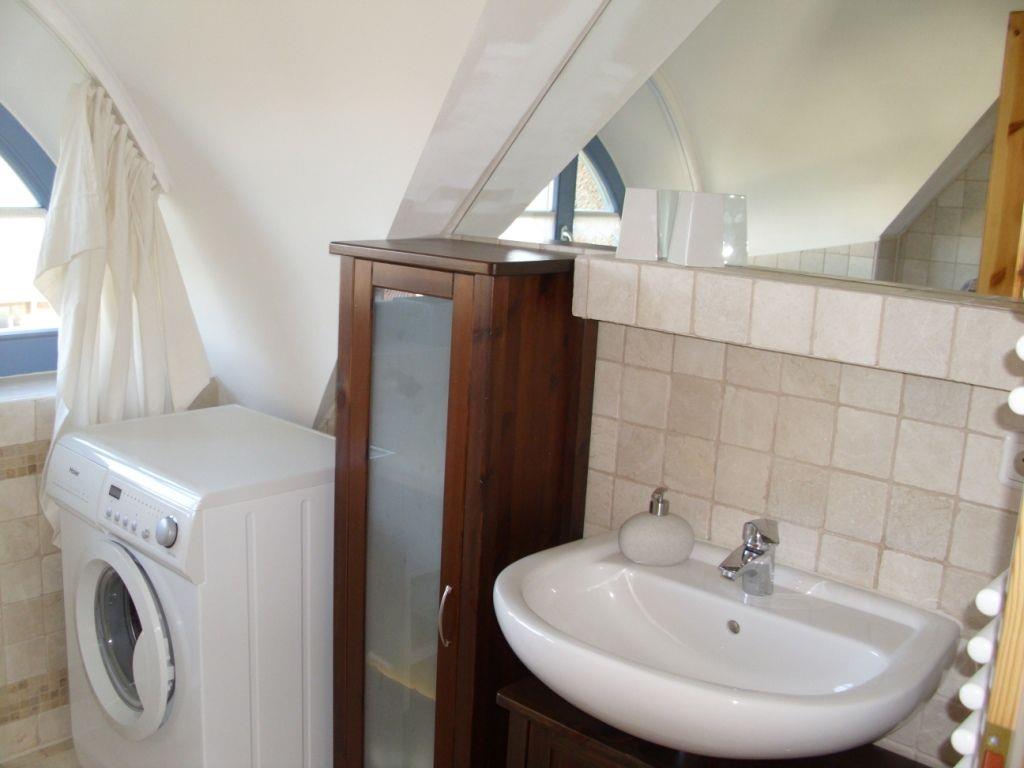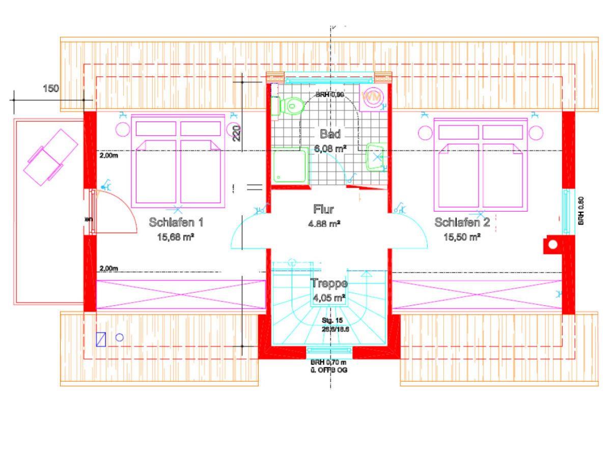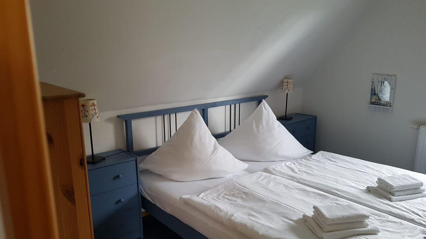 Über eine Treppe gelangen Sie in die obere Etage des Ferienhauses. Hier befinden sich die beiden separaten Schlafzimmer und das Badezimmer. Die Schlafzimmer sind mit Doppelbetten und ausreichend Stauraum für Ihre Garderobe möbliert und ermöglichen erholsame Nächte. Das Badezimmer ist mit einer Dusche, Waschtisch, WC und Waschmaschine ausgestattet.