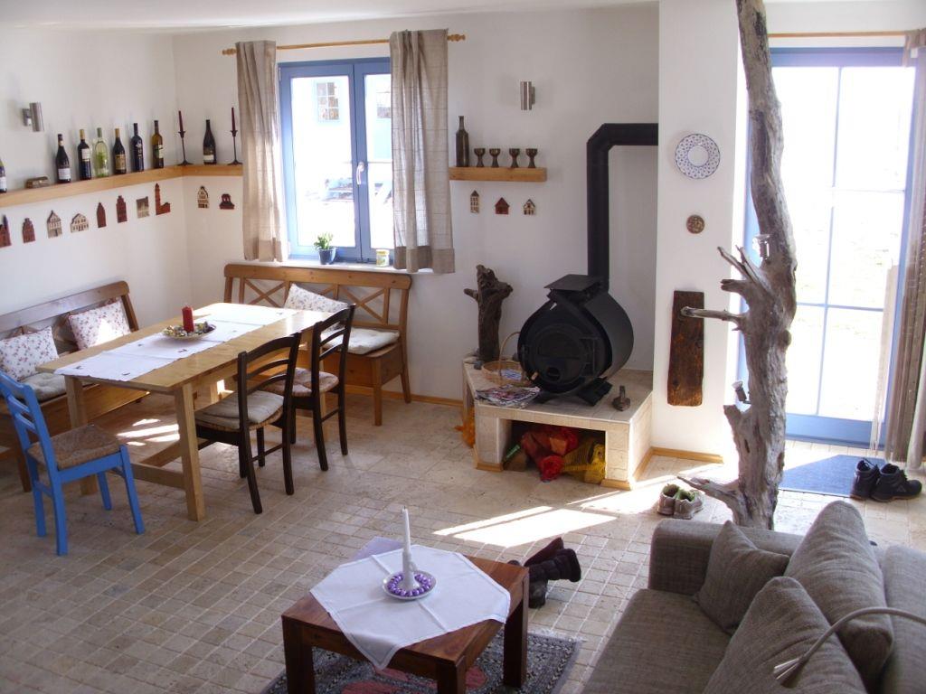 Der offene und hell gestaltete Wohn- und Essbereich im Erdgeschoss des Hauses verfügt über eine gemütliche Sofaecke mit TV-Gerät, WLAN Esstisch und Zugang zur möblierten Terrasse. Der kanadische Holzofen sorgt in der kälteren Jahreszeit für eine angenehme Wohlfühlatmosphäre.