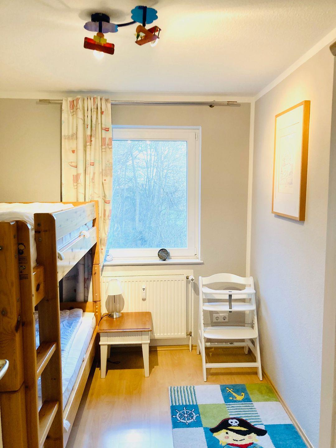 Das separate, komfortable Schlafzimmer verfügt über ein Doppelbett (180 x 200cm) mit herrlichem Blick auf die umliegende Natur. Ein weiteres Zimmer verfügt über ein Etagenbett (90x200cm). Stauraum für Ihre Garderobe ist ebenfalls genügend vorhanden.