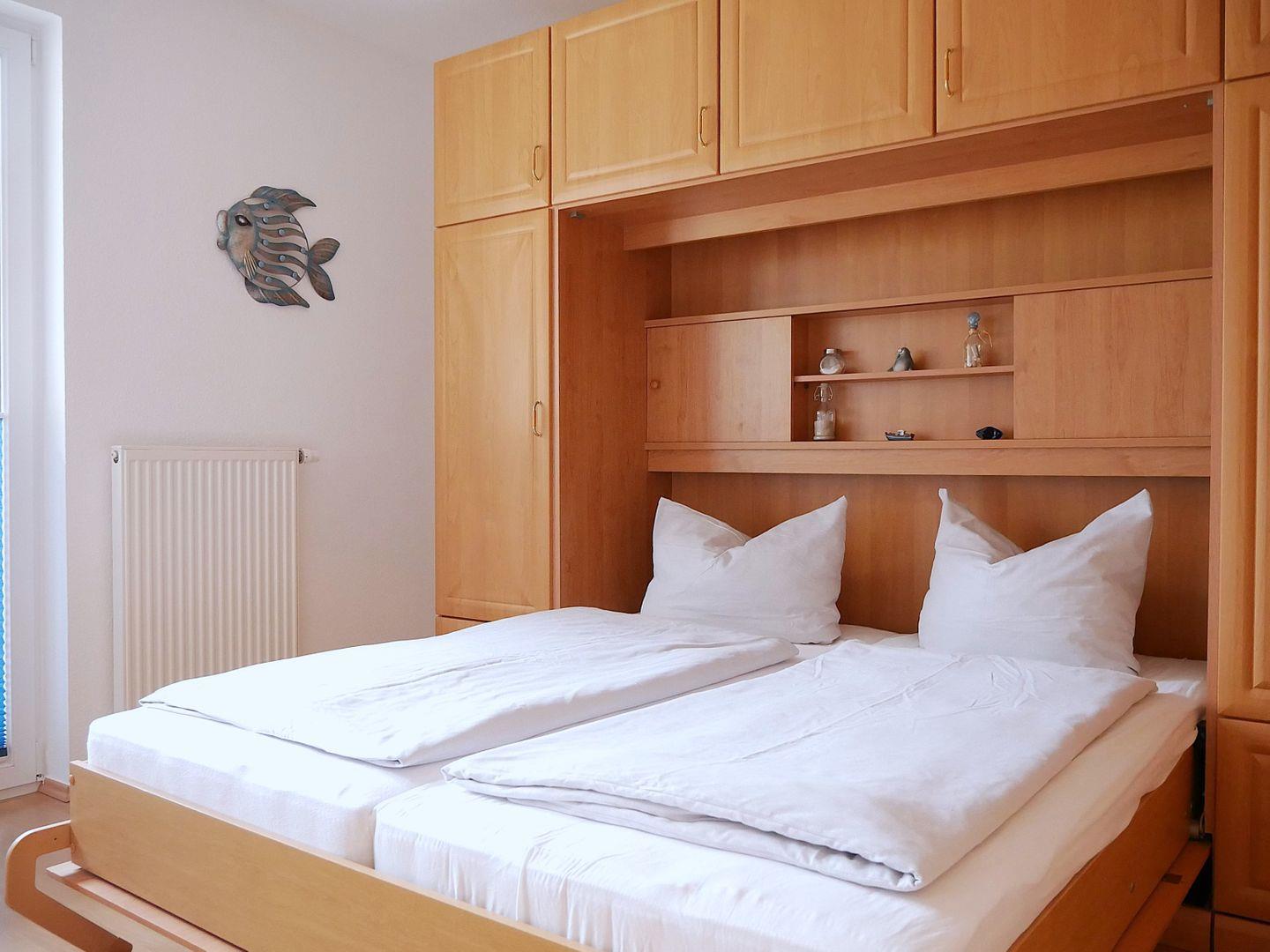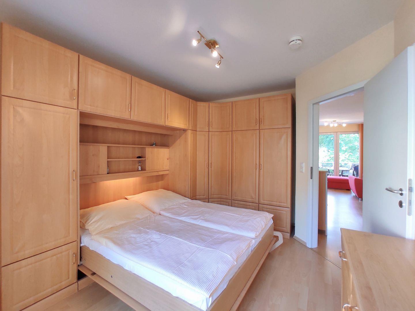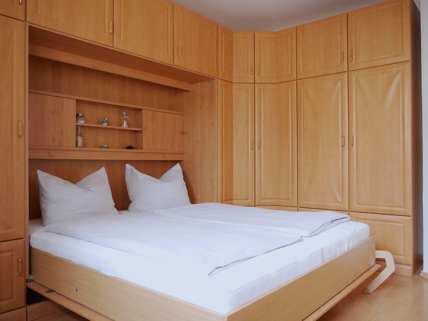 Das Schlafzimmer ist mit einem praktischen Schrankbett ausgestattet, das tagsüber Platz schafft und nachts für erholsamen Schlaf sorgt. Diese Raumgestaltung ermöglicht es Ihnen, den Raum optimal zu nutzen.