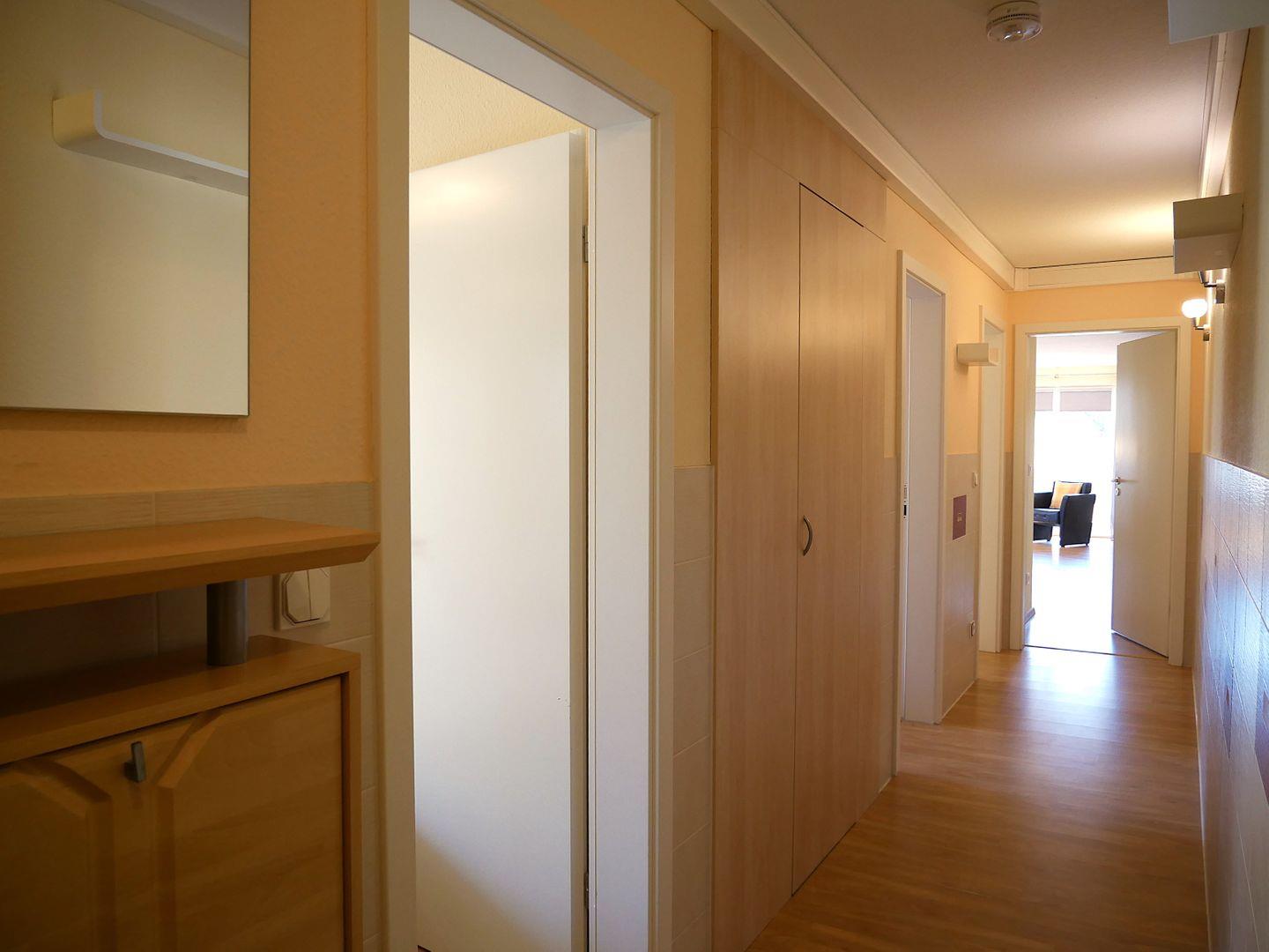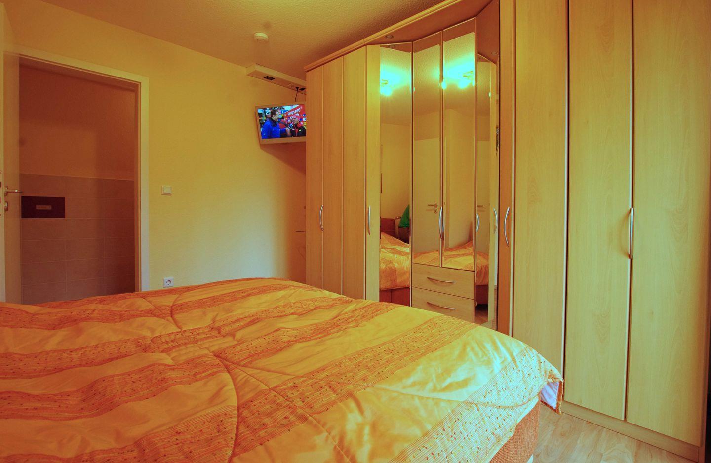 In der Wohnung erwarten Sie zwei gemütliche Schlafzimmer. Im ersten Schlafzimmer finden Sie ein komfortables Doppelbett, einen Fernseher und einen großzügigen Kleiderschrank, um Ihre Urlaubsgarderobe ordentlich zu verstauen. Im zweiten Schlafzimmer steht ein praktisches Klappbett für 2 Personen zur Verfügung, sowie ein weiterer Kleiderschrank für Ihre persönlichen Sachen.