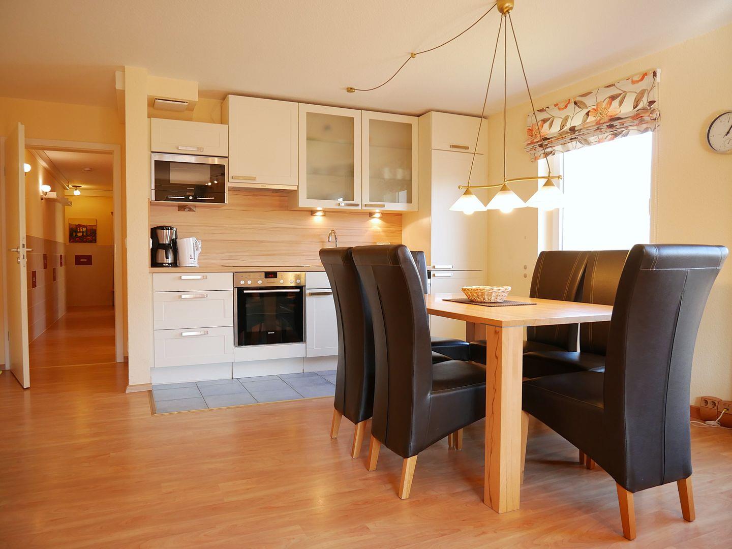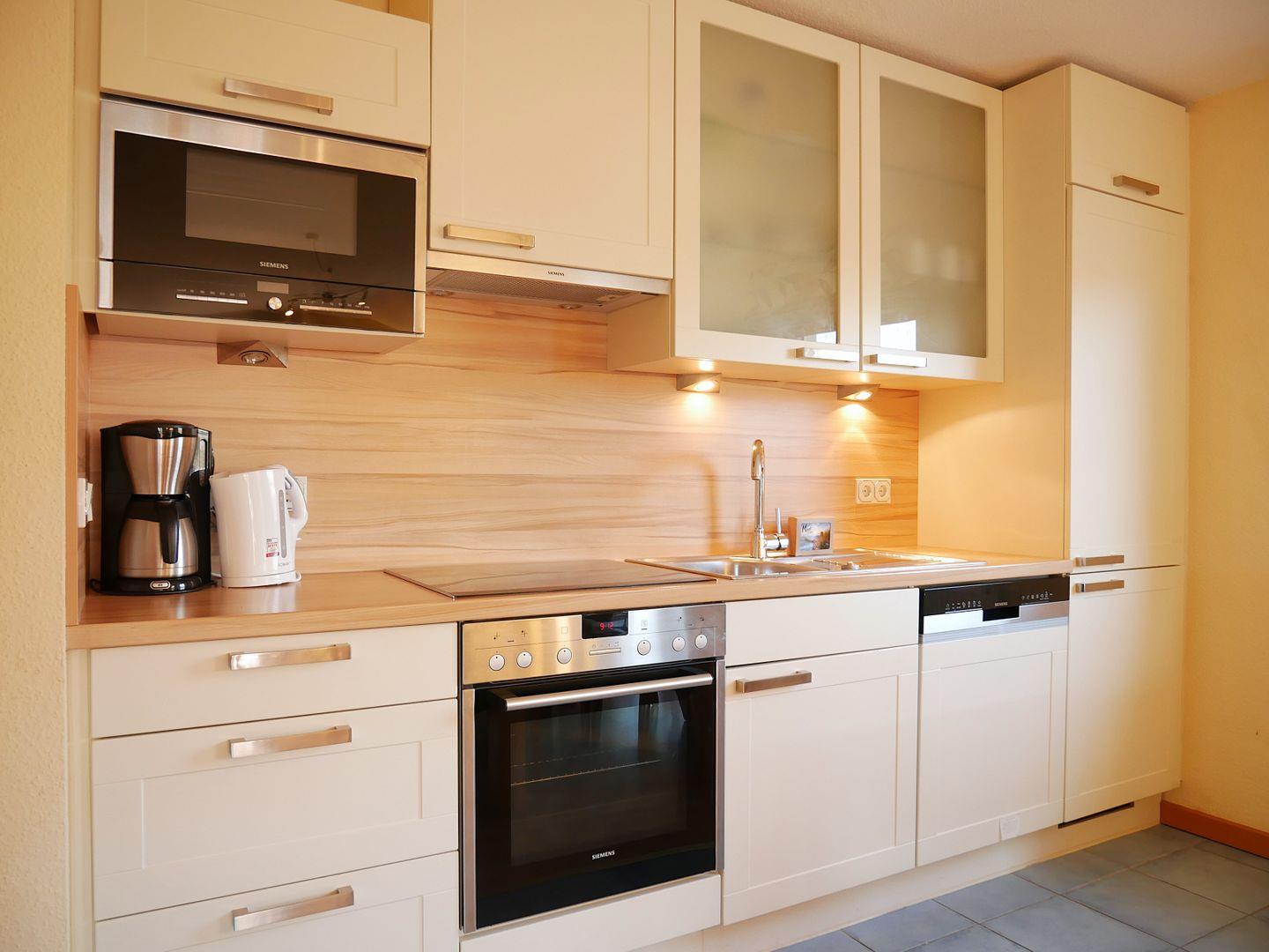 Die offene Küche ist bestens ausgestattet, um alle Ihre kulinarischen Bedürfnisse zu erfüllen. Hier finden Sie einen Herd inklusive Backofen, einen großzügigen Kühlschrank mit Gefrierfach, eine Spülmaschine, eine Mikrowelle, einen Toaster, eine Kaffeemaschine und eine breite Palette weiterer Küchenutensilien, die Ihnen das Kochen erleichtern.
