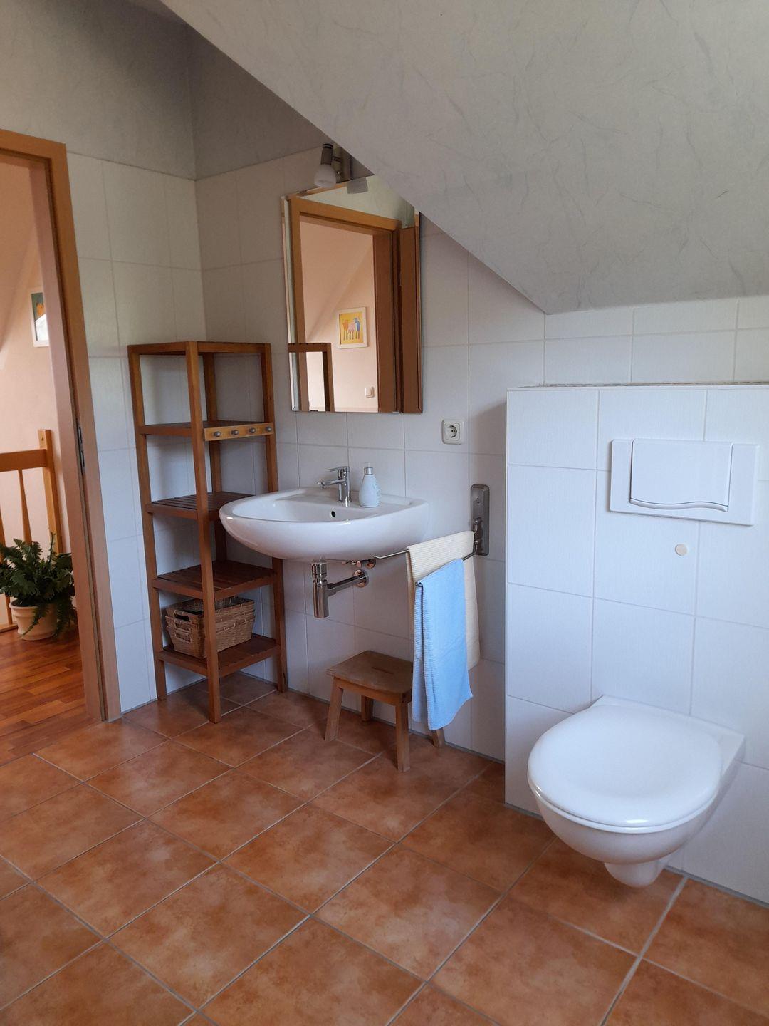 Das Badezimmer ist mit einer Dusche mit tiefem Einstieg, Waschtisch und WC ausgestattet. Im Erdgeschoss befindet sich ein weiteres Gästebad mit Waschtisch und WC.