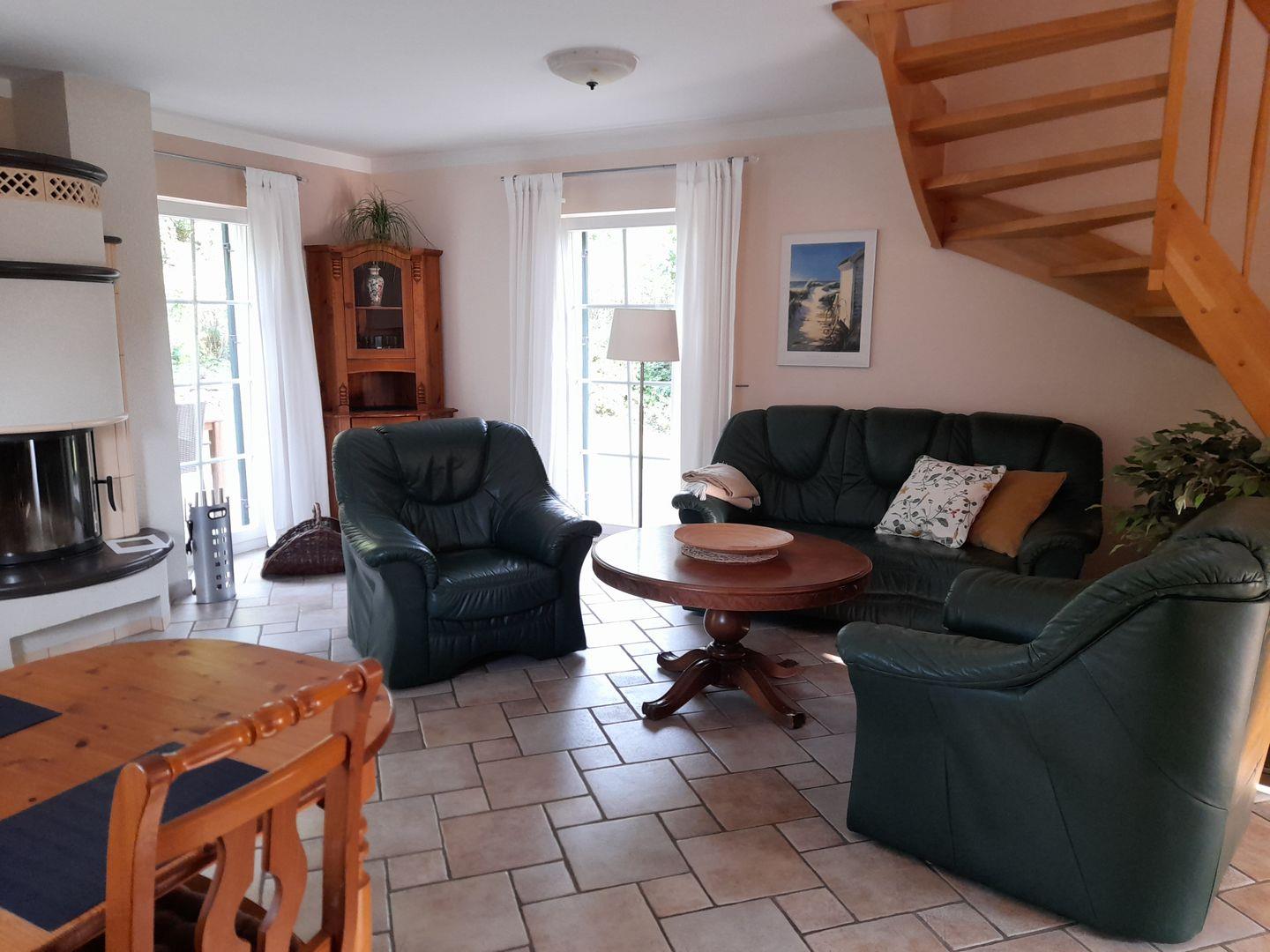 Ein gemütlicher Wohn- und Essbereich in der unteren Etage bietet Ihnen eine komfortable Sofaecke mit TV-Gerät. An den kälteren Tagen sorgt der Kamin für eine angenehme Wärme und Wohlfühlatmosphäre. Ihre Mahlzeiten nehmen Sie entweder am großzügigen Esstisch oder auf der möblierten Terrasse, mit Blick ins Grüne ein.
