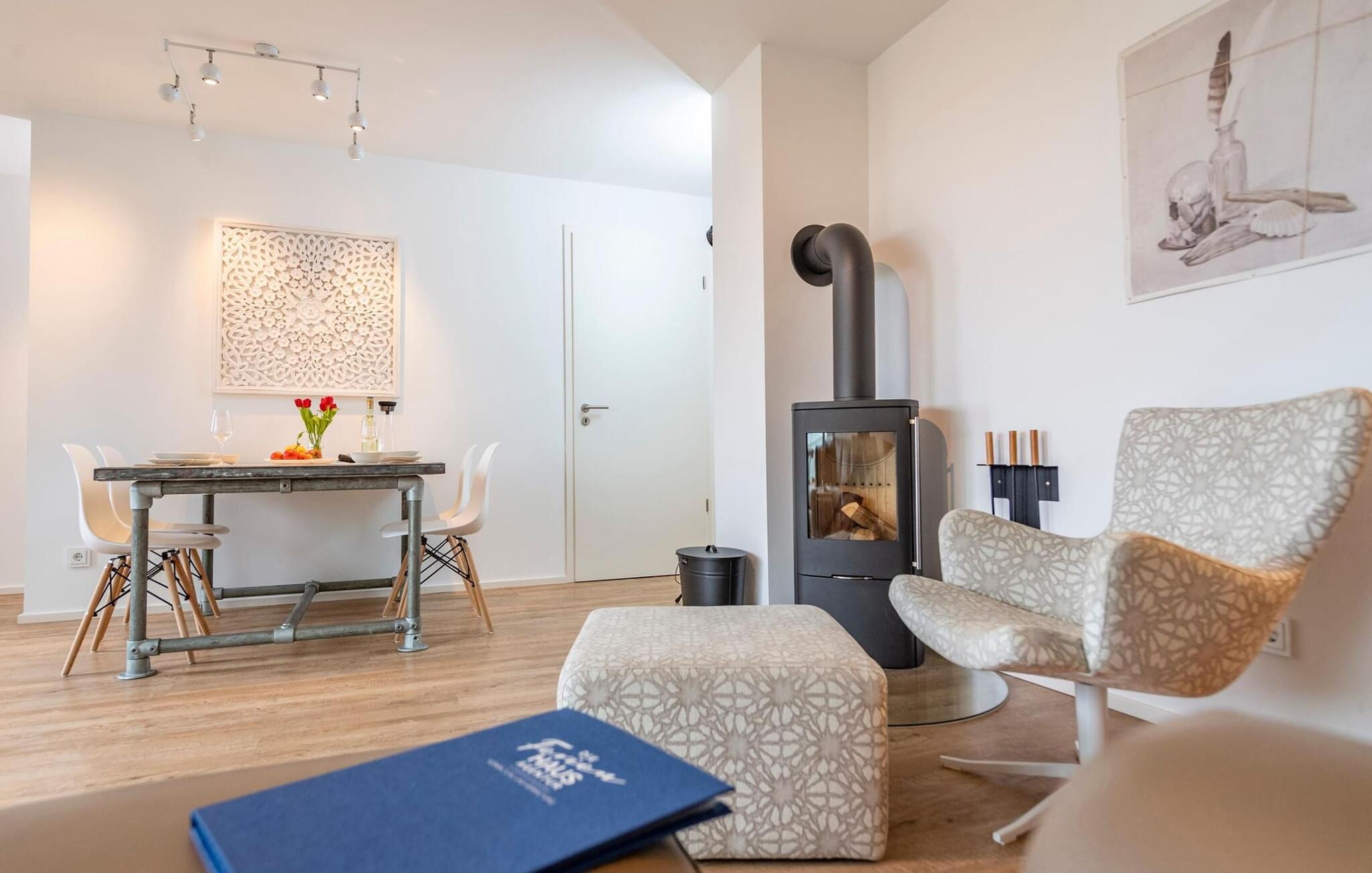 Sehr gemütlich gestaltet sich der Wohn-/Essbereich: Auf der komfortablen Sitzlandschaft oder am großen Esstisch sorgen das knisternde Kaminfeuer und die Fußbodenheizung im gesamten Objekt zu jeder Jahreszeit für Behaglichkeit.