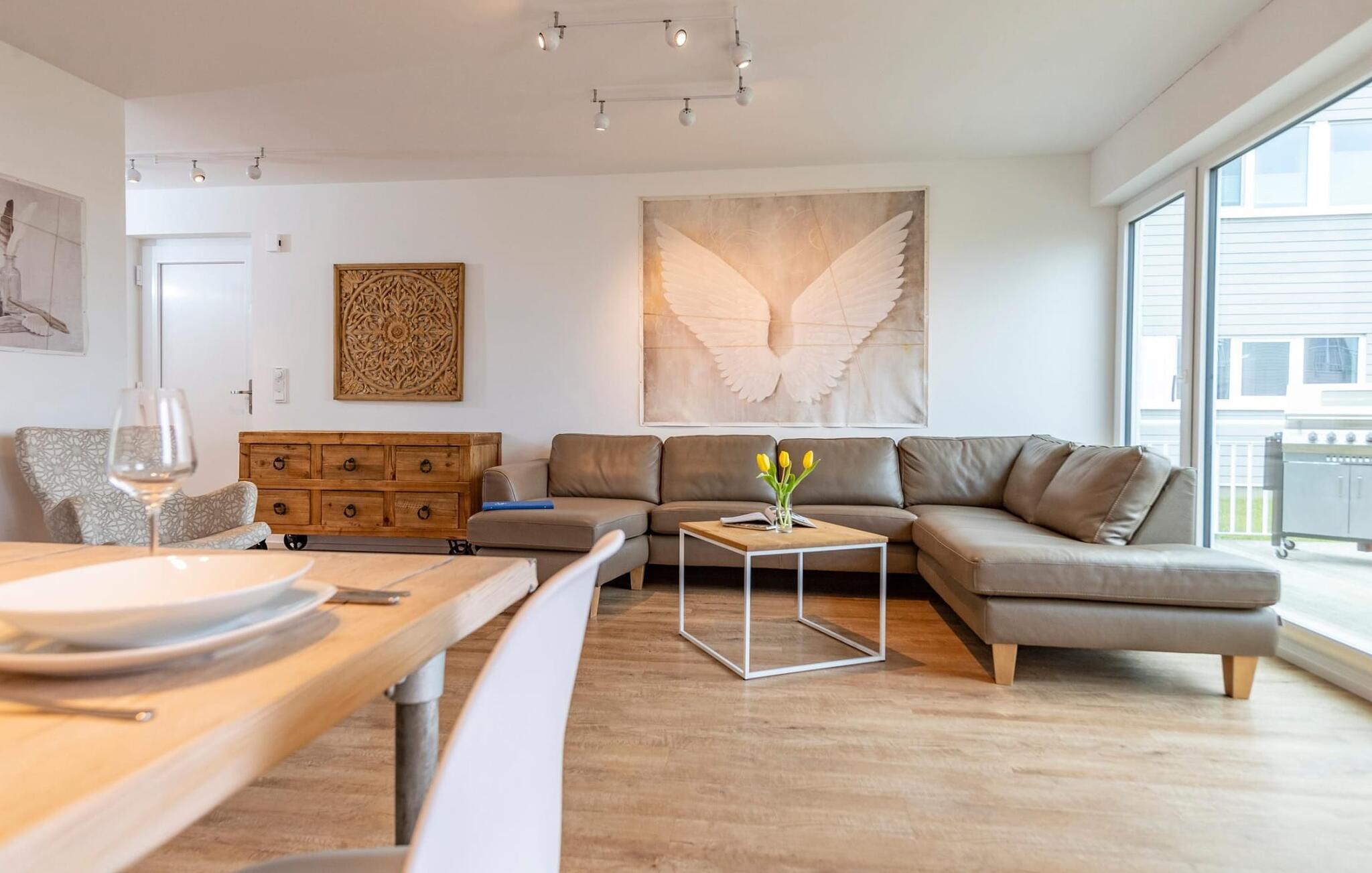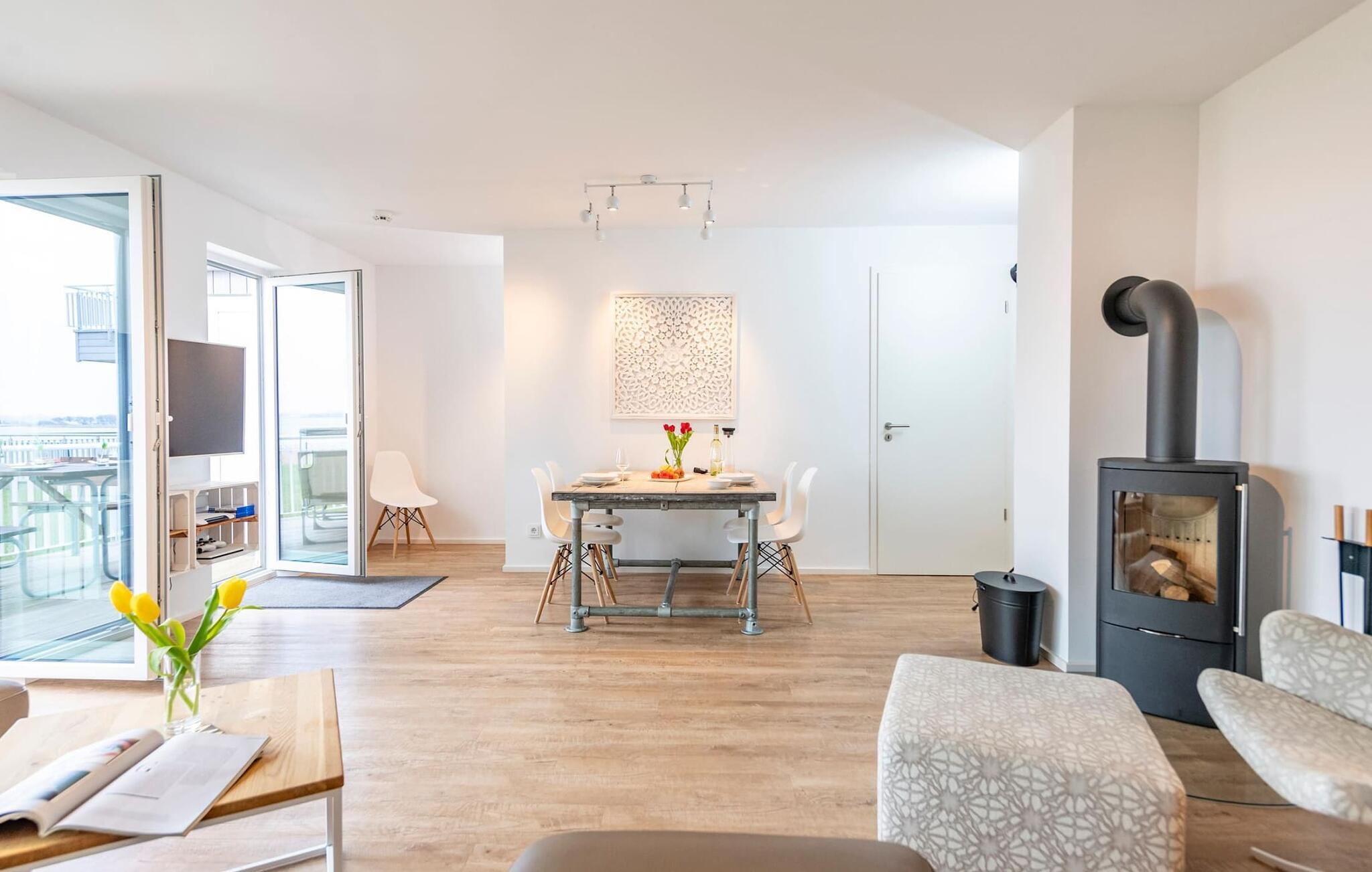 Das Ferienhaus erstreckt sich über drei Ebenen. Lichtdurchflutet gestaltet sich der Wohn- /Essbereich im Erdgeschoss des Ferienhauses. Durch eine große Fensterfront fällt der Blick über die angrenzende Terrasse auf das idyllische Schleiufer und die Schleisoweit das Auge reicht. Was sich vor der Tür abspielt, ist ein wahres Naturspektakel: Die Ostseebrise wiegt das Schilf am Ufer sanft hin- und her, während Enten und Wildgänse munter in den Tag starten. Bei einem Kaffee auf der Terrasse sorgen Segelschiffe am Horizonz für das perfekte Panorama. Ob bei einem geselligen Grillabend oder entspannt mit einem Buch, die atemberaubende Kulisse direkt vor dem Haus lässt Urlaubsherzen höher schlagen.