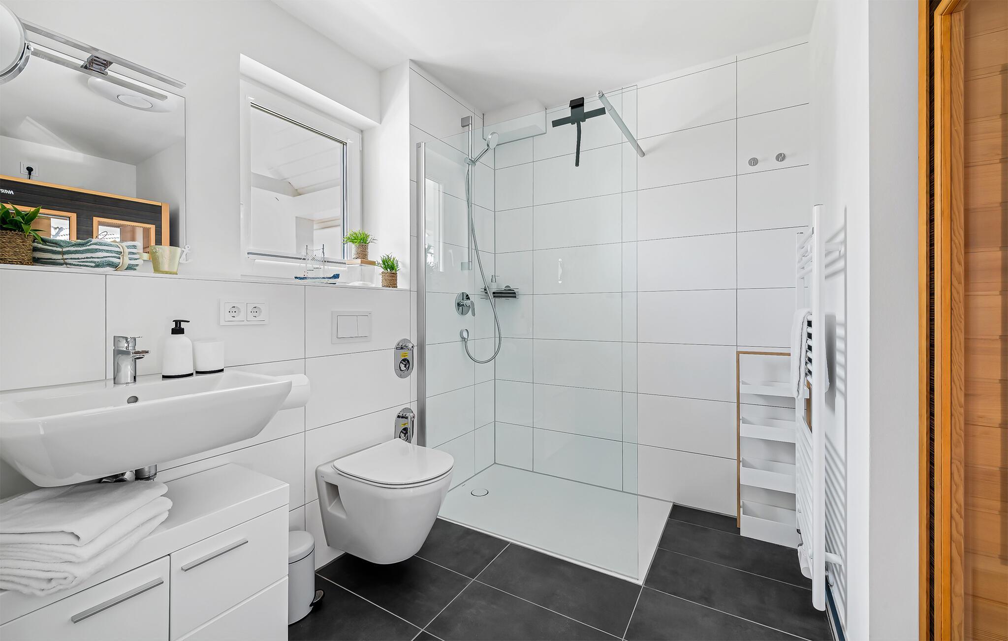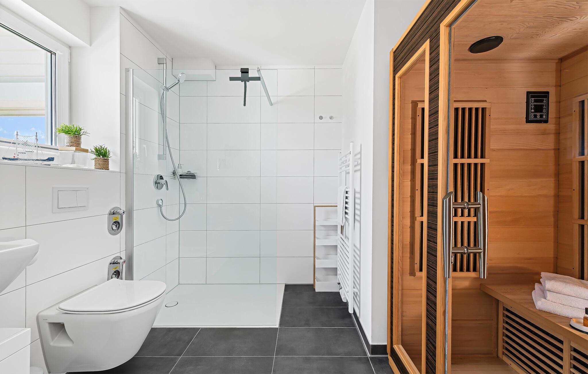 Nach einem trubeligen Urlaubstag sorgt das Bad mit bodengleicher Dusche und eine Infrarot-Sauna für wohltuenden Momenten. Schöner kann ein Urlaubstag nicht enden.