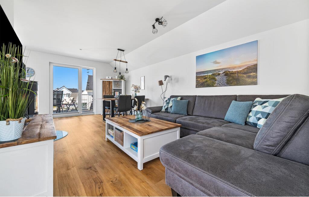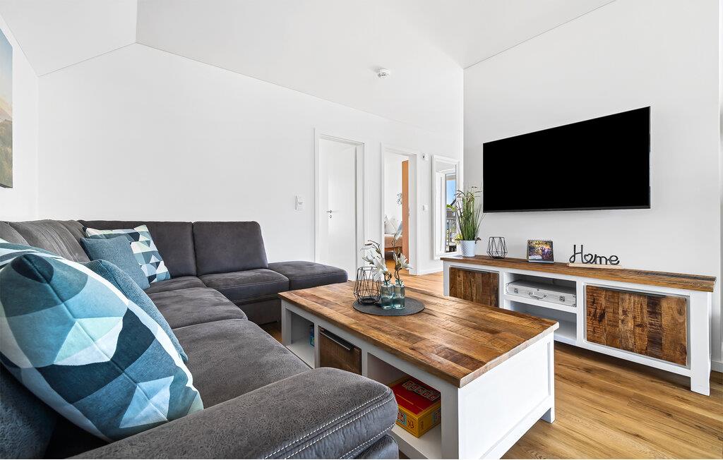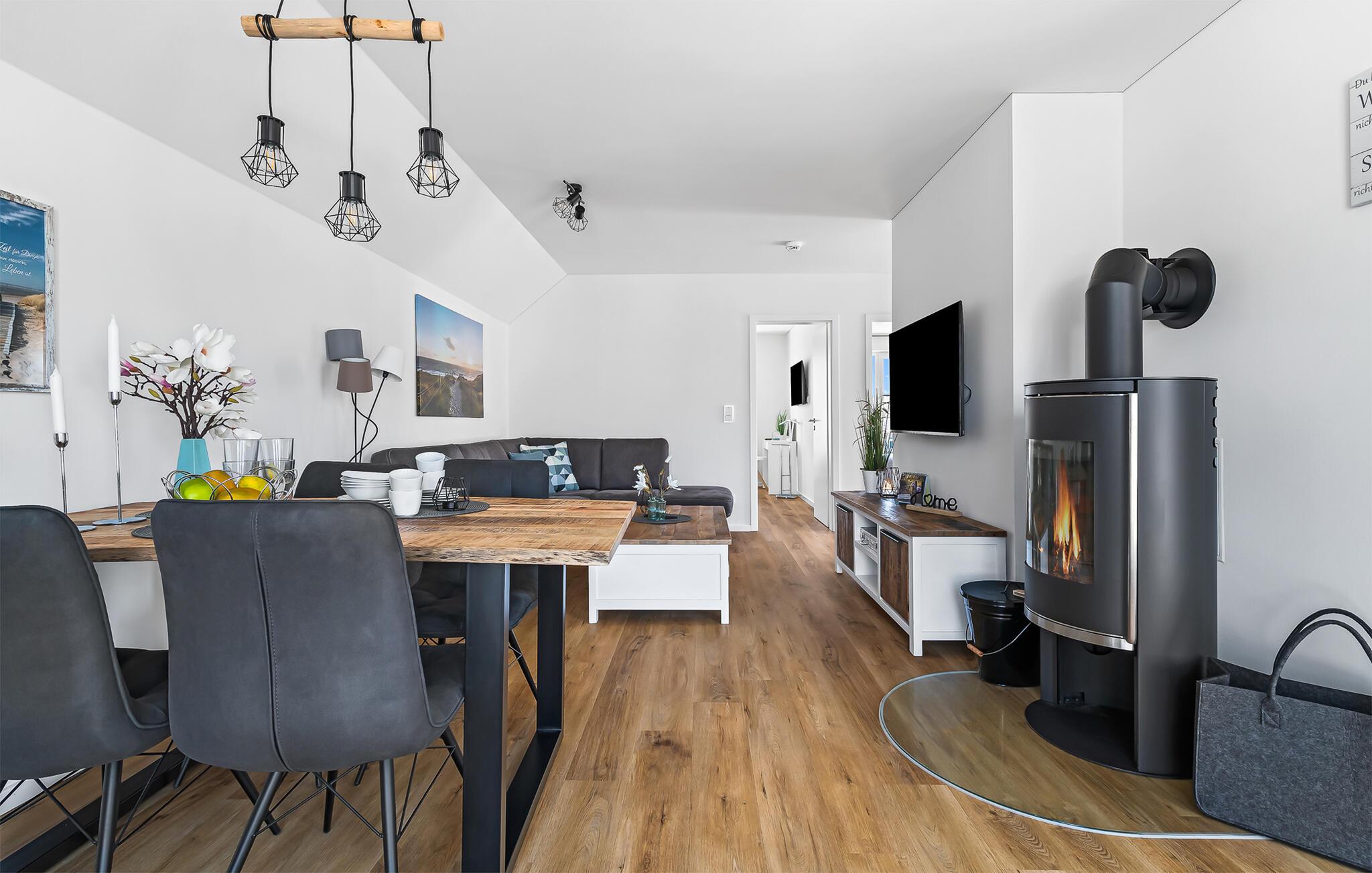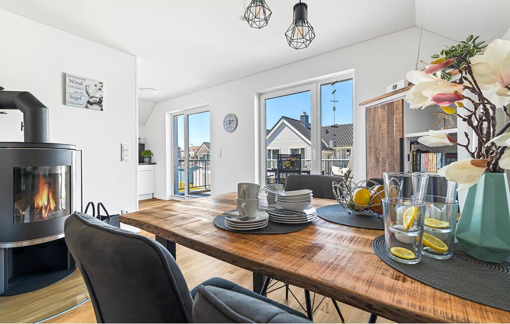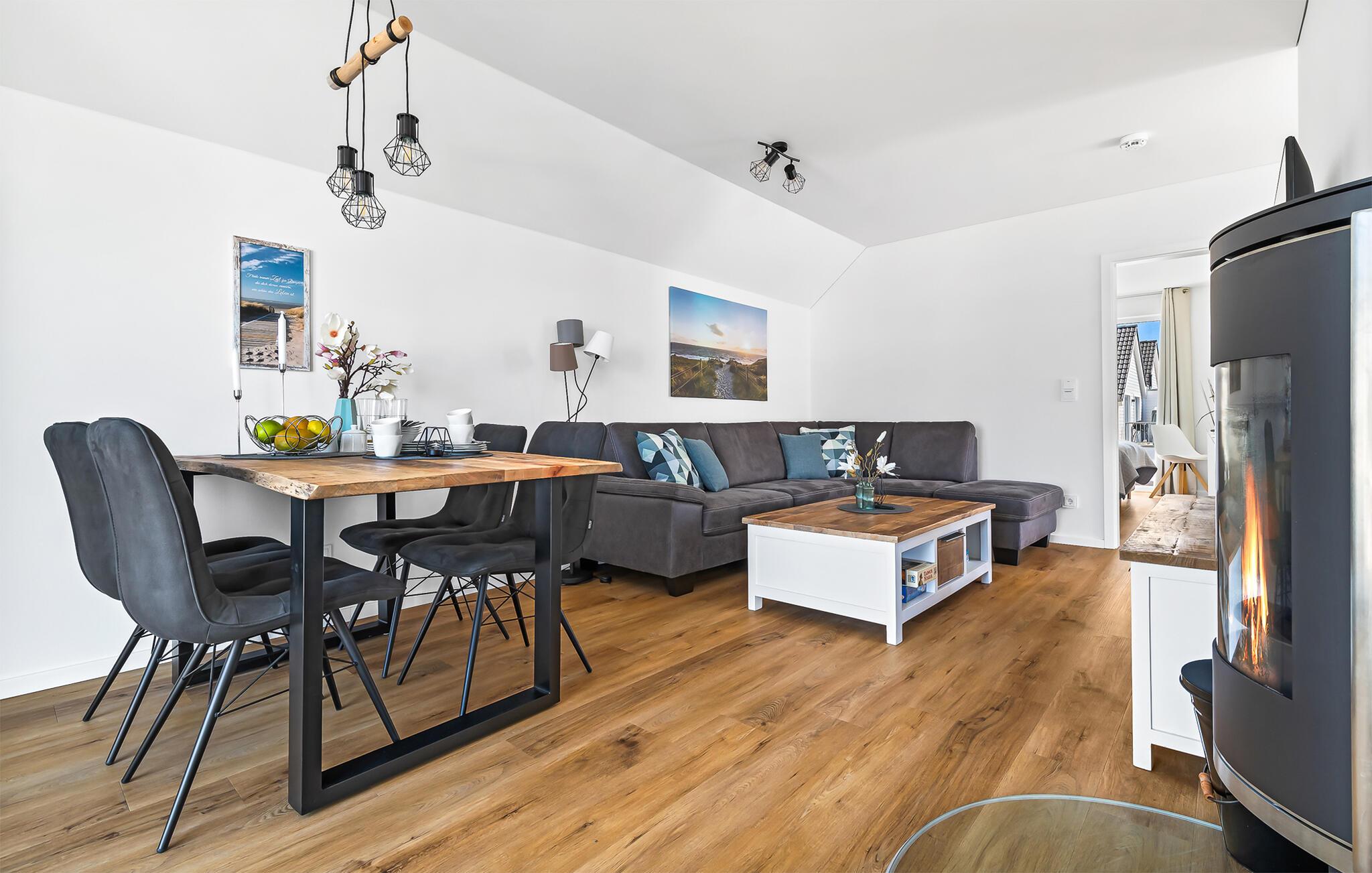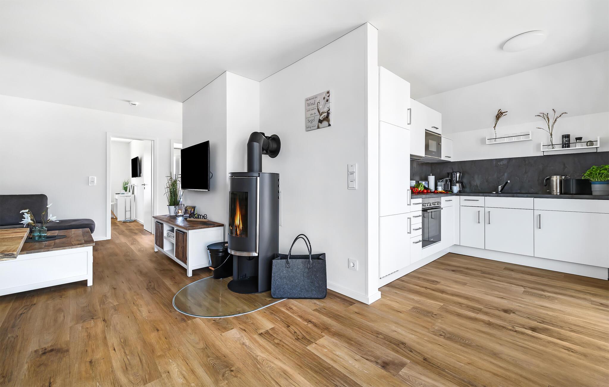 Mit seinen bodentiefen Fensterfronten und der angrenzenden großen Terrasse ist der offene Wohn-/Essbereich das Herz der Wohnung. Auf der gemütlichen Wohnlandschaft mit einem guten Buch vor dem knisternden Kamin zu entspannen oder ein gemeinsamer Fernsehabend zu verbringen ist Entspannung und Erholung pur! Gegen eventuelle Langeweile am Abend können diverse Spielesammlungen genutzt werden, um sich die Zeit zu vertreiben. Sollte das Wetter sich einmal von der nordischen Seite zeigen, sorgt die InfrarotSauna (Wärmekabine) für ein ganz privates Wellnessfeeling.