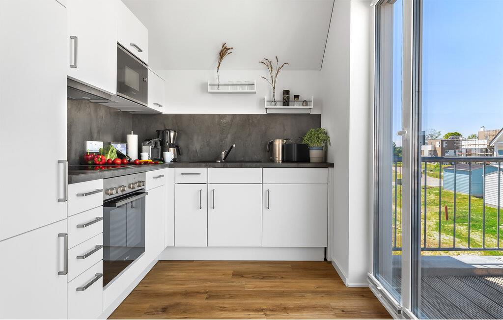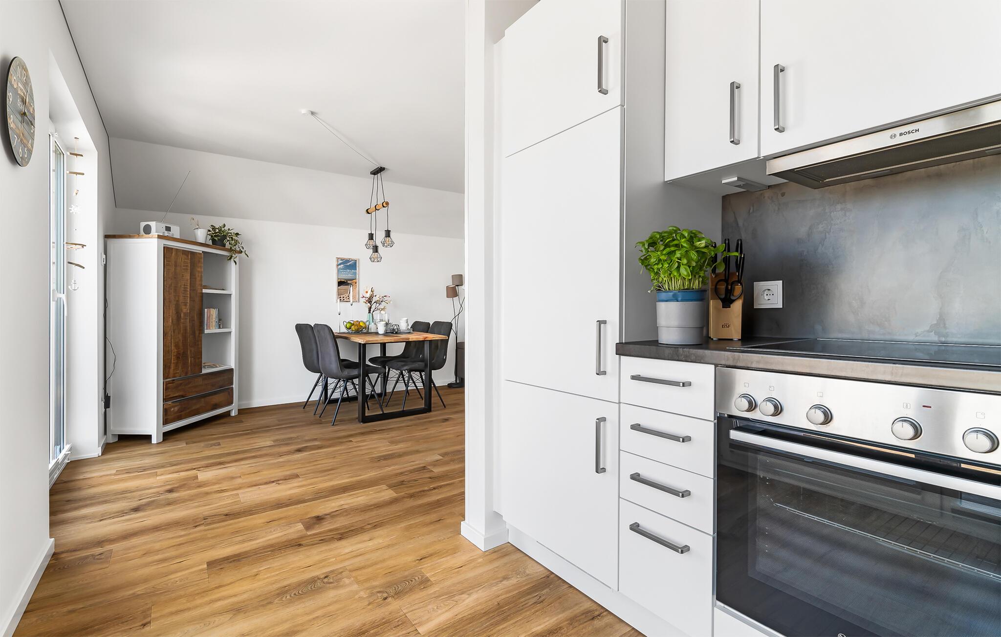 Die angrenzende offene Küche ist ideal ausgestattet und lässt Hobbykoch-Herzen höherschlagen.