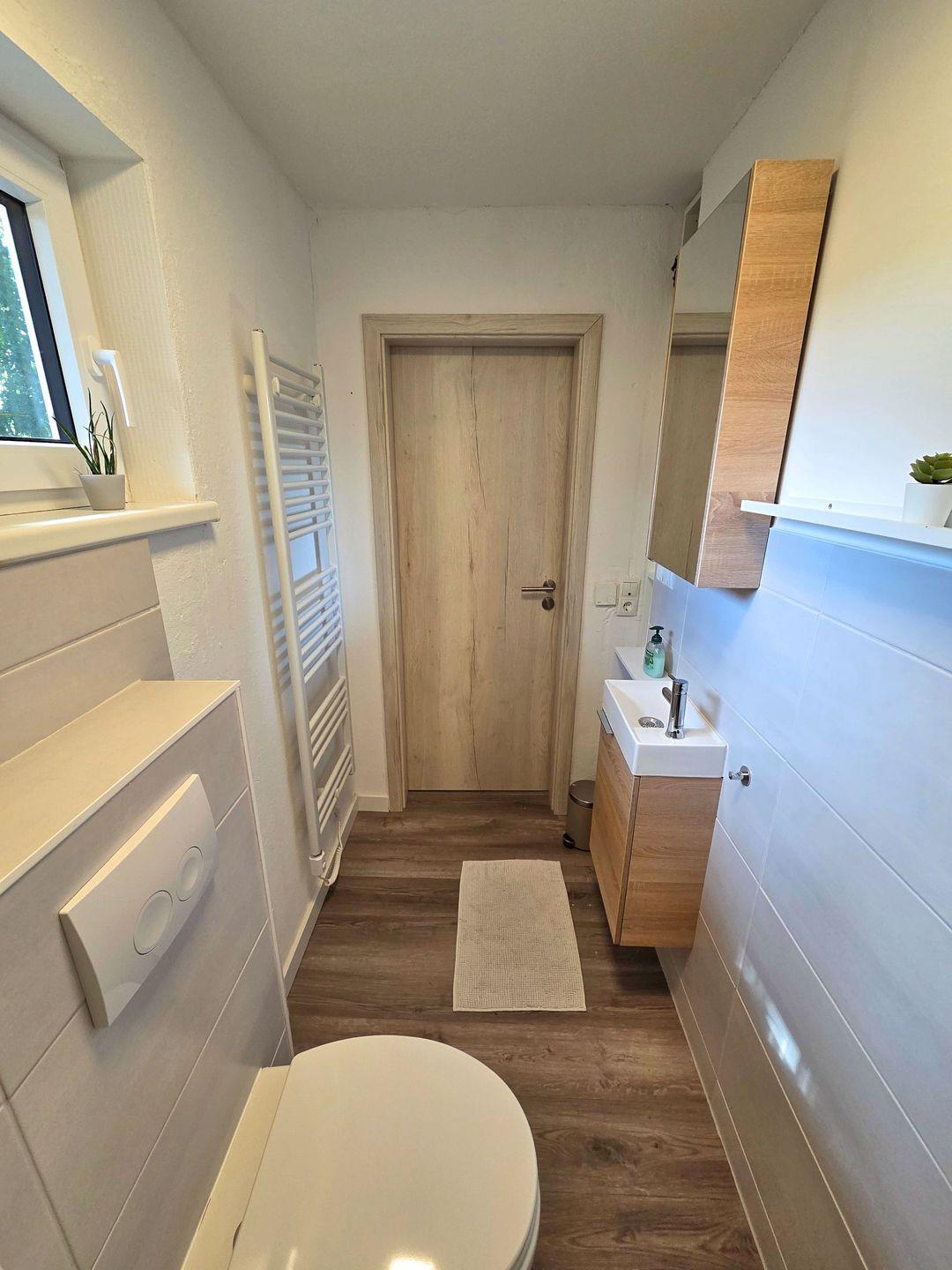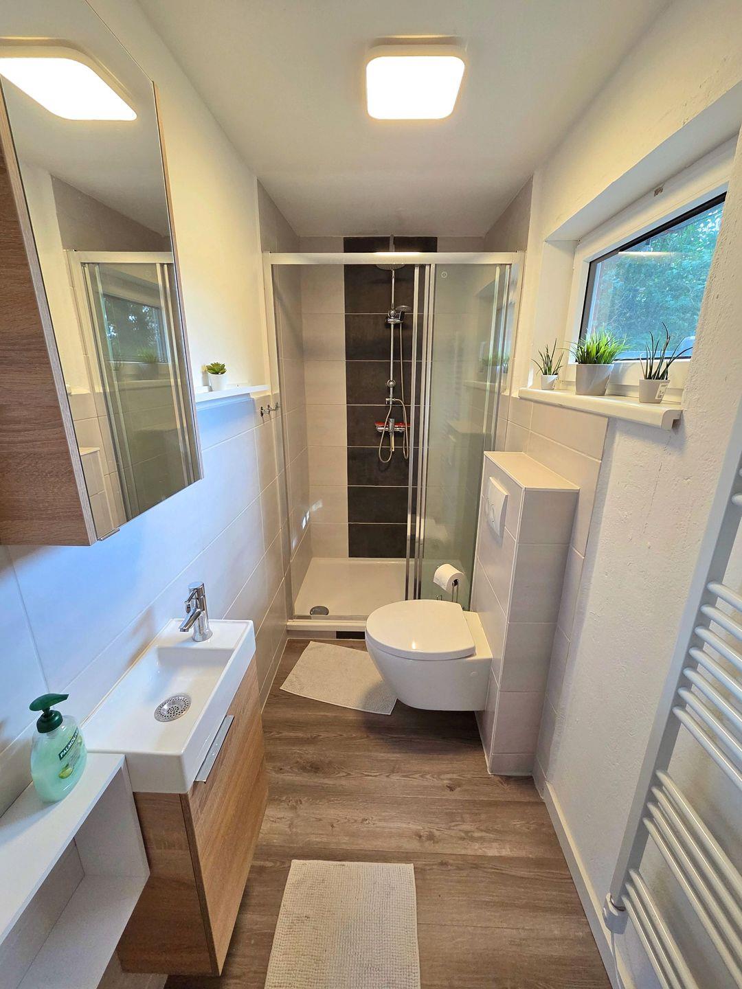 Das Badezimmer ist mit einer bodengleichen Dusche, einem Waschbecken, Spiegel, Fenster und einem WC ausgestattet.