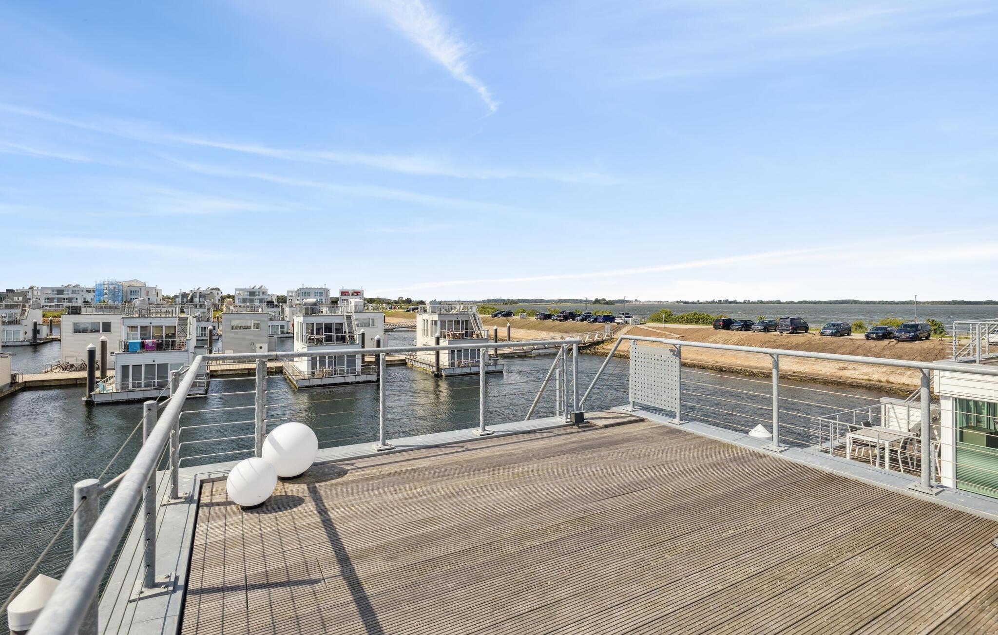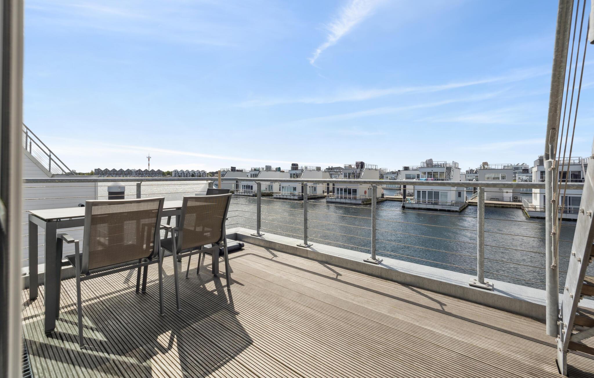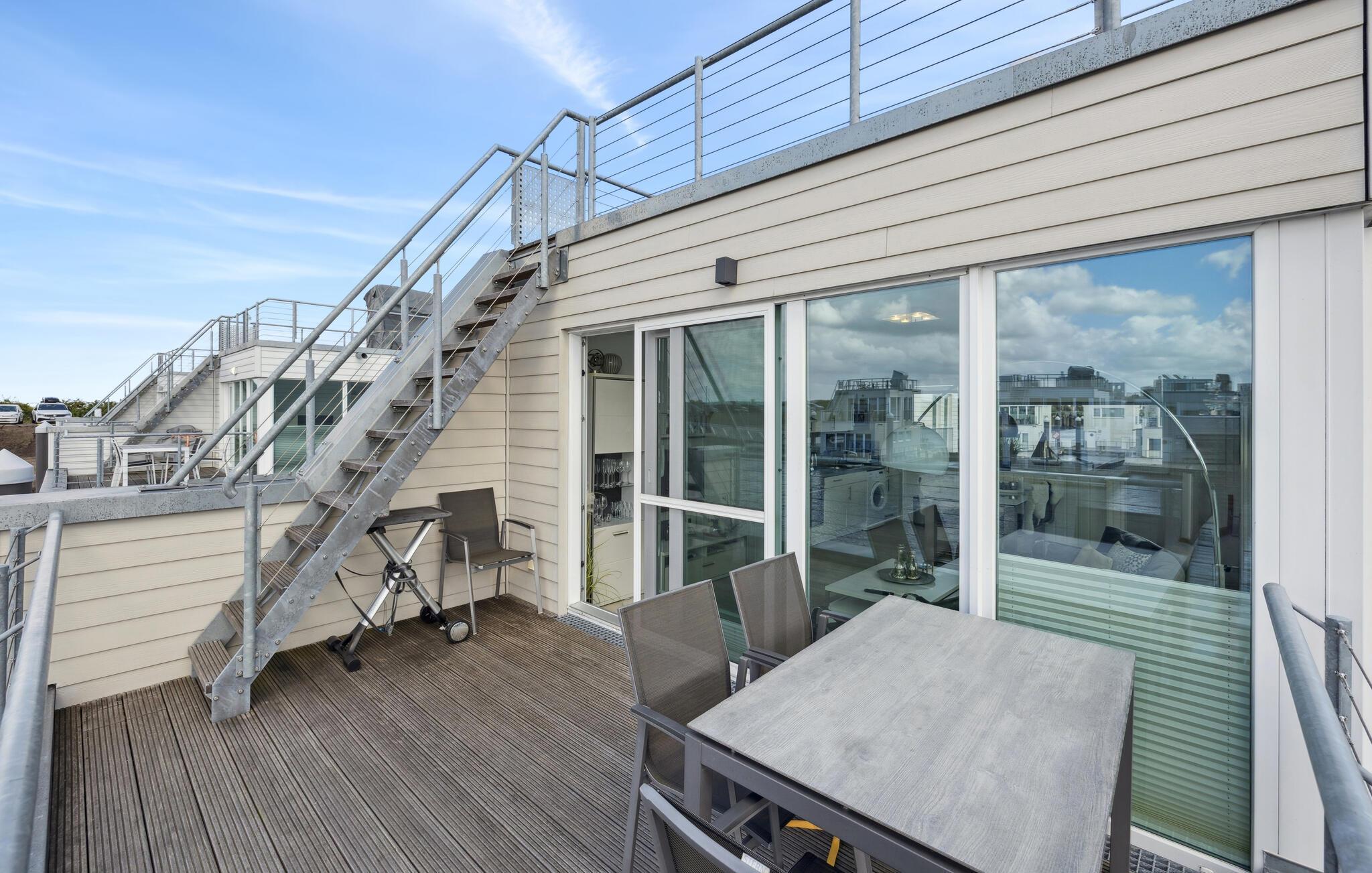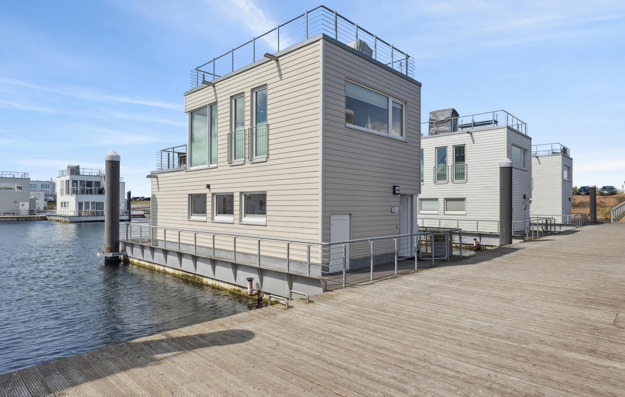 Das schwimmende Haus erstreckt sich über drei Ebenen. Im Obergeschoss befindet sich der offen gestaltete Wohn- und Essbereich mit Rundum-Wasserblick, voll ausgestatteter Wohnküche und angrenzender Terrasse. Von hier aus gelangt man auf die spektakuläre Dachterrasse mit ganztags Sonne und Blick über den Segel- und Sportboothafen, die Schlei und deren Mündung in die Ostsee. Ausgestattet mit hochwertigen Gartenmöbeln, Strandkorb, Sonnenliegen und Weber Elektrogrill bieten die Terrassen pures Urlaubsfeeling und atemberaubende Sonnenuntergänge.