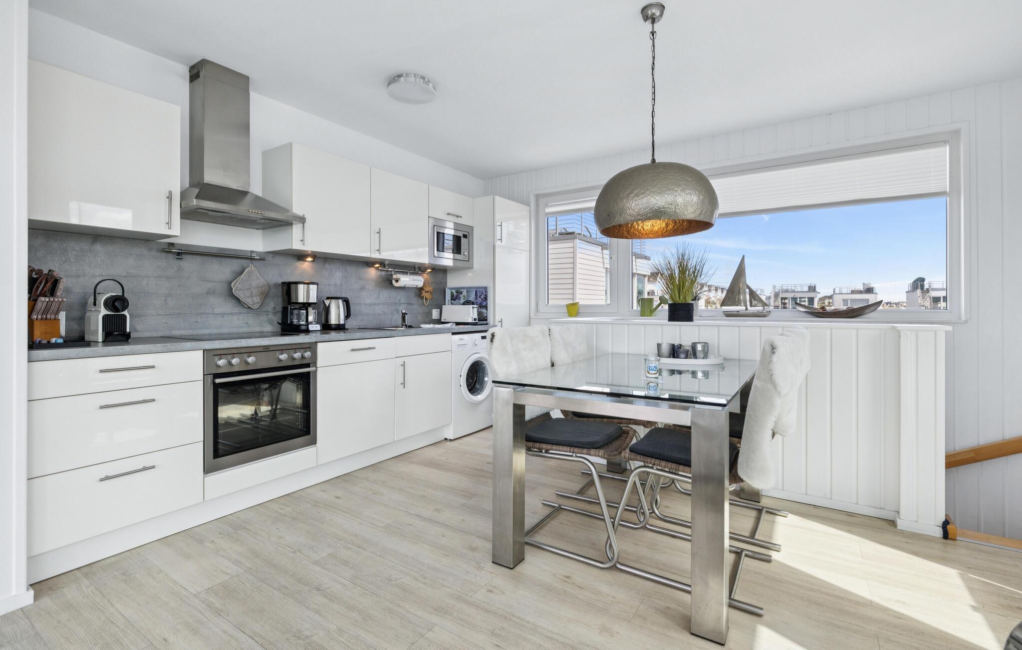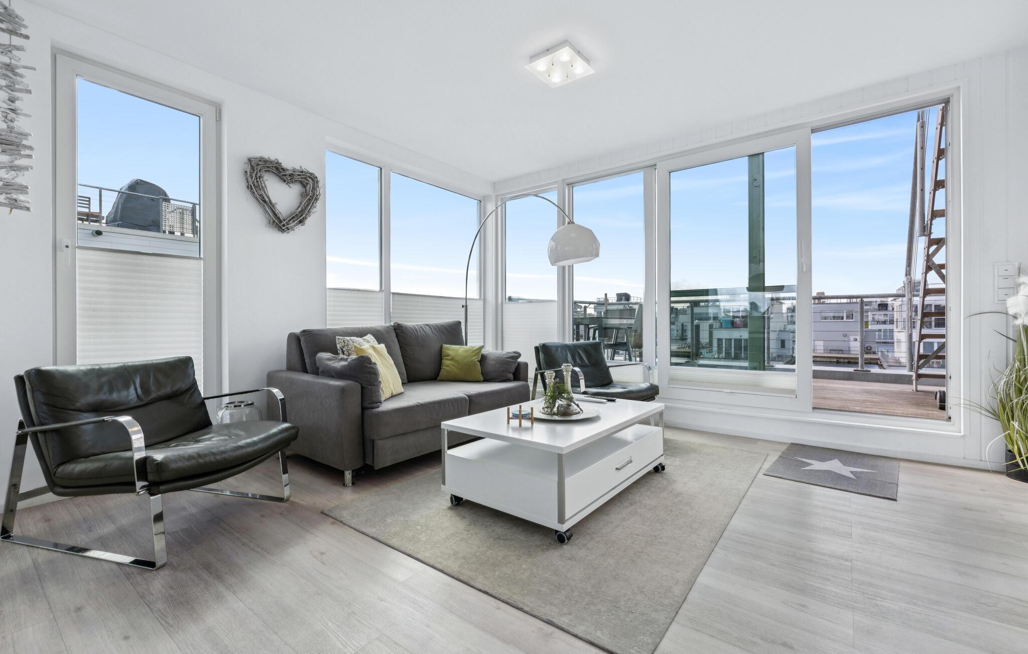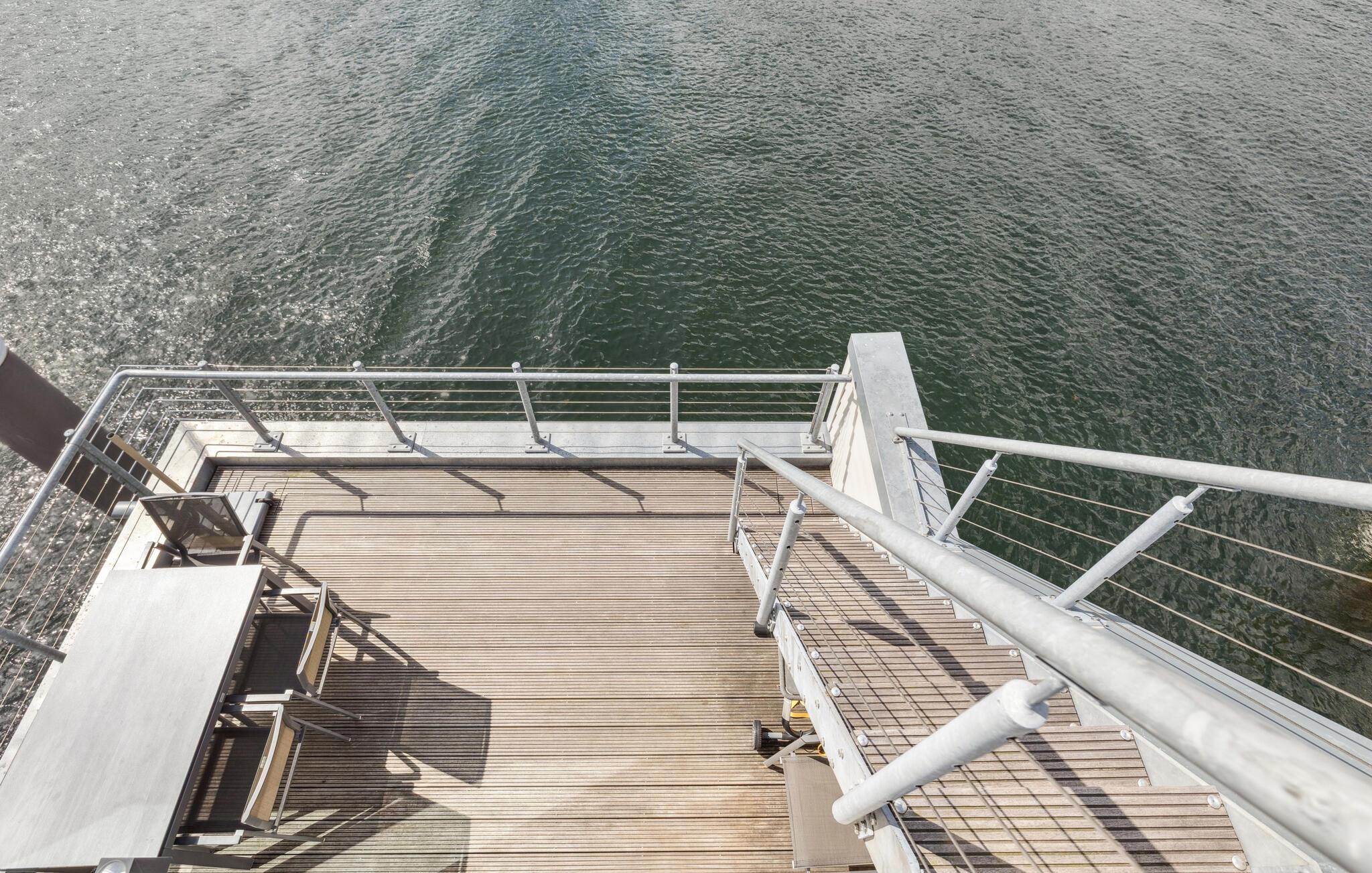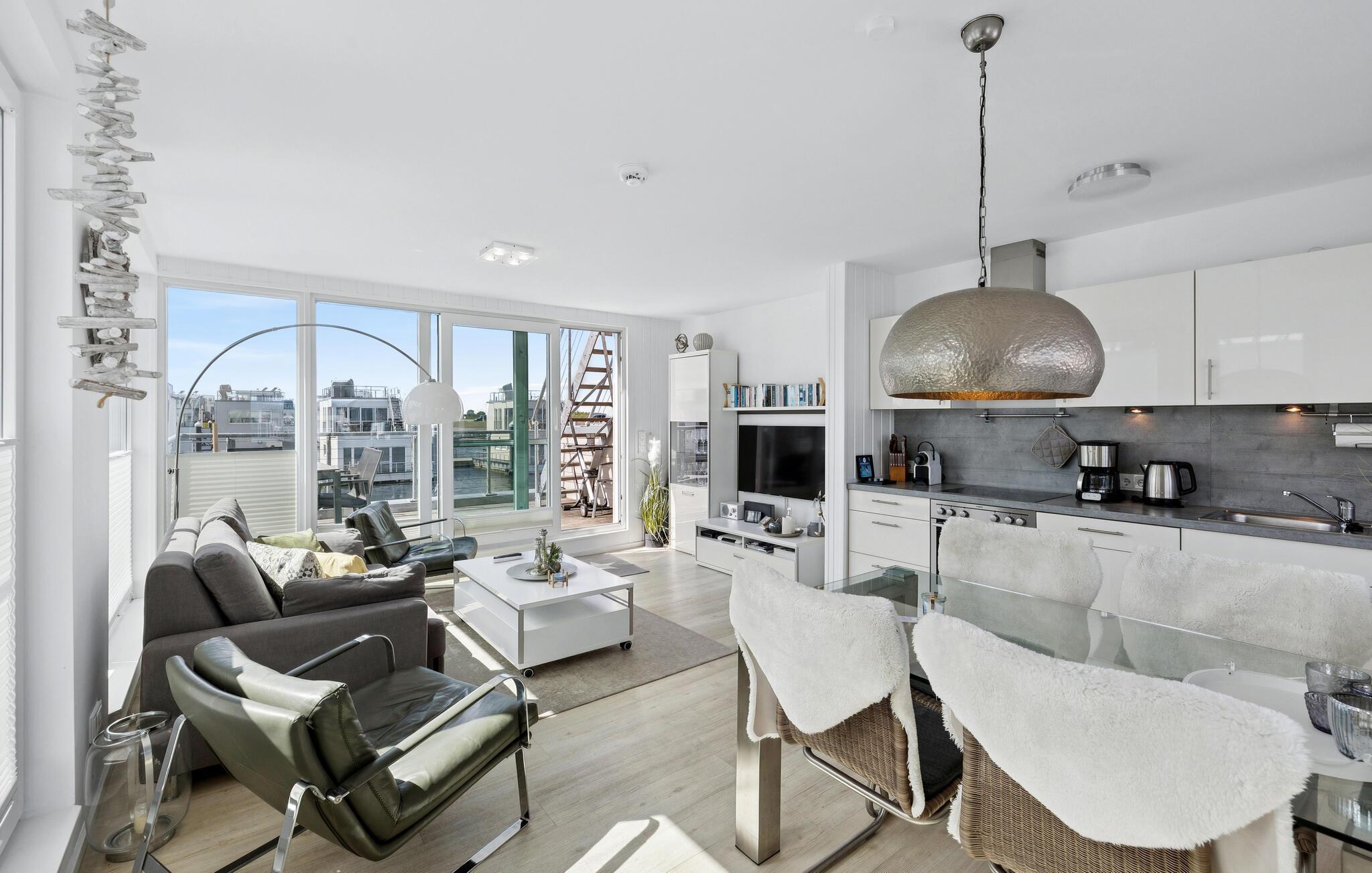 Das schwimmende Haus erstreckt sich über drei Ebenen. Im Obergeschoss befindet sich der offen gestaltete Wohn- und Essbereich mit Rundum-Wasserblick, voll ausgestatteter Wohnküche und angrenzender Terrasse. Von hier aus gelangt man auf die spektakuläre Dachterrasse mit ganztags Sonne und Blick über den Segel- und Sportboothafen, die Schlei und deren Mündung in die Ostsee. Ausgestattet mit hochwertigen Gartenmöbeln, Strandkorb, Sonnenliegen und Weber Elektrogrill bieten die Terrassen pures Urlaubsfeeling und atemberaubende Sonnenuntergänge.