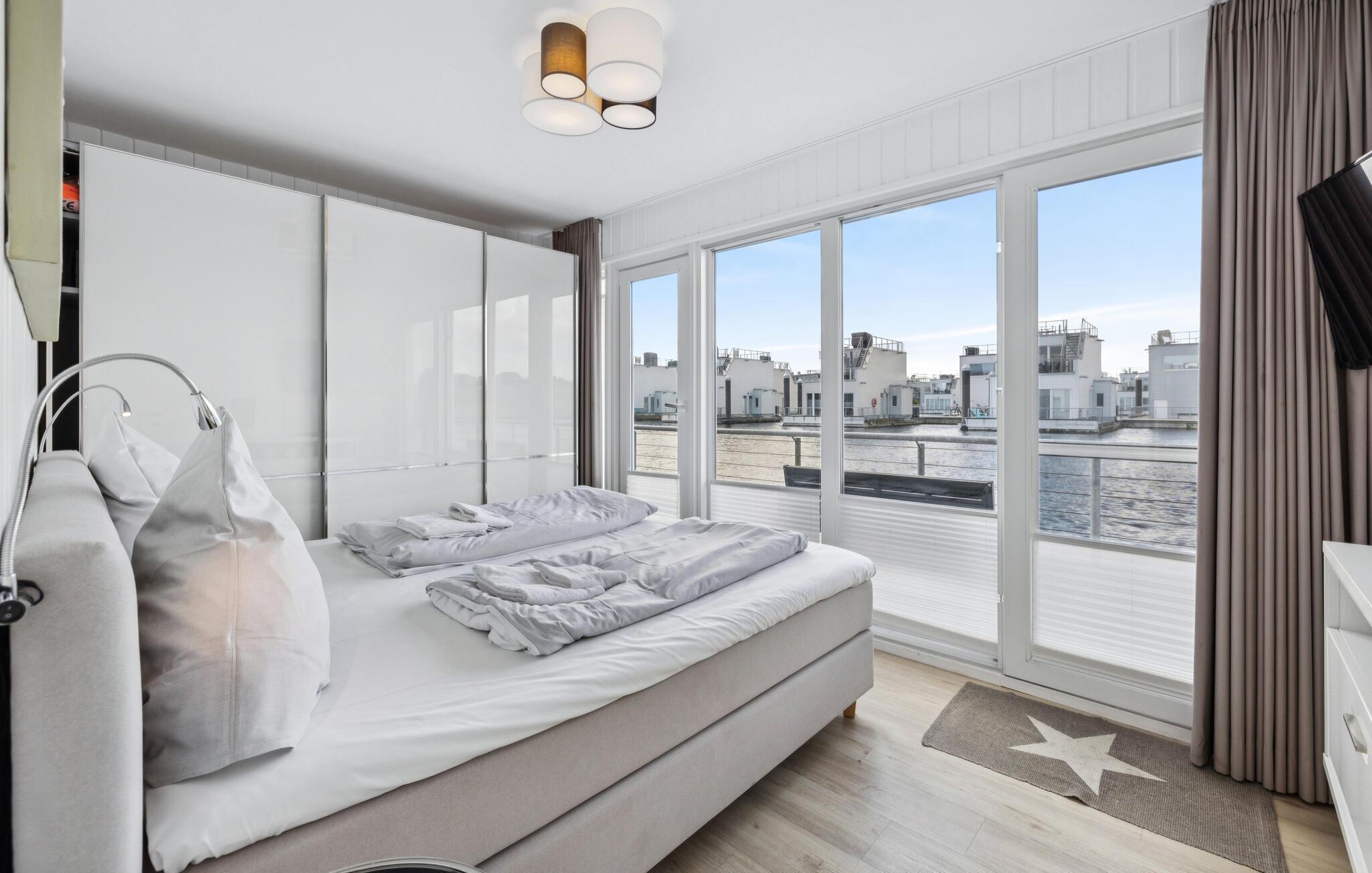 Der Ruhebereich des Hauses befindet sich im Erdgeschoss mit zwei Schlafzimmern, Badezimmer und Sauna. Das Hauptschlafzimmer punktet mit einem Boxspring Doppelbett und einer bodentiefen Panorama Fensterfront, durch welche sich die atemberaubende Wasserkulisse genießen lässt und einer angrenzenden umlaufenden Terrasse. Das zweite Schlafzimmer verfügt über zwei einzelne Boxspringbetten. Beide Schlafzimmer bieten einen Flatscreen-TV.