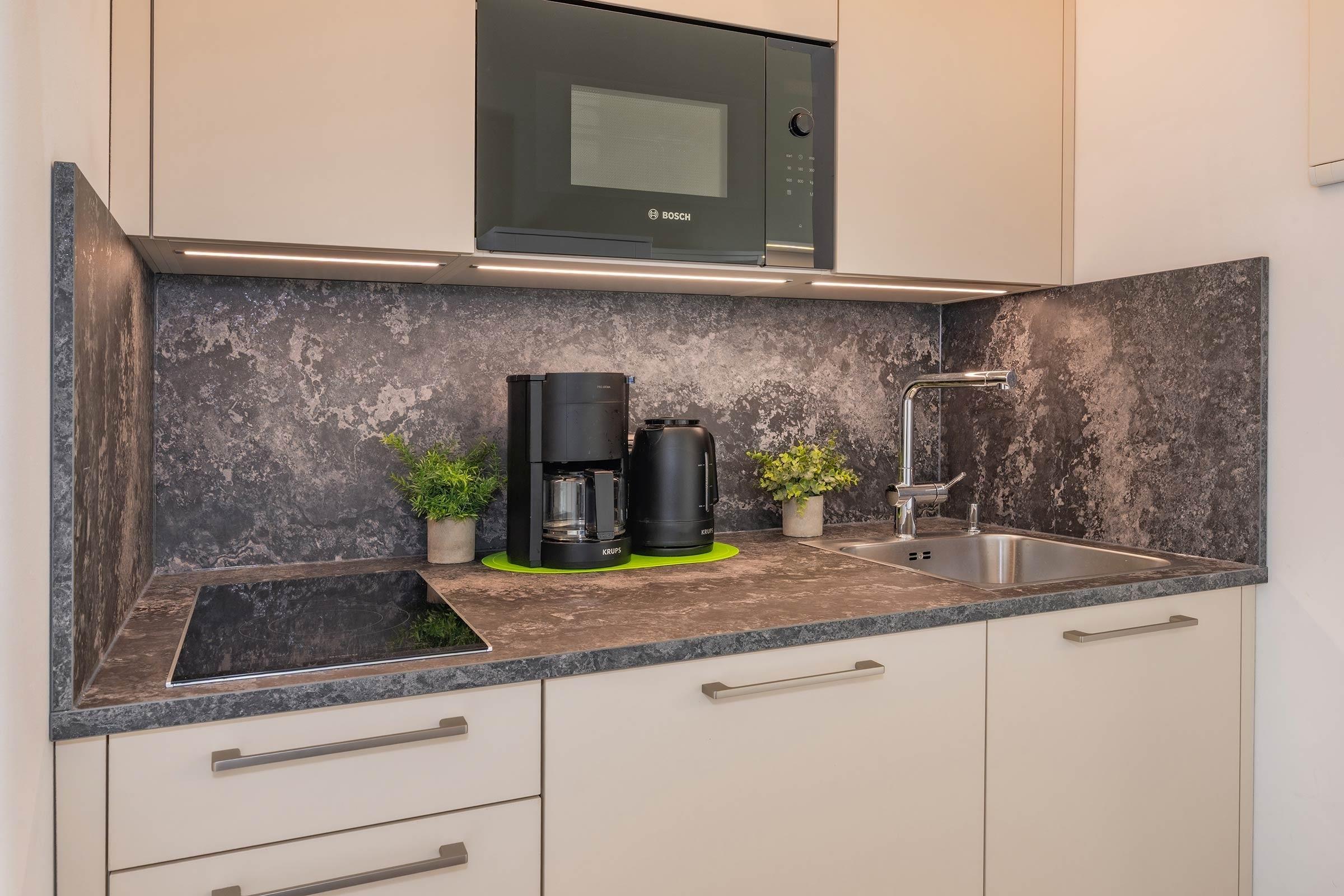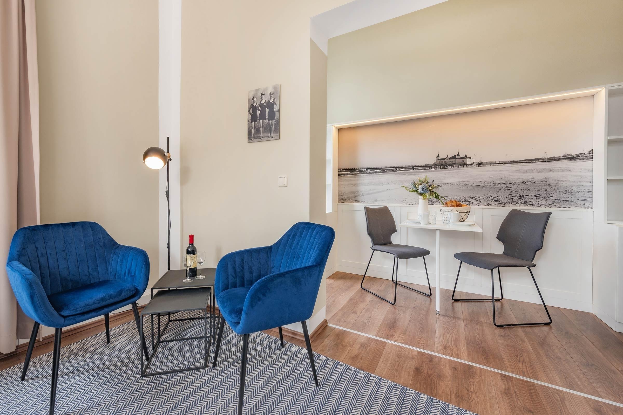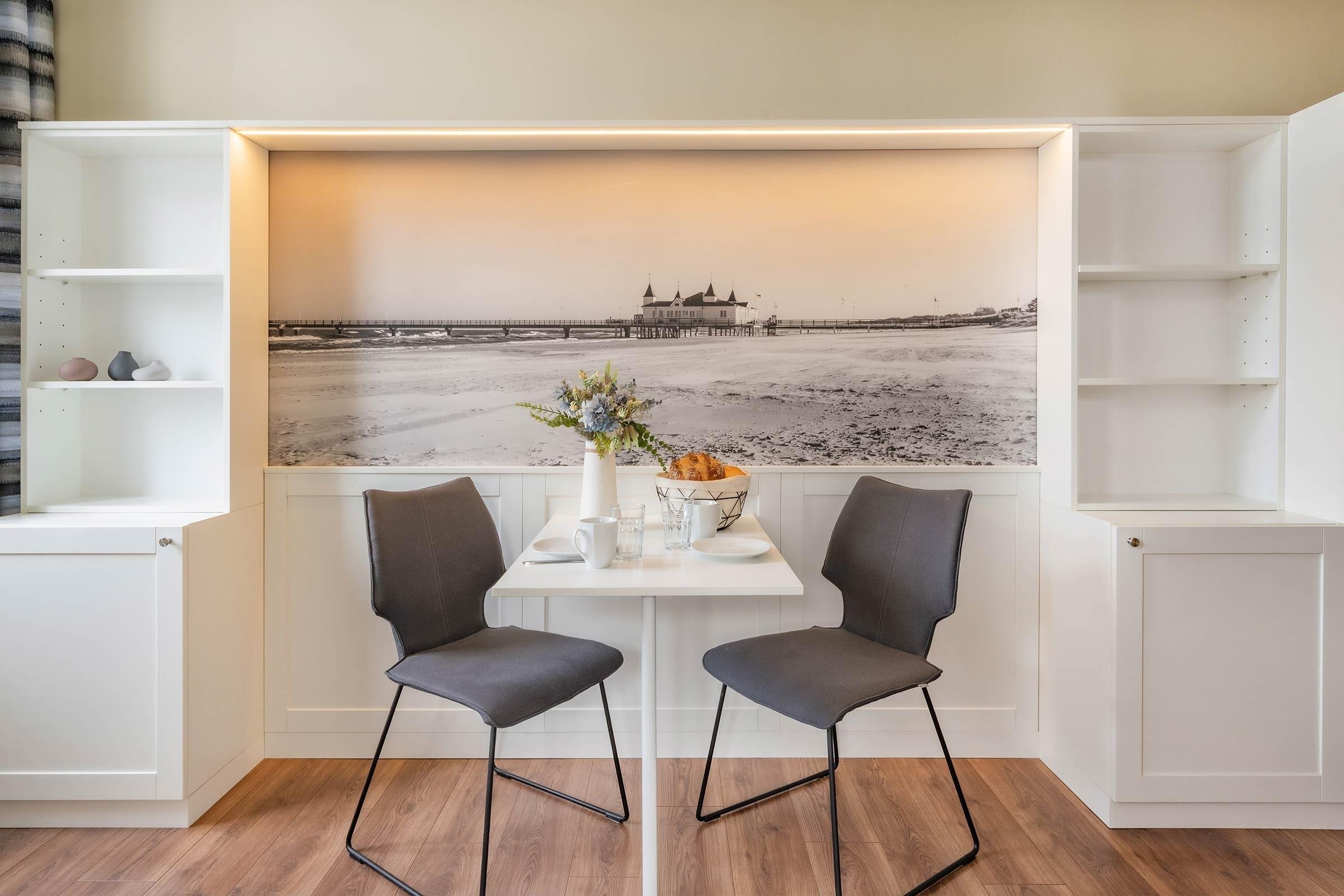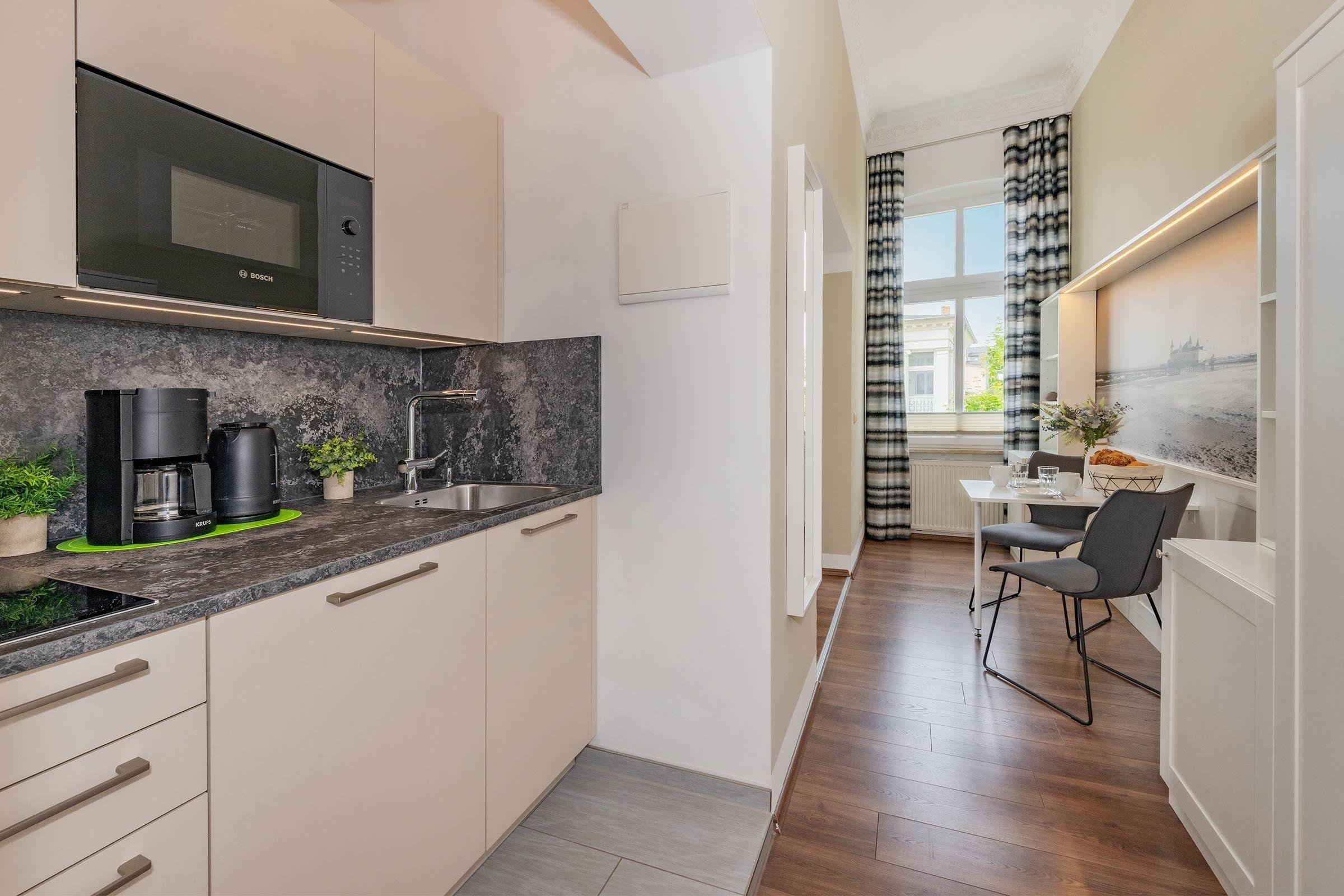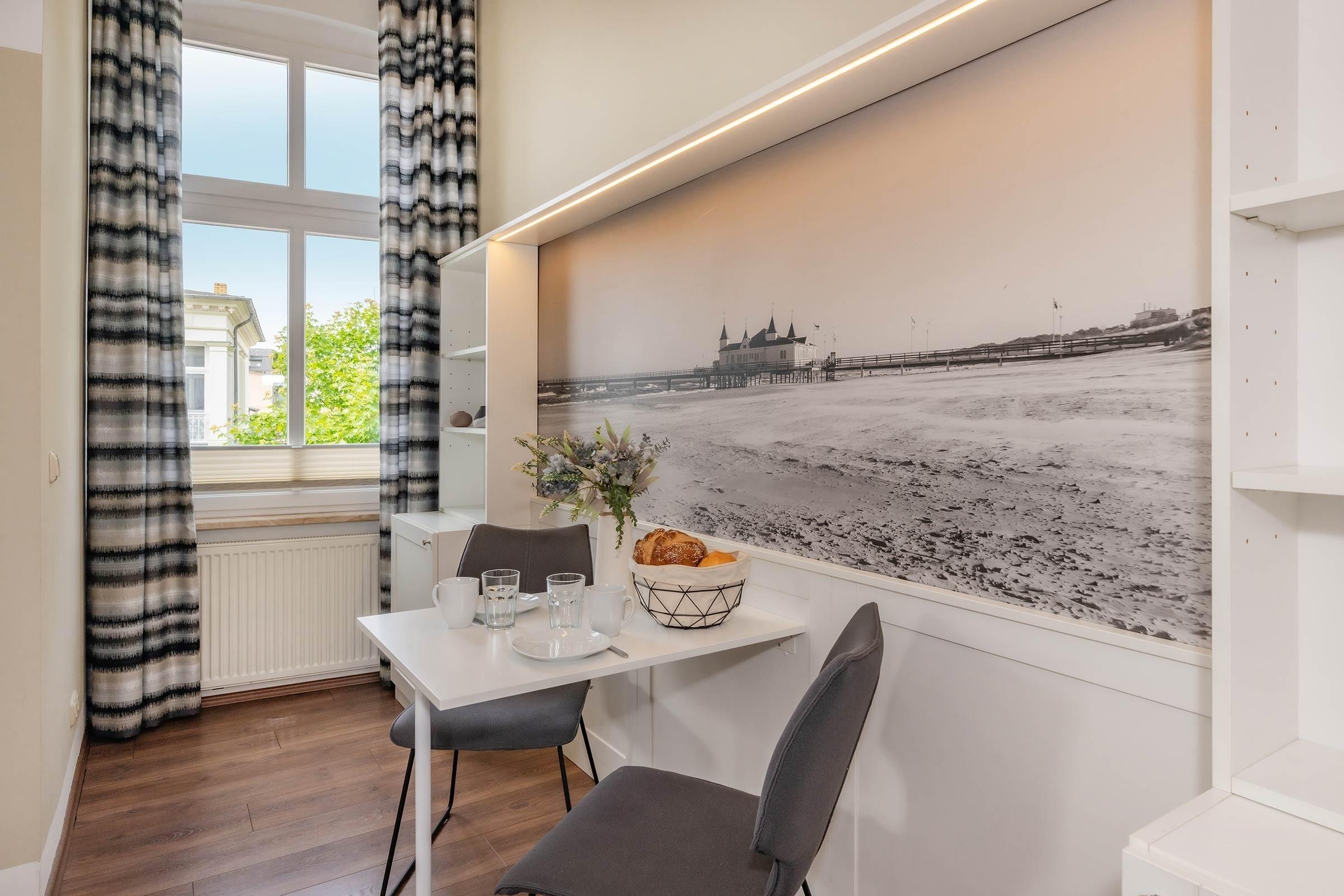 Modernes Apartment Seebrücke in Seebad Ahlbeck, 36m², nahe Strand, mit WLAN und voll ausgestatteter Küchenzeile für erholsame Urlaubstage.