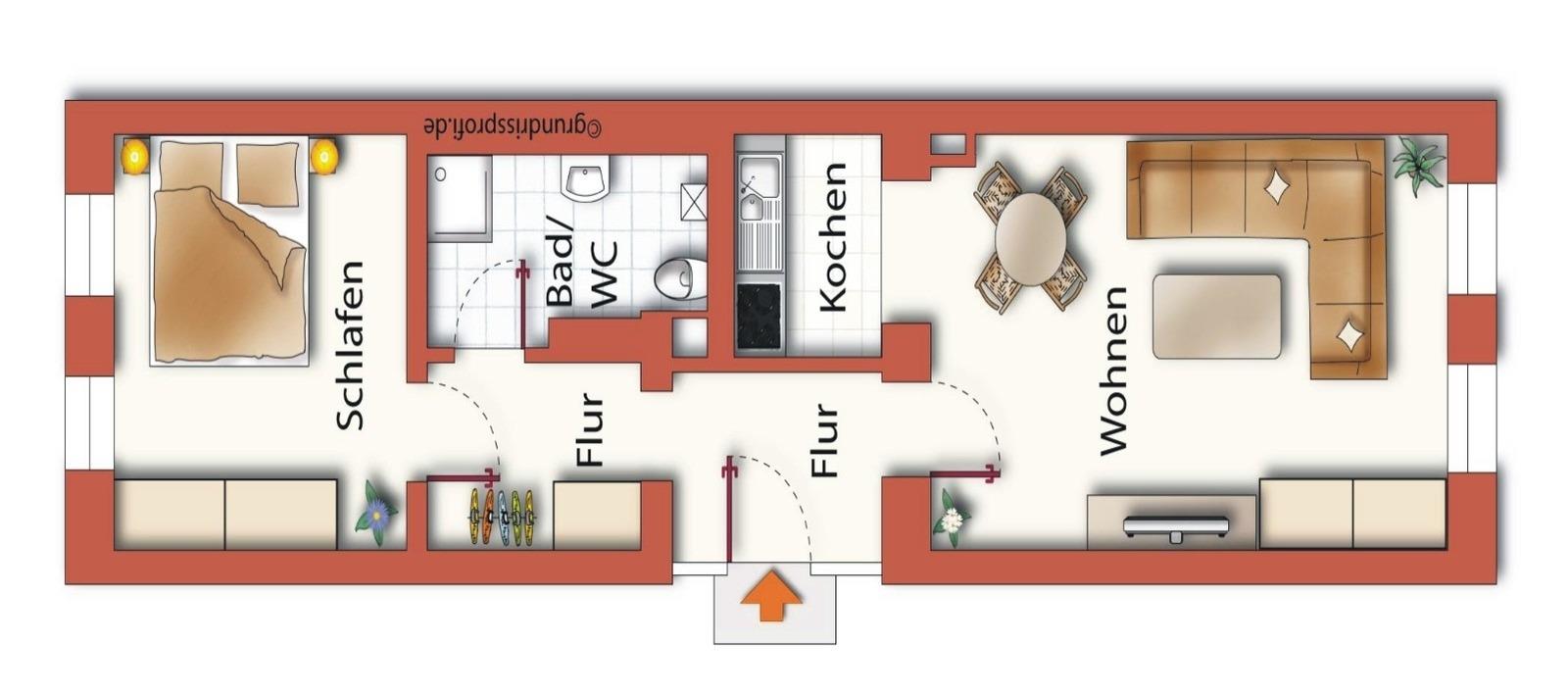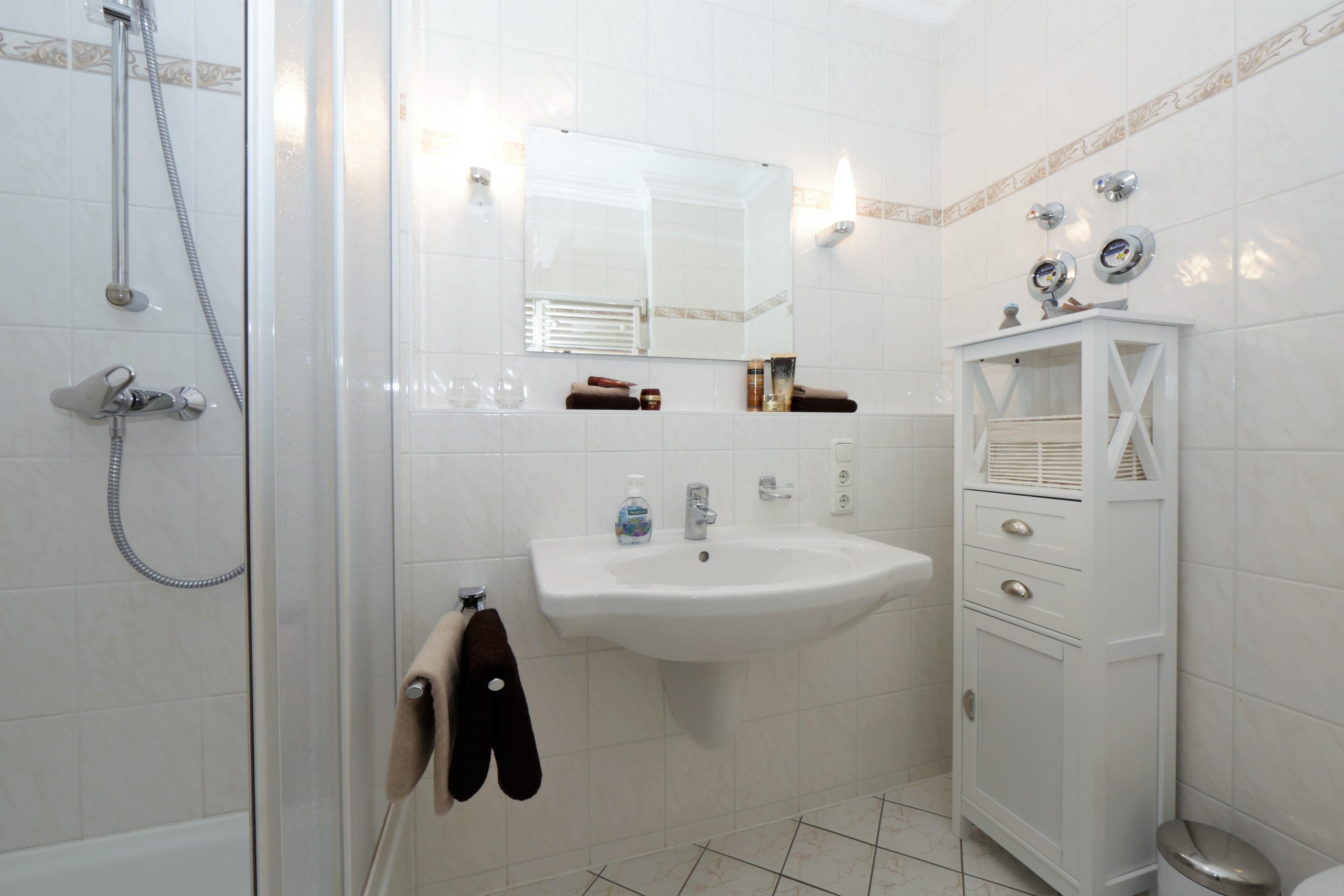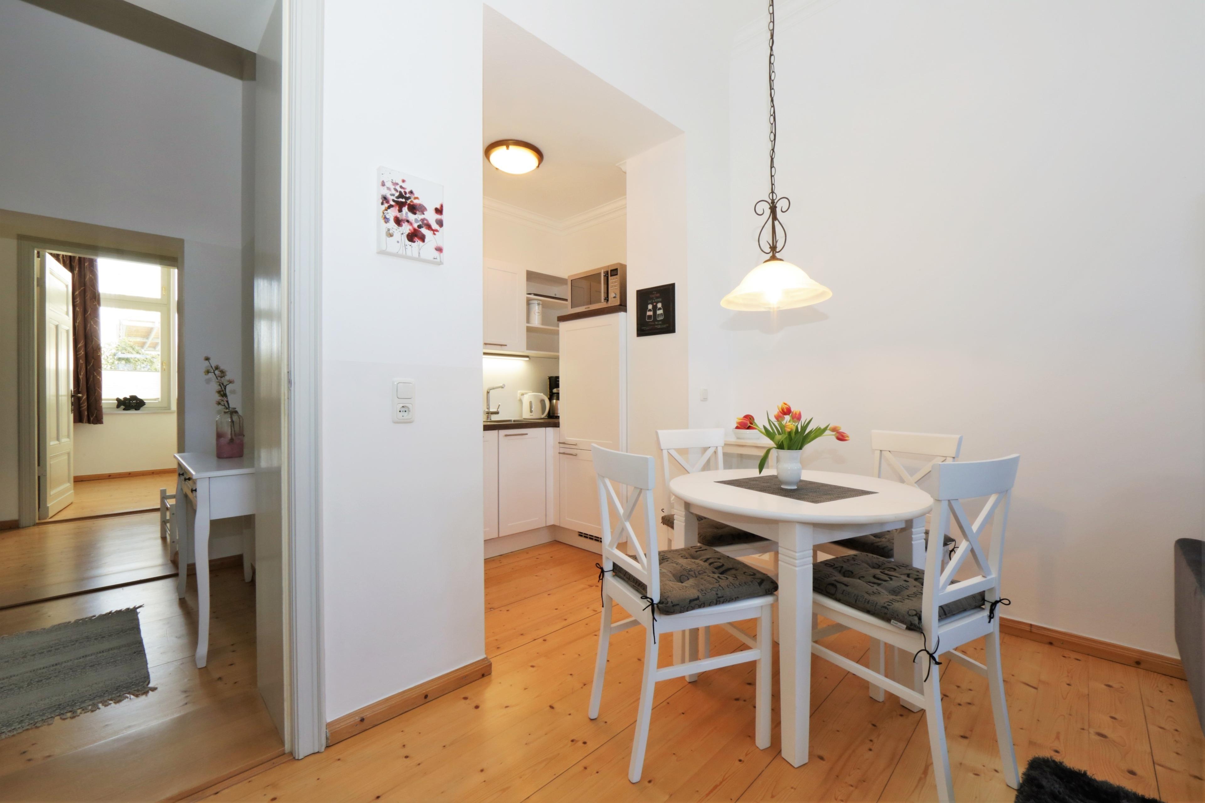 Diese gemütlich eingerichtete 42 qm große Zwei-Zimmer Wohnung liegt im Erdgeschoss und bietet 3 Personen viel Platz für einen entspannten Urlaub. Das Wohnzimmer ist mit einem gemütlichen Ecksofa mit Schlaffunktion und TV sowie einem separaten Essplatz eingerichtet. Hier schweift der Blick die verkehrsruhige Bismarckstraße hinunter. Die offene Küche mit Kaffee-und Nespresso-Maschine, Ceranfeld, kleiner Spülmaschine, Kühlschrank mit Gefrierfach und Mikrowelle mit Grill bzw. Heißluft befindet sich im Wohnraum. Das Schlafzimmer ist mit einem Boxspringbett mit getrennten Matratzen (180 x 200) und reichlich Schrankraum eingerichtet. Darüber hinaus steht den Gästen ein Duschbad mit Waschbecken/WC zur Verfügung.