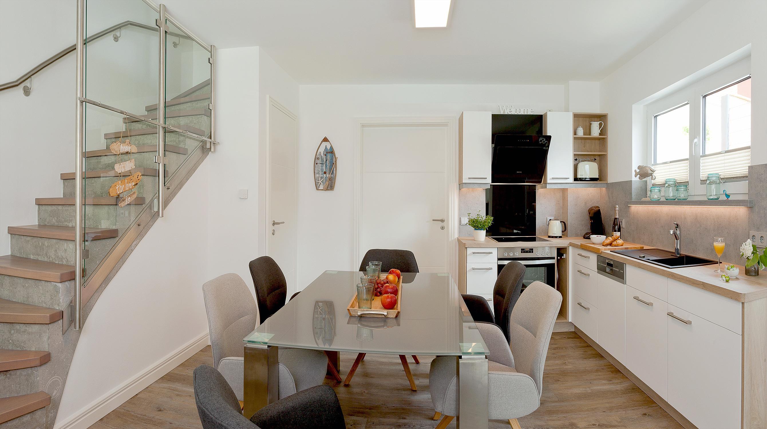 Diese moderne hochwertige 4-Zimmer Haushälfte erstreckt sich mit ihren 98 qm und ihren 4 Zimmern über zwei Ebenen. Alle Räume sind geschmackvoll und mit viel Liebe zum Detail gestaltet. Maximal 6 Personen können hier mit viel Komfort erholsame Ferien verleben. Im Erdgeschoss lädt die Wohnküche zum Kochen und zu gemeinsamen Mahlzeiten ein. Die moderne Küche ist mit Geschirrspüler, Cerankochfeld, Backofen, Kühlschrank etc. ausgestattet. Am angrenzenden bequemen Essplatz werden Sie gerne länger verweilen. Über ein paar Stufen abwärts erreichen Sie den offenen Wohnraum mit großem Ecksofa, Couchtisch und Flat TV. Von hier aus gelangen Sie auf die möblierte Terrasse, die südlich ausgerichtet ist und viel Sonne verspricht.