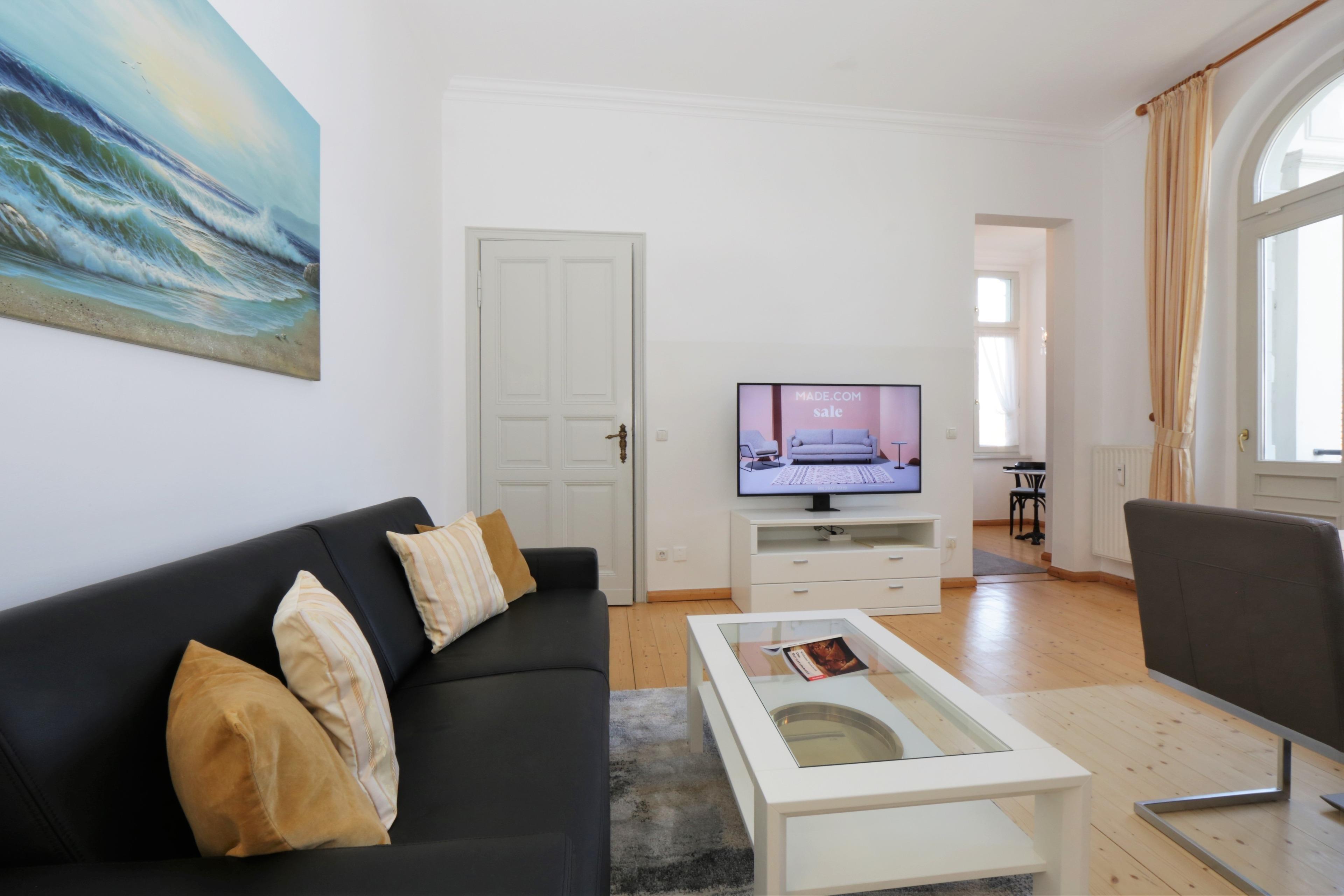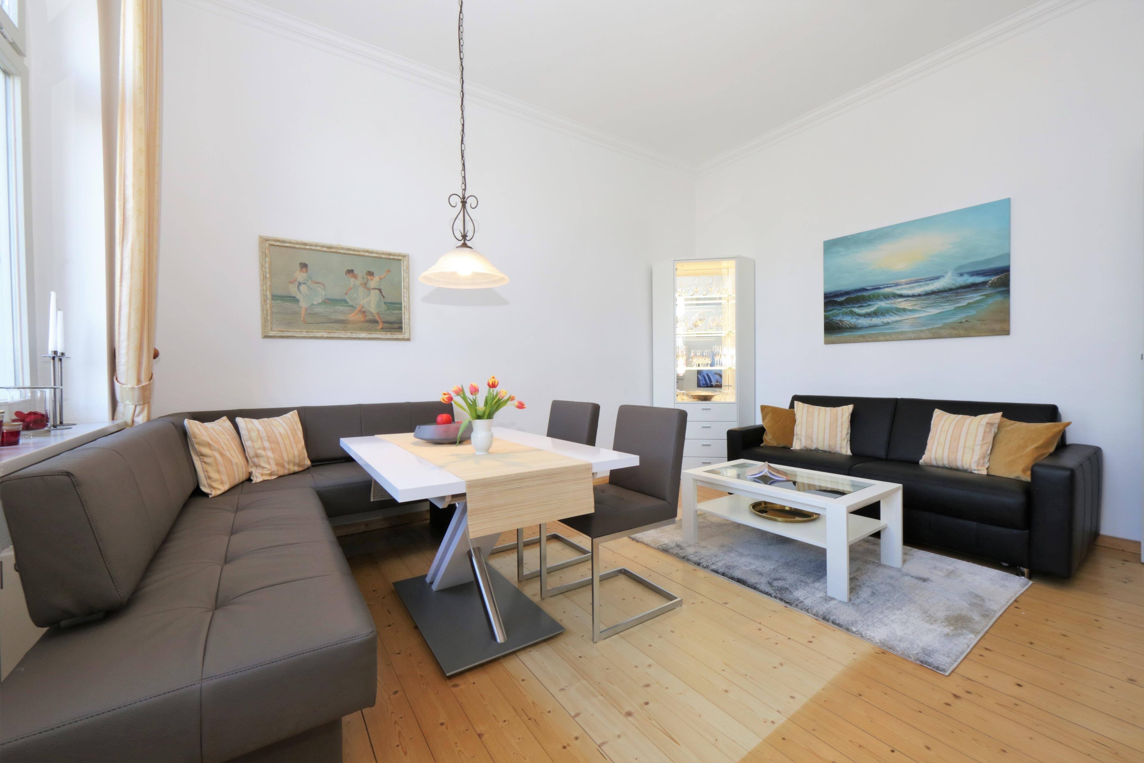Diese moderne und gemütlich eingerichtete 55 qm große Zwei-Zimmer Wohnung liegt im 1. Obergeschoss und bietet 4 Personen viel Platz für einen entspannten Urlaub. Das helle Wohnzimmer bietet den Gästen ein Ledersofa mit Schlaffunktion (Matratze 140 x 200) und einen Essplatz sowie einen großen Flat TV. Vom Wohnraum begehbar ist der Balkon in Richtung Meer. Hier schweift der Blick die verkehrsruhige Bismarckstraße hinunter bis zur Promenade und die Ostsee. Die halboffene Küche mit Ceranfeld, Spülmaschine, Kühlschrank und Mikrowelle bietet einen kleinen Essplatz im Erker mit dem gleichen schönem Blick in Richtung Ostsee. Das Schlafzimmer mit einem Boxspringbett mit getrennten Matratzen (180 x 200) und reichlich Schrankraum kann mit einem zweiten Balkon ebenfalls mit Meerblick aufwarten. Darüber hinaus steht den Gästen ein Duschbad mit Waschbecken/WC zur Verfügung.