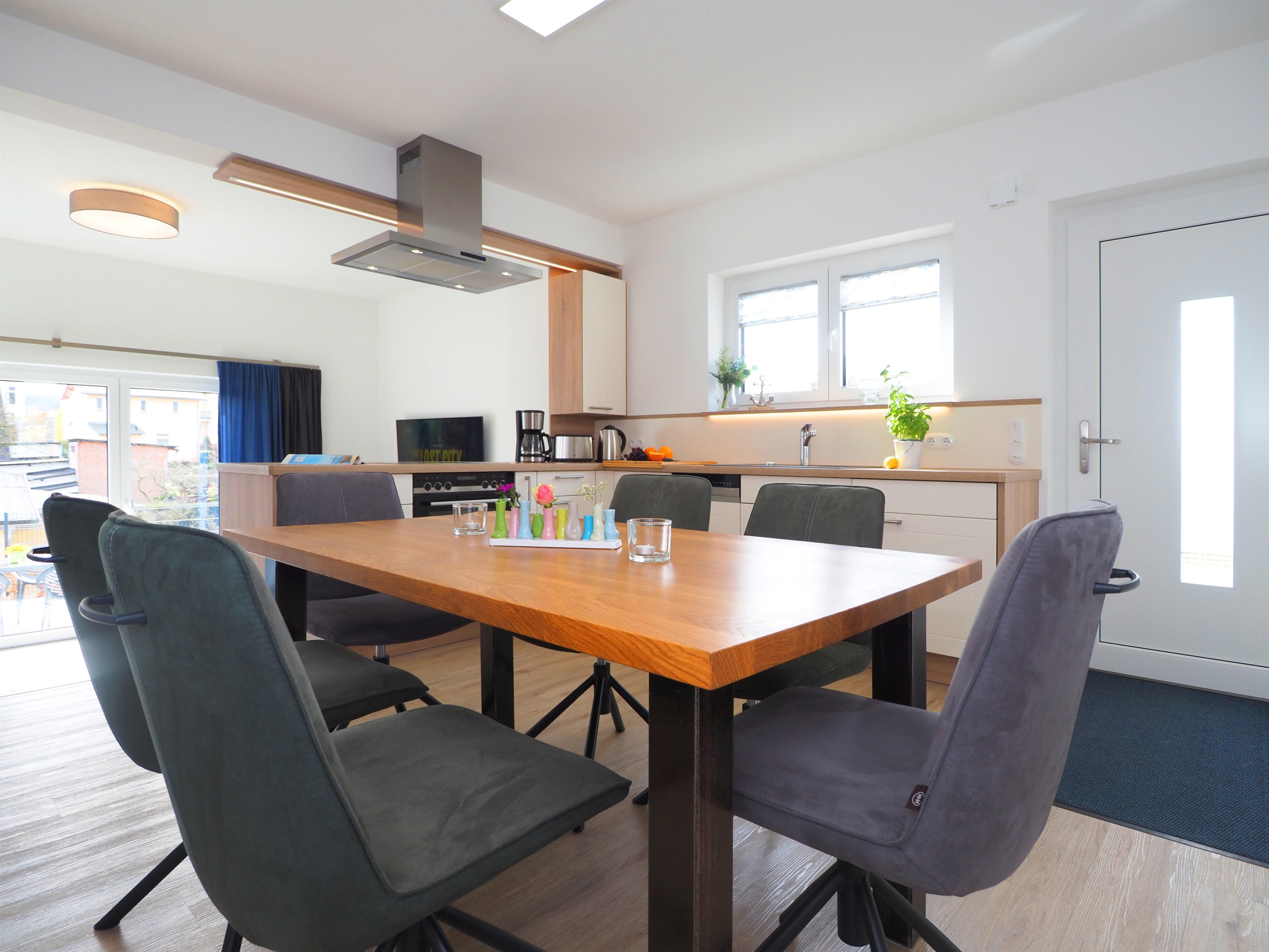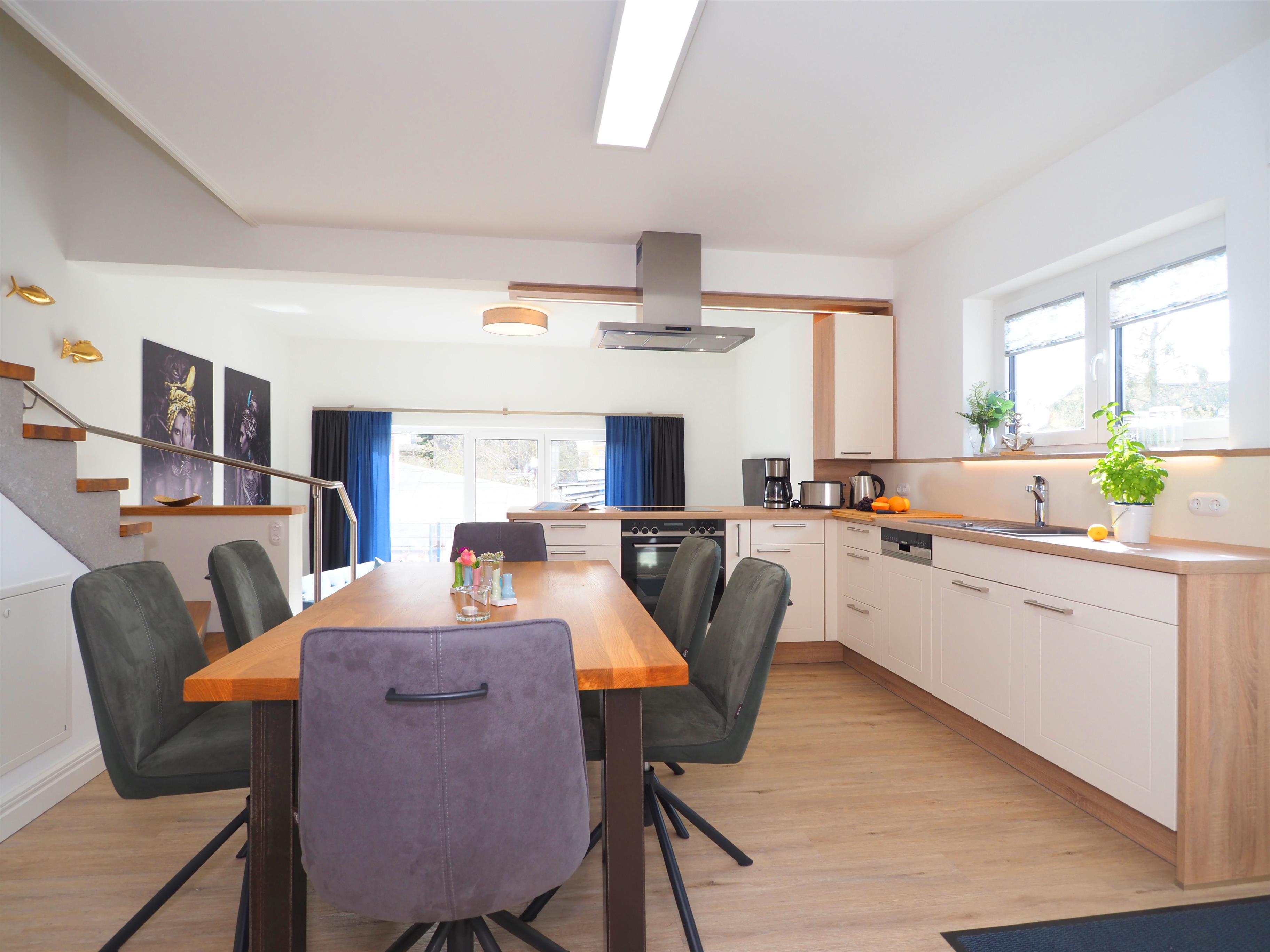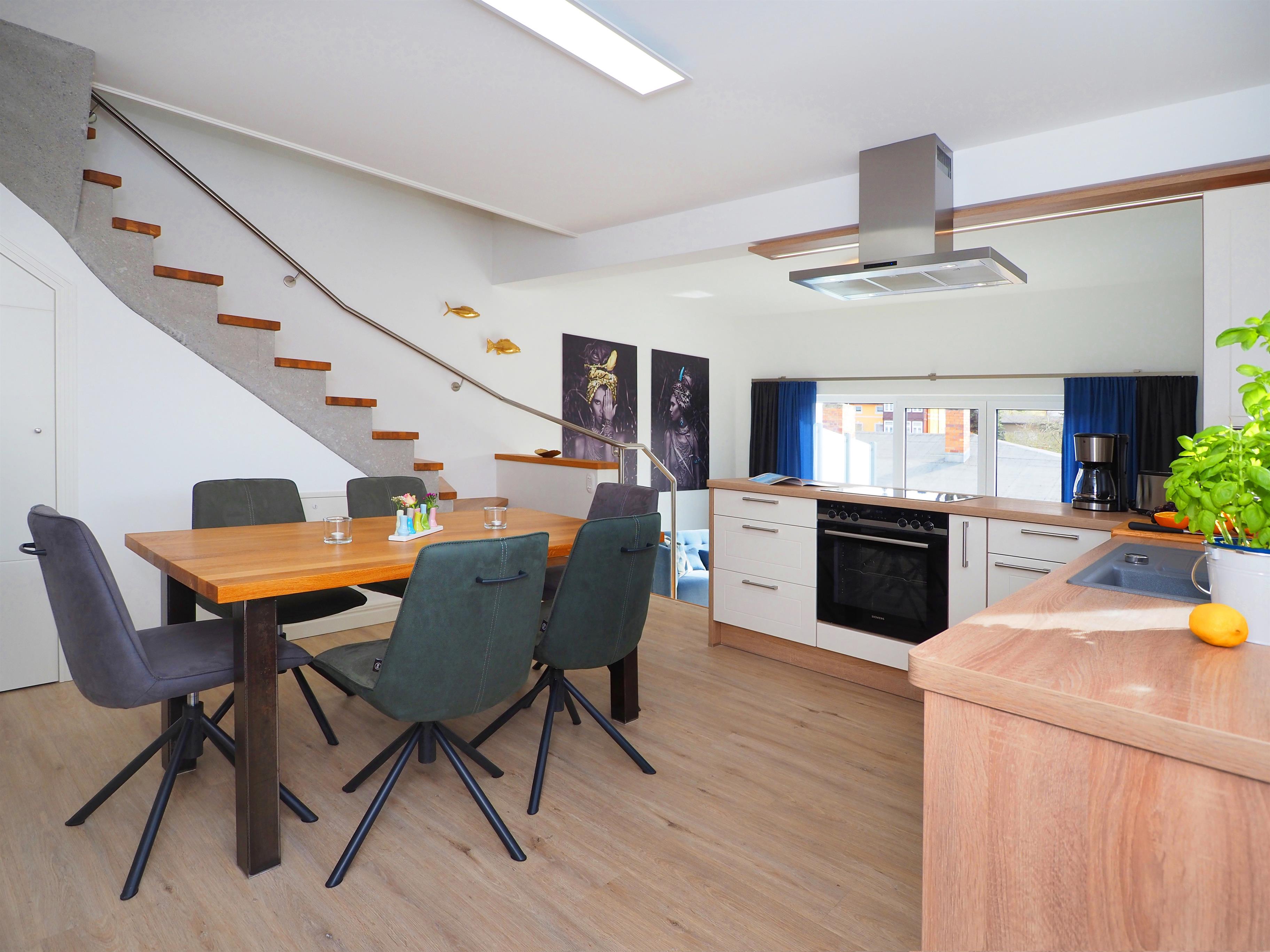 Diese moderne hochwertige 4-Zimmer Haushälfte erstreckt sich mit ihren 98 qm und ihren 4 Zimmern über zwei Ebenen. Alle Räume sind geschmackvoll und mit viel Liebe zum Detail gestaltet. Maximal 6 Personen können hier mit viel Komfort erholsame Ferien verleben. Im Erdgeschoss lädt die Wohnküche zum Kochen und zu gemeinsamen Mahlzeiten ein. Die moderne Küche ist mit Geschirrspüler, Cerankochfeld, Backofen, Kühlschrank etc. ausgestattet. Am angrenzenden bequemen Essplatz werden Sie gerne länger verweilen. Über ein paar Stufen abwärts erreichen Sie den offenen Wohnraum mit großem Sofa, Couchtisch und Flat TV. Von hier aus gelangen Sie auf die möblierte Terrasse, die südlich ausgerichtet ist und viel Sonne verspricht.