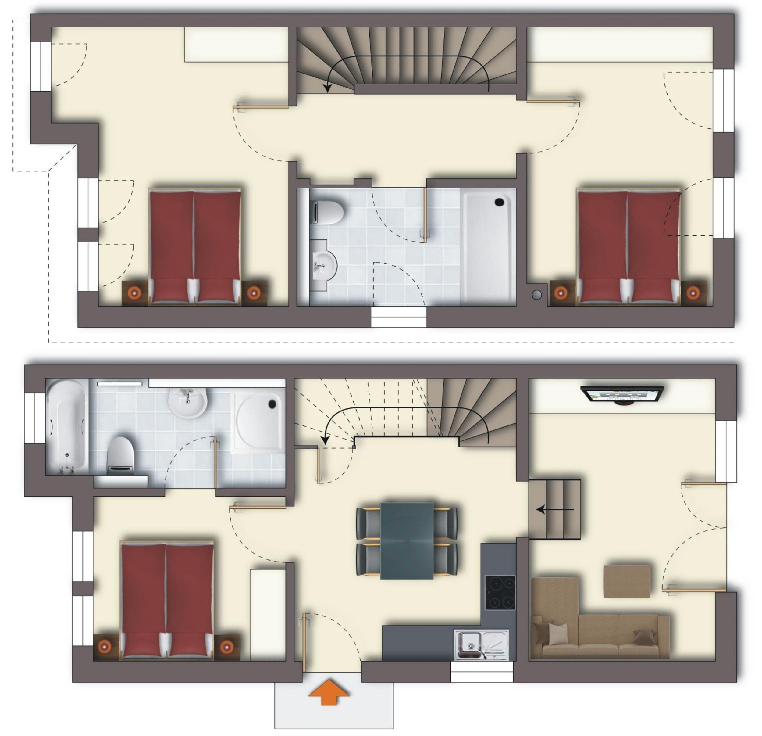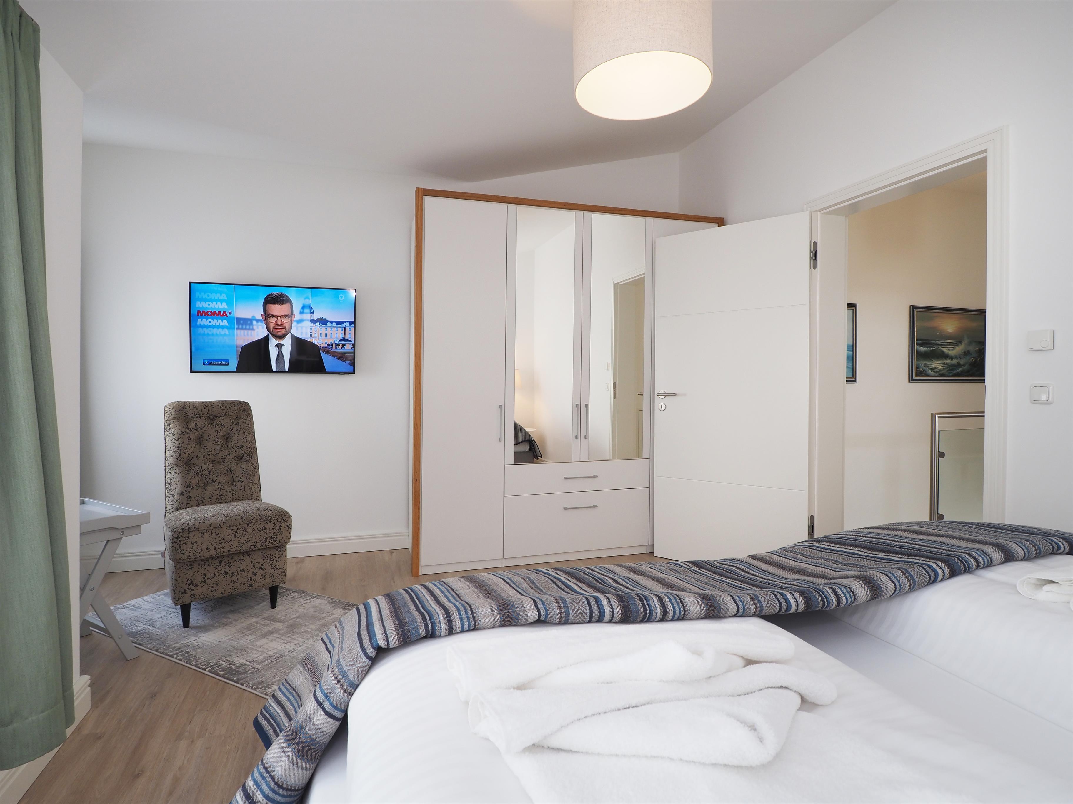 Die beiden ebenfalls großzügigen Schlafzimmer im Obergeschoss bieten den gleichen Komfort. Alle Schlafzimmer sind mit einem zusätzlichen TV ausgestattet. Die oberen Schlafzimmer teilen sich ein Bad mit ebenerdiger Dusche und Waschtisch/WC.