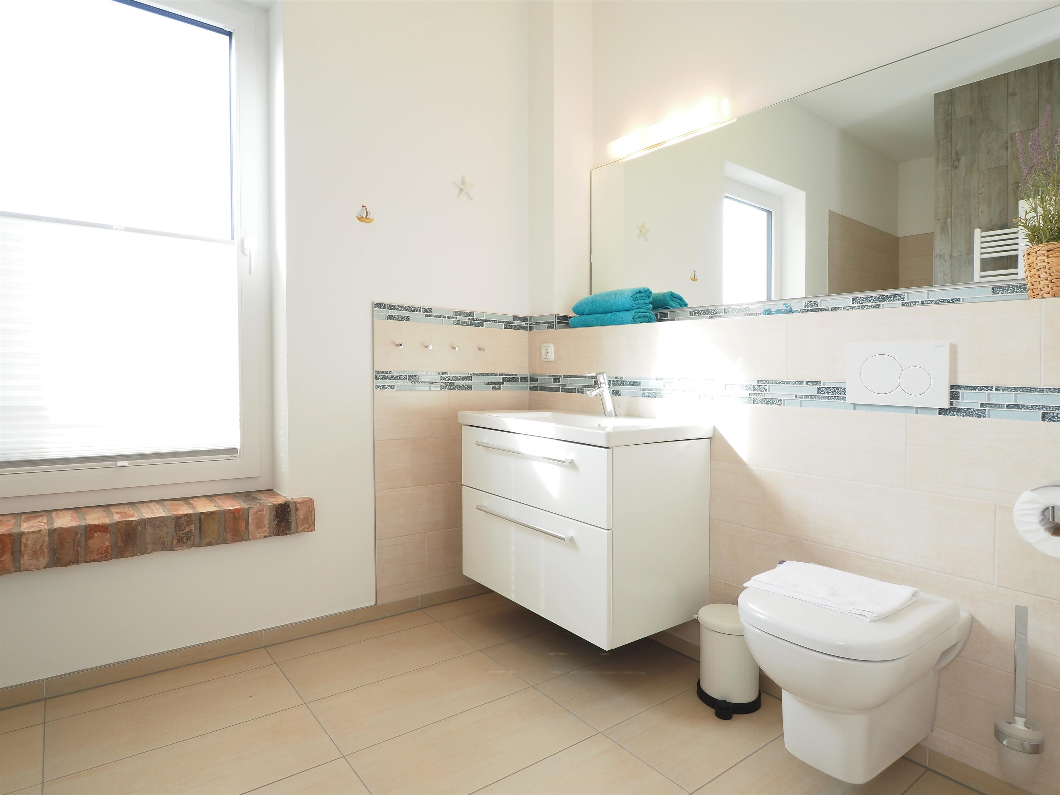 Ebenfalls im Erdgeschoss befindet sich ein Schlafzimmer mit Bad en suite. Das Boxspringbett mit getrennten Matratzen (160 bzw. 180 x 200) sowie die Möglichkeit der Verdunklung sorgen für erholsamen Schlaf. Ausreichend Schrankraum ist vorhanden. Das großzügige Bad mit Fenster bietet Ihnen sowohl Badewanne als auch Dusche und Waschtisch/WC.