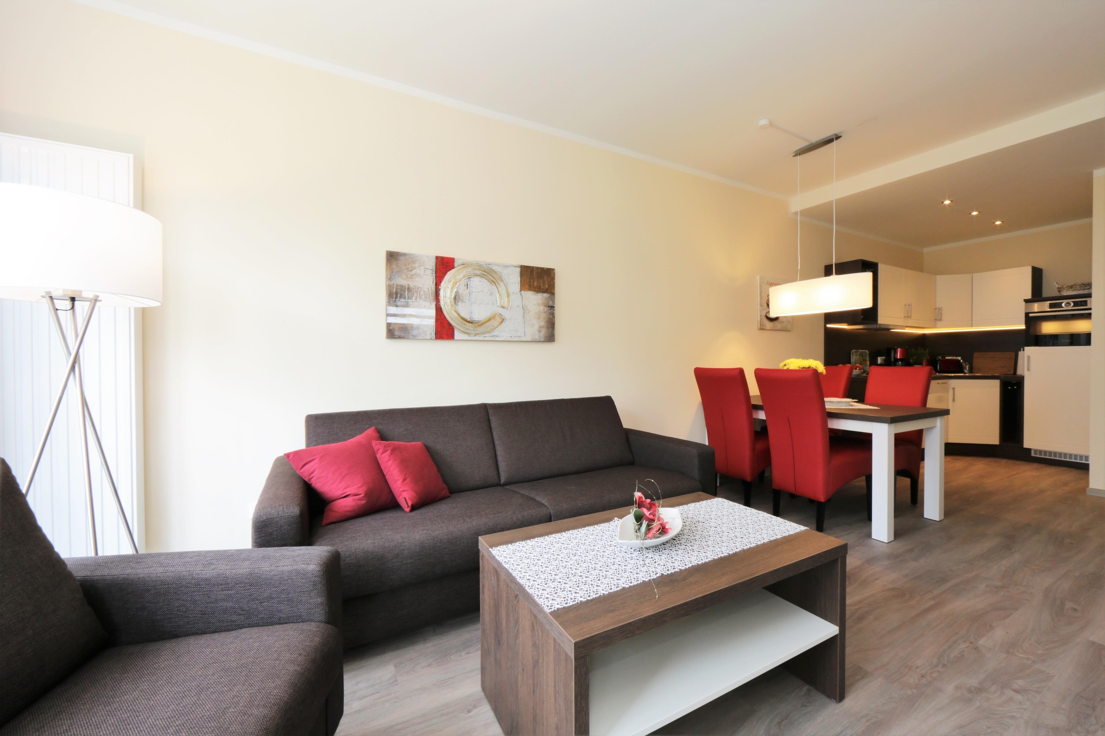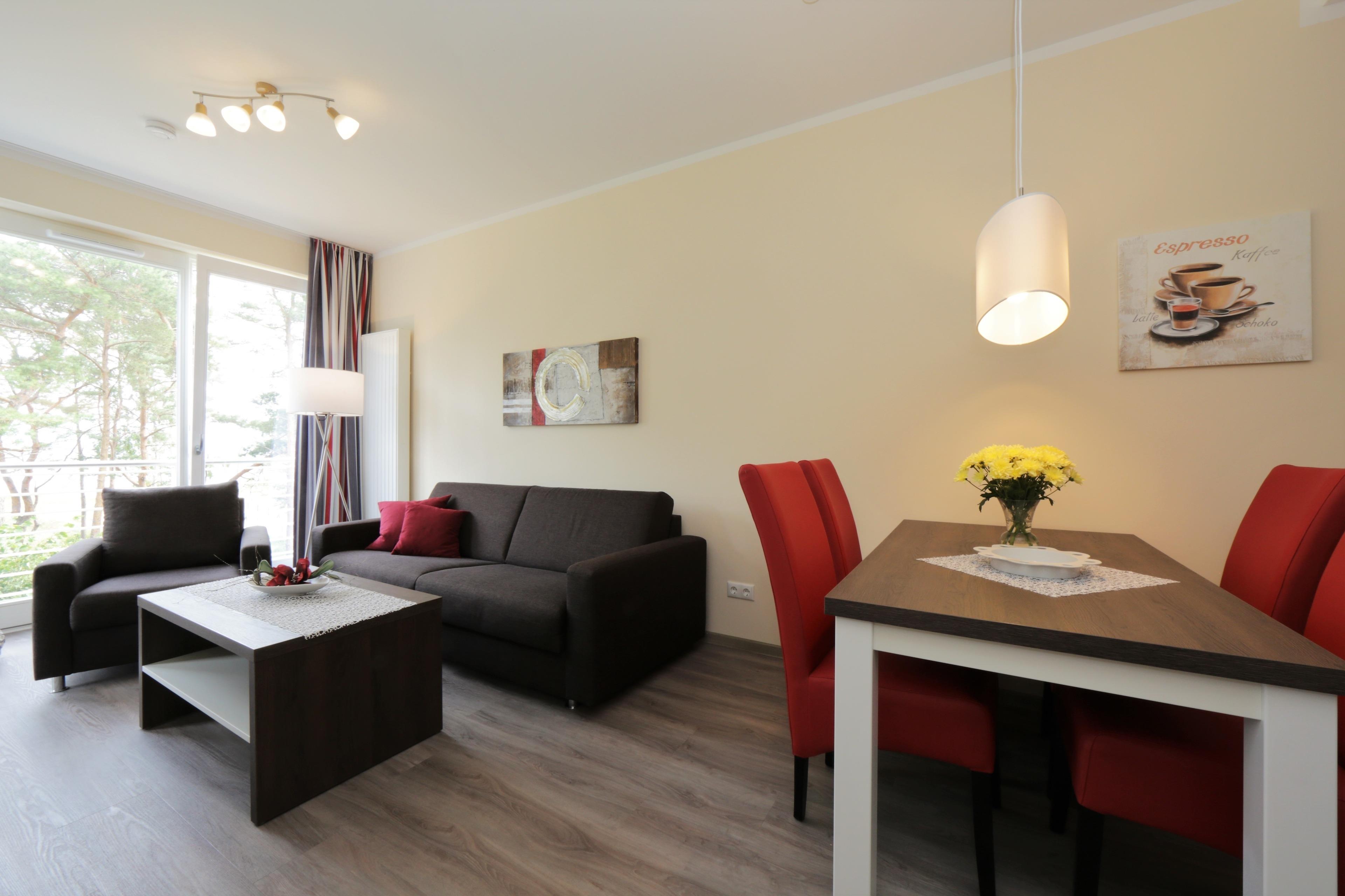 Diese moderne, liebevoll eingerichtete 2-Zimmer Wohnung mit 51 m² Wohnfläche befindet sich im 2. Obergeschoss der 2018 neu gebauten Strandresidenz. Der überdachte Balkon zur Promenade lockt Sie mit seinem traumhaftem Blick auf die Ostsee schon zum Frühstück ins Freie. Die Wohnung ist individuell und komfortabel eingerichtet und bietet 2-4 Personen Platz für einen erholsamen Urlaub direkt am Meer. Der offene Wohnraum bietet Ihnen eine gemütliche Sitzecke mit einem bequemen Sofa mit Schlaffunktion (Matratze 160 x 200), einen Sessel und Flat TV. Die Küchenzeile incl. Backofen, Ceranfeld, Kühlschrank, Geschirrspüler, Mikrowelle etc. sowie der Essplatz sind offen im Wohnraum integriert. Das geräumige Schlafzimmer ist mit einem Doppelbett mit getrennten Matratzen (90 x 200), einem großen Kleiderschrank und zusätzlichem Flat TV eingerichtet. Aus beiden Zimmern genießen Sie den Seeblick aus erster Hand. Der Balkon lässt sich sowohl vom Wohn- als auch vom Schlafzimmer betreten. Das großzügige, moderne Bad ist mit einer ebenerdigen Dusche und Waschtisch/WC ausgestattet.