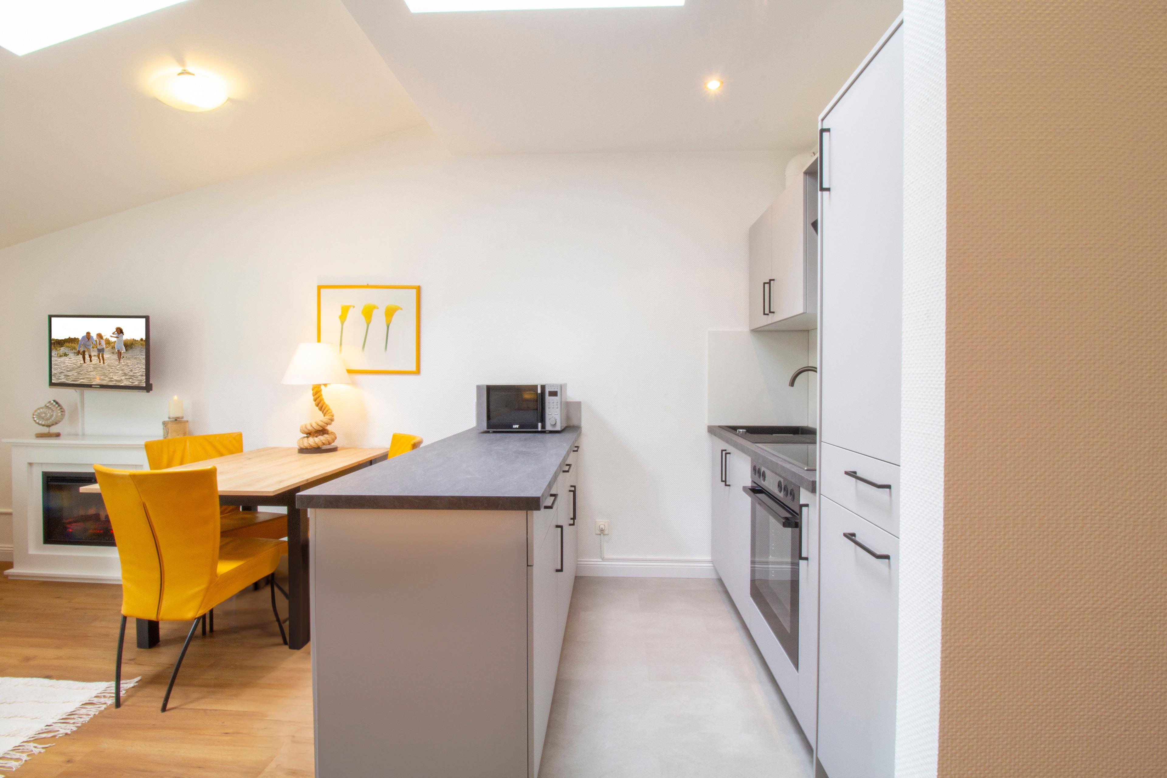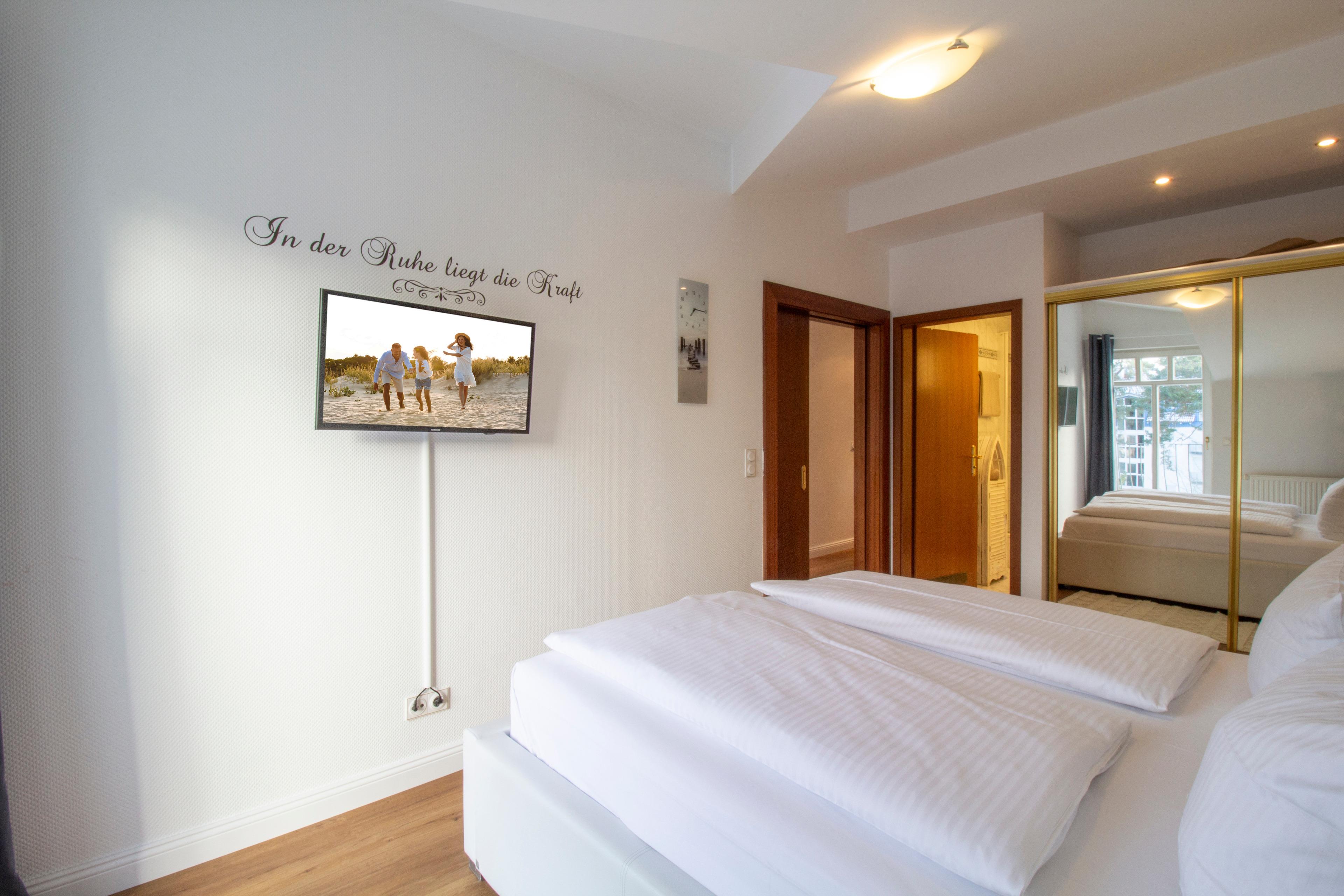 Diese gepflegte und liebevoll eingerichtete 45 qm große 2-Zimmer-Wohnung liegt in einer Toplage direkt am weißen Sandstrand. Diese befindet sich im Dachgeschoss mit einem zum Süden ausgerichteten Balkon, der sowohl vom Wohn- als auch vom Schlafraum betreten werden kann. Der Wohnbereich ist mit einer gemütlichen Couch (mit Schlaffunktion 1,60x2,00m), Sessel, Couchtisch und TV/Radio eingerichtet. Die moderne Küchenzeile, ausgestattet mit Cerankochfeld, Backofen, Mikrowelle, Geschirrspüler, Kühlschrank, Toaster, Kaffeemaschine etc. und ein Essplatz sind offen in den Wohnbereich integriert. Bei der Einrichtung des Schlafzimmers wurde der Schlafqualität besondere Aufmerksamkeit gewidmet. Es stehen den Gästen ein Doppelbett mit Kingsize-Boxspringmatratze (B180xL200xH24), ausreichend Schrankraum, ein Turmlüfter und ein weiterer TV zur Verfügung. Das gut ausgestattete Bad bietet den Gästen Badewanne, Echtglasdusche und Waschtisch/WC. Außerdem steht Ihnen ein Gäste-WC zur Verfügung. Einen Pkw-Stellplatz in der hauseigenen Tiefgarage können die Gäste nutzen. (Achtung Doppelparker max. 1,50 m Autohöhe, max. Autolänge 5,00m, max. Gewicht 2 t, Mindestbodenfreiheit vorne 22,2 cm, Mitte 14,0 cm, hinten 27,5 cm).