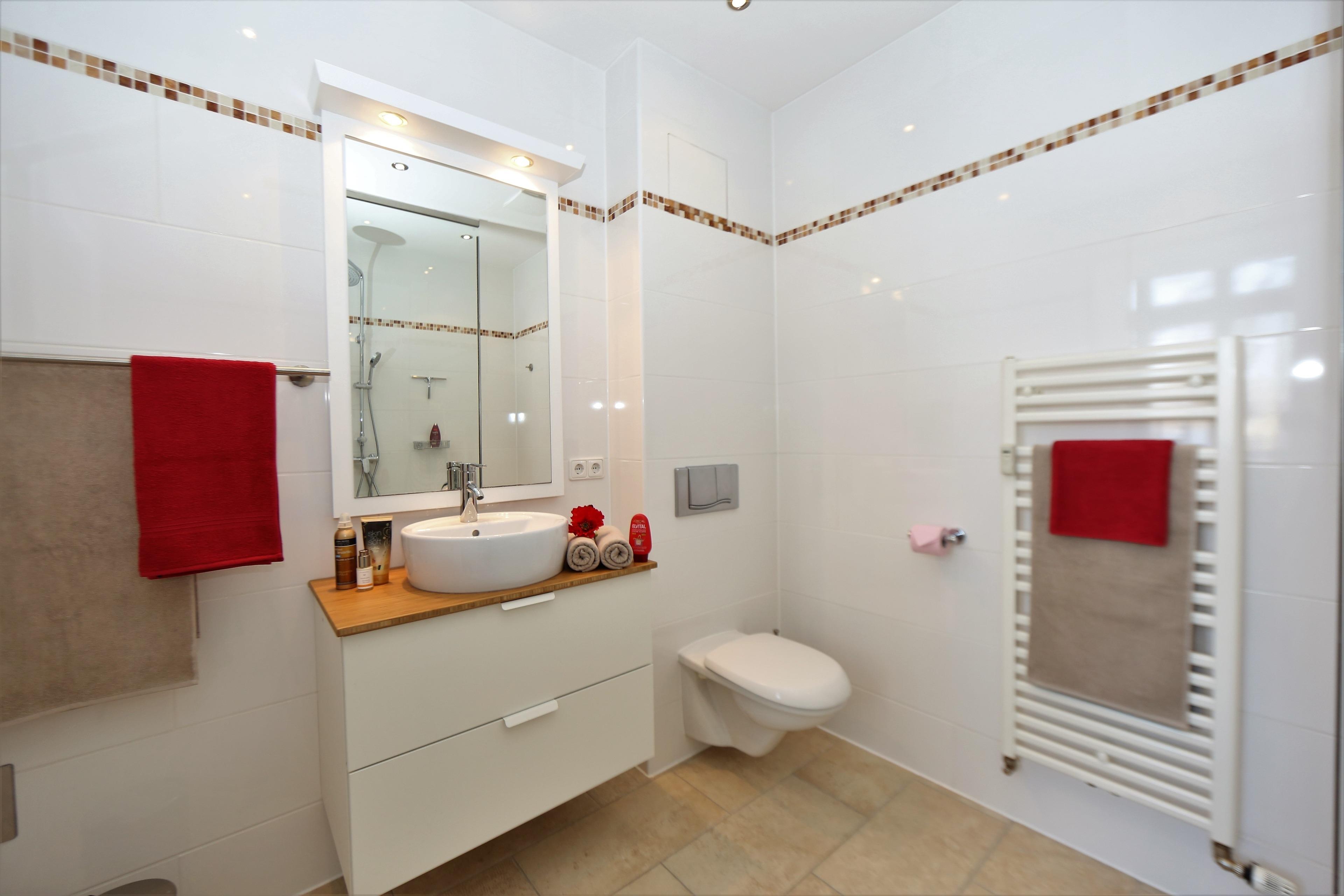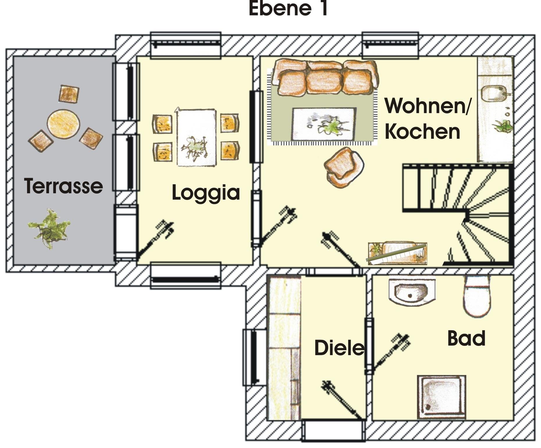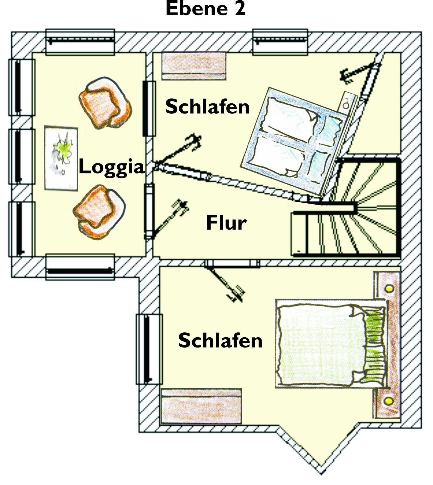 Diese großzügige lichtdurchflutete 3-Zimmer Maisonettwohnung liegt im Erd- bzw. 1. Obergeschoss mit einer möblierten Terrasse zur Seeseite mit Blick auf die Promenade. Der Wohnraum im unteren Bereich beherbergt eine kleinere Couchecke mit Flat TV sowie die offene Vollküche inkl. Ceranfeld mit Backofen, Kühlschrank, Spülmaschine etc. In der angrenzenden Loggia lädt ein großer Essplatz zu gemeinsamen Mahlzeiten ein. Das Bad liegt ebenfalls auf der unteren Ebene und ist mit einer ebenerdigen Echtglasdusche und Waschtisch/WC ausgestattet. Beide Schlafzimmer liegen auf der oberen Ebene, sind über eine Treppe aus dem Wohnbereich zu erreichen und mit einem Doppelbett mit getrennten Matratzen und einem begehbaren bzw. großen Kleiderschrank eingerichtet. Das Highlight dieser Wohnung ist die zweite Loggia, die an eines der beiden Schlafzimmer grenzt und mit zwei bequemen Sesseln eingerichtet ist. Von hier aus können Sie das Meer nicht nur riechen sondern teilweise auch durch die Bäume sehen. Der Blick reicht bis zur Ahlbecker Seebrücke. Dieser herrliche Platz lädt zum Lesen, Träumen und Relaxen ein. Die Gäste, die Sonne und Seeluft lieber aus erster Hand genießen, können die Terrasse nutzen, die bis um die Hausecke reicht.