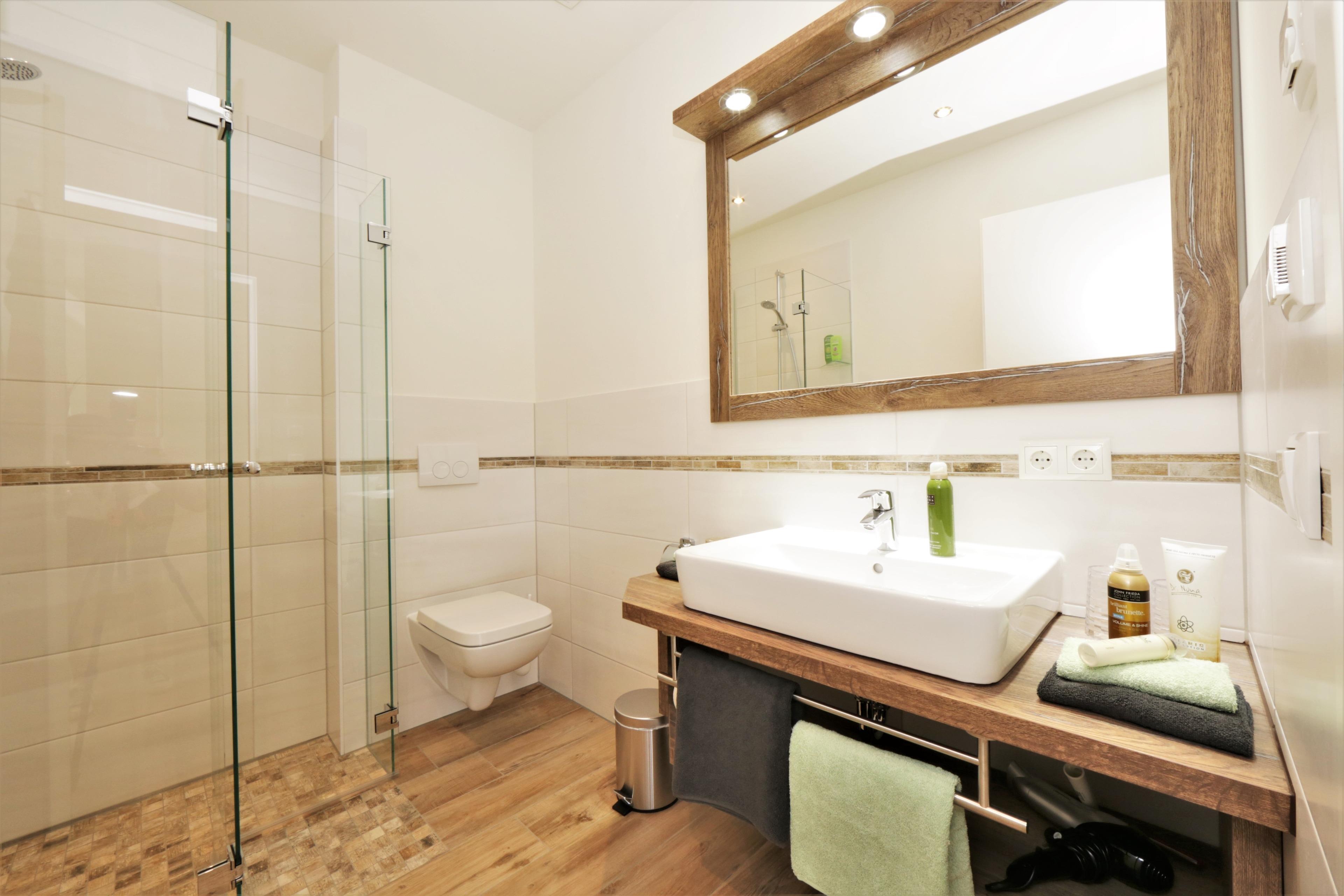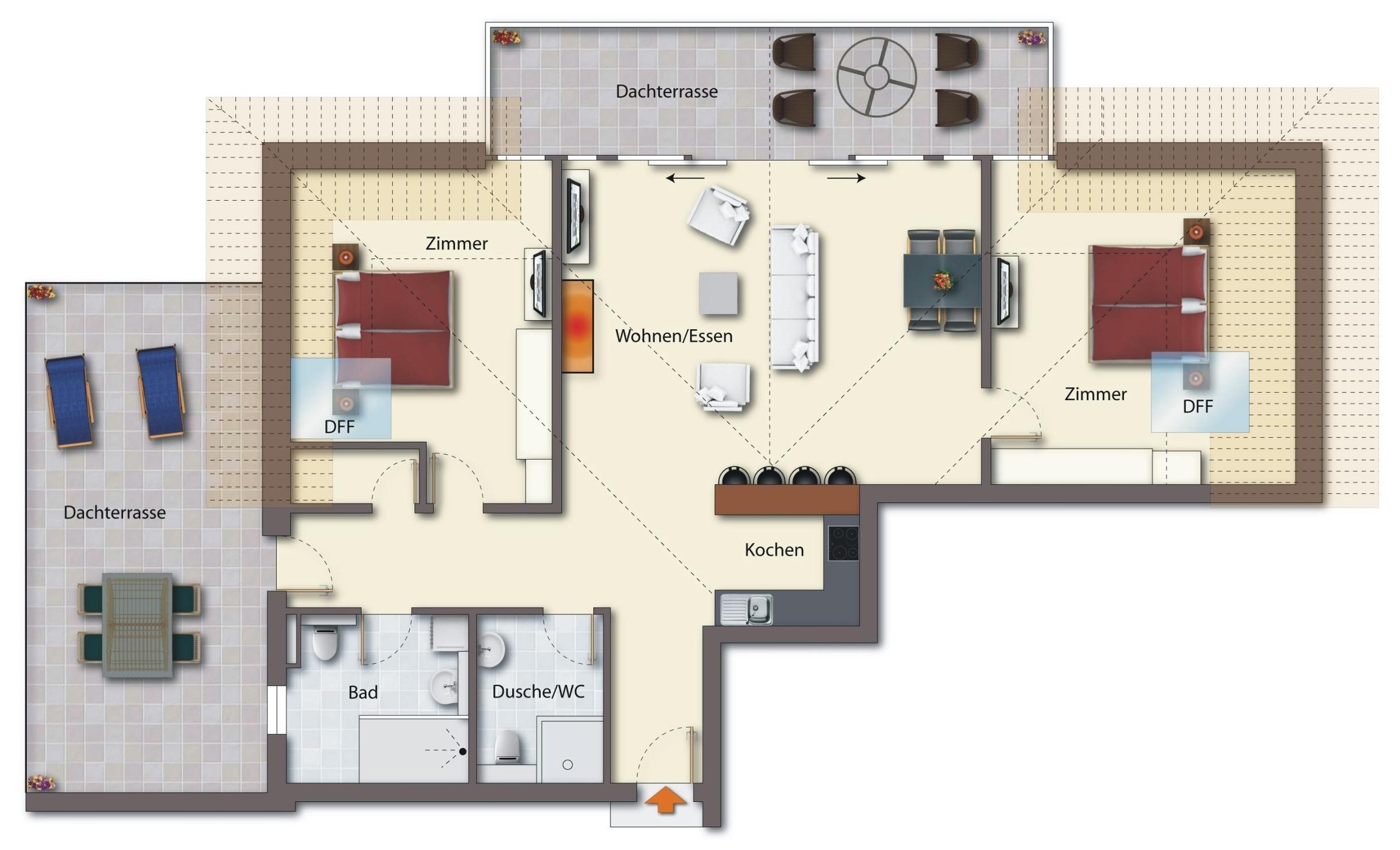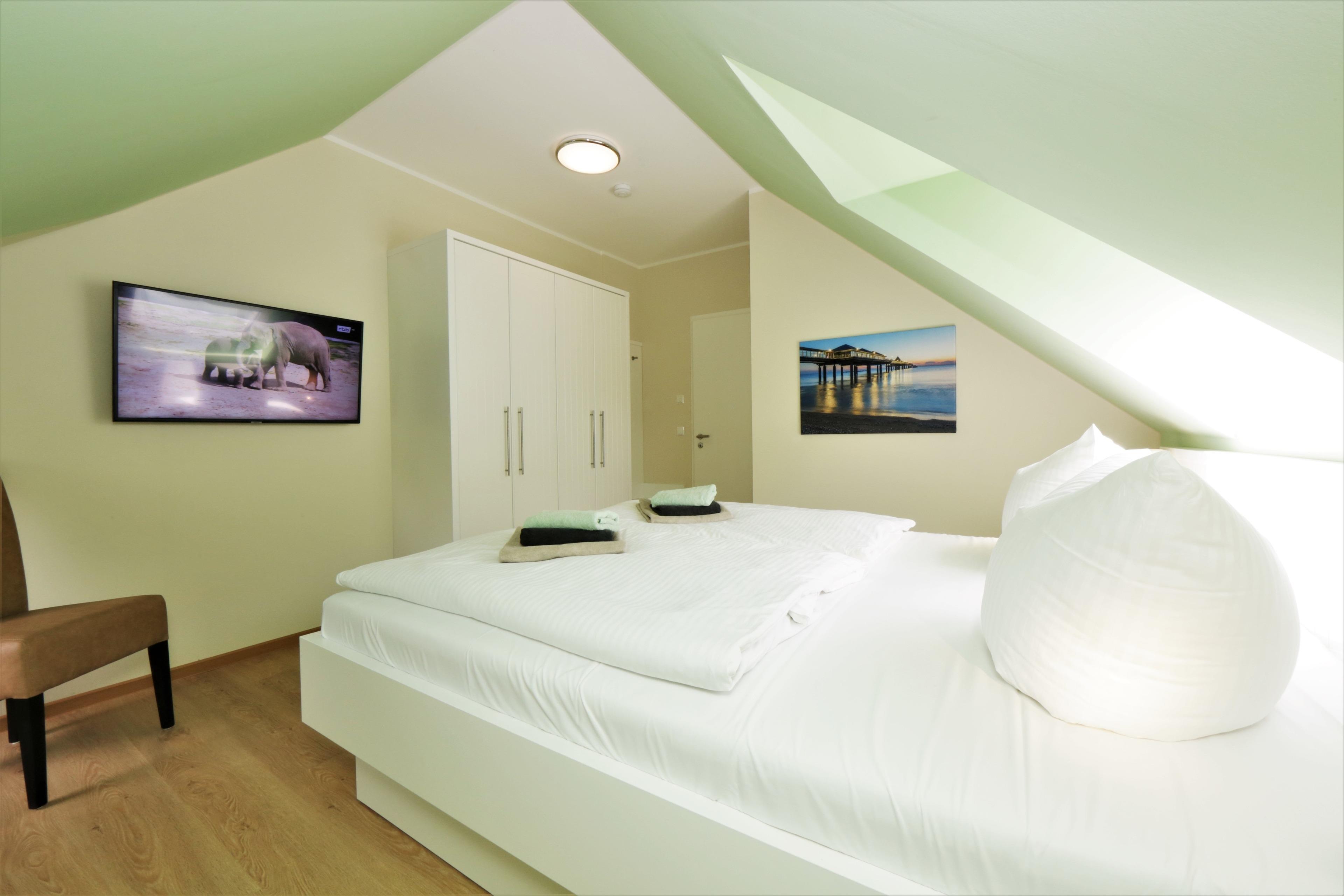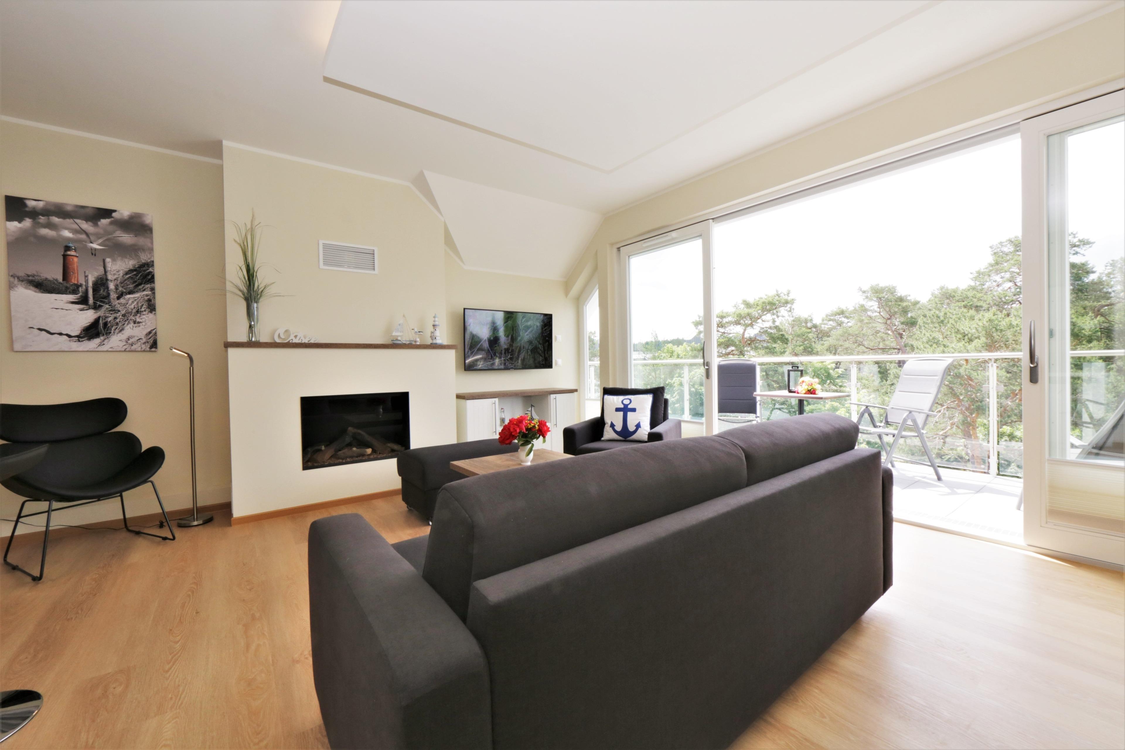 Dieses mit 90 qm sehr großzügige 3-Zimmer Appartement befindet sich im Dachgeschoss der 2018 neu erbauten Strandresidenz und bietet 4-6 Personen reichlich Komfort und ist selbstverständlich per Fahrstuhl zu erreichen. Genießen Sie Ihren Urlaub direkt am Meer in dieser hochwertig und sehr geschmackvoll eingerichteten Wohnung. Im Wohnbereich mit großer Fensterfront erwartet Sie eine bequeme Polstergarnitur bestehend aus Sofa und Sessel, ein Couchtisch und Flat TV sowie ein Esstisch für gemeinsame Mahlzeiten. Ein Kamin (gasbetrieben) sorgt für Gemütlichkeit und zusätzliche Wärme bei Bedarf. Die moderne offene Küche mit Tresen und Barhockern ist mit Cerankochfeld, Backofen mit integrierter Mikrowelle, Geschirrspüler, Kühlschrank, Kaffeemaschine etc. ausgestattet. Beide Schlafzimmer verfügen jeweils über ein extra großes komfortables Doppelbett mit getrennten Matratzen (90 x 220), reichlich Schrankraum sowie einen eigenen TV. Aus einem der beiden Schlafzimmer können Sie einen Blick auf die Ostsee genießen. Den großen Balkon in Süd-West-Ausrichtung betreten Sie vom Wohnraum. Auf der windgeschützten Dachterrasse (ebenfalls Süd-West-Ausrichtung) können Sie bei entsprechendem Wetter sommerliche Sonnentage bereits ab März bis in den November hinein genießen. Sitzgelegenheiten und Sonnenliegen sind vorhanden. Beide Badezimmer sind mit einer bodengleichen Dusche mit Echtglasabtrennung und Waschtisch/WC ausgestattet. Zur Ausstattung gehören jeweils ein Fön und Fußbodenheizung.