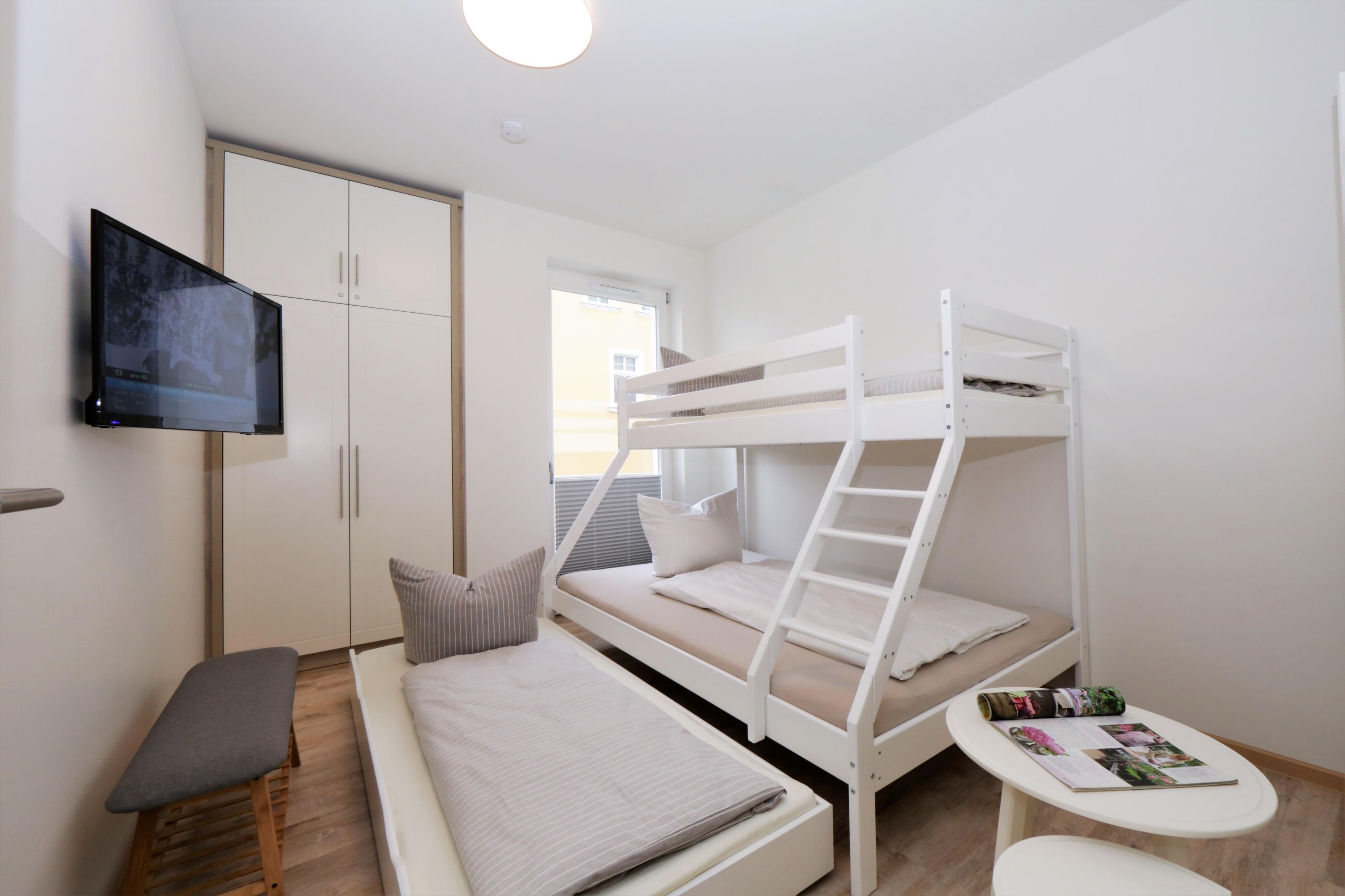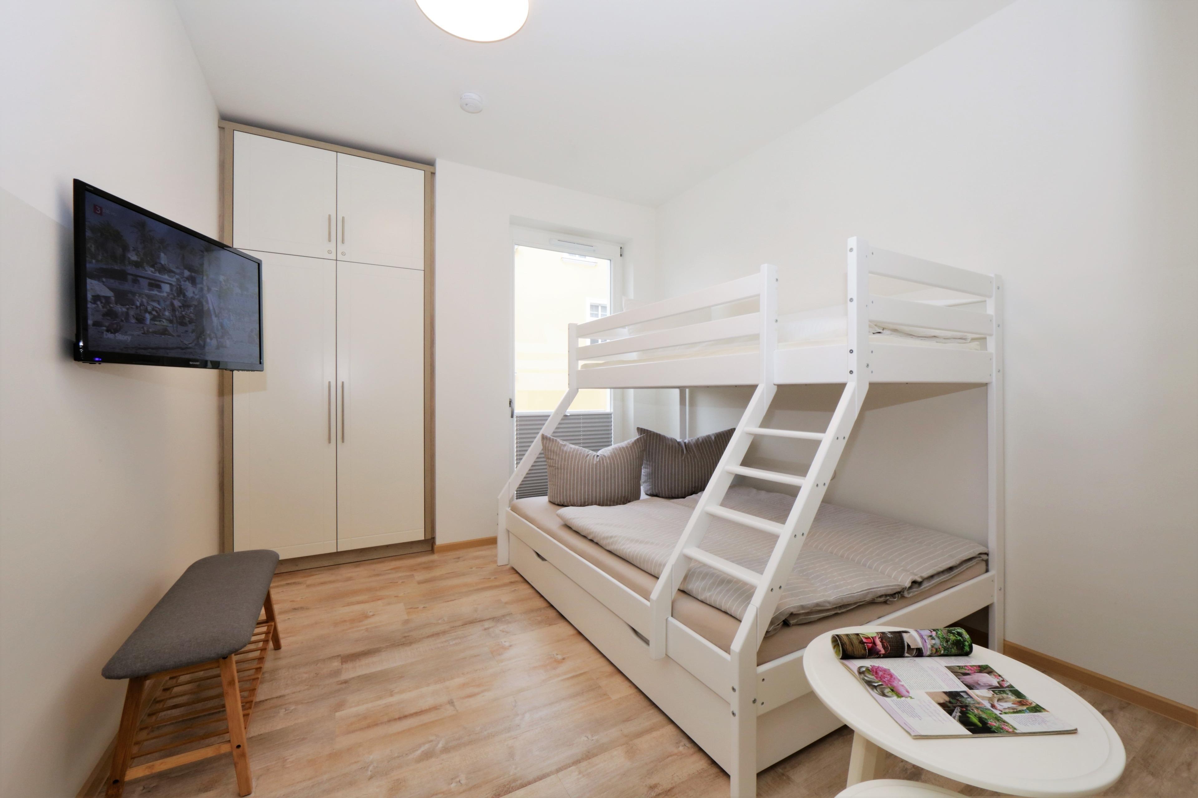 Das Schlafzimmer zum Süden ist mit einem Doppelbett (180 x 200, durchgehende Matratze), einem kleinen Kleiderschrank und einem zusätzlichen TV eingerichtet. Außerdem steht Ihnen hier ein Baby/Kleinkinderbett (140 x 70) zur Verfügung (Decke und Kissen für das Kinderbett sind nicht vorhanden). Das zweite Schlafzimmer bietet Ihnen ein Etagen-/Tandembett (140 x 200, 90 x 200 und 90 x 190) für insgesamt vier Kinder und einen Kleiderschrank. Den Kindern steht ein separater TV zur Verfügung. Aus dem Fenster können Sie den Sonnenuntergang über der Ostsee begleiten. Das moderne Badezimmer mit Fenster ist mit einer ebenerdigen Dusche und Waschtisch/WC ausgestattet.