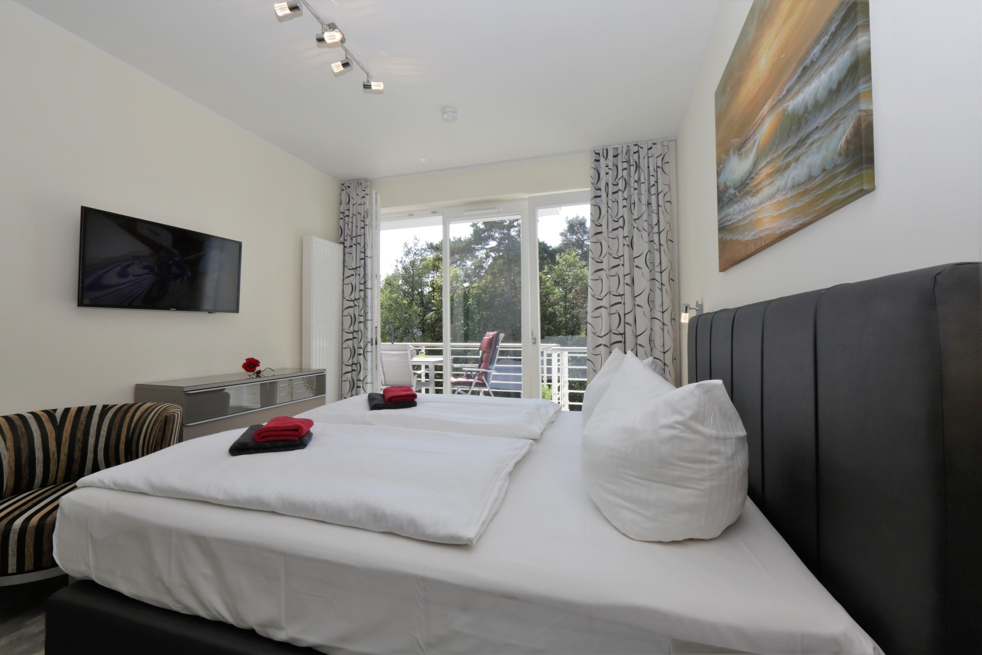 Dieses moderne 2-Zimmer Appartement ist 55 qm groß und befindet sich im 2. Obergeschoss der 2018 neu erbauten Strandresidenz. Die Wohnung ist für 2-4 Personen geeignet. Im Wohnbereich erwartet Sie eine bequeme Polstergarnitur mit Schlaffunktion (Liegefläche 1,50 m x 1,90 m), Couchtisch und Flat TV sowie ein Esstisch für gemeinsame Mahlzeiten. Die moderne Küche mit Cerankochfeld, Backofen, Mikrowelle, Geschirrspülmaschine, Kühlschrank, Tiefkühlschrank etc. ist ebenfalls offen im Wohnraum integriert. Über den Wohnbereich sowie das Schlafzimmer erreichen Sie den zum Süden ausgerichteten überdachten Balkon, der viele Sonnenstunden verspricht. Das Schlafzimmer verfügt über ein komfortables Boxspringbett (1,80 m x 2,00 m), einen Kleiderschrank und Flat TV. Das großzügige moderne Badezimmer ist mit einer bodengleichen Dusche mit Echtglasabtrennung und Waschtisch/WC ausgestattet.