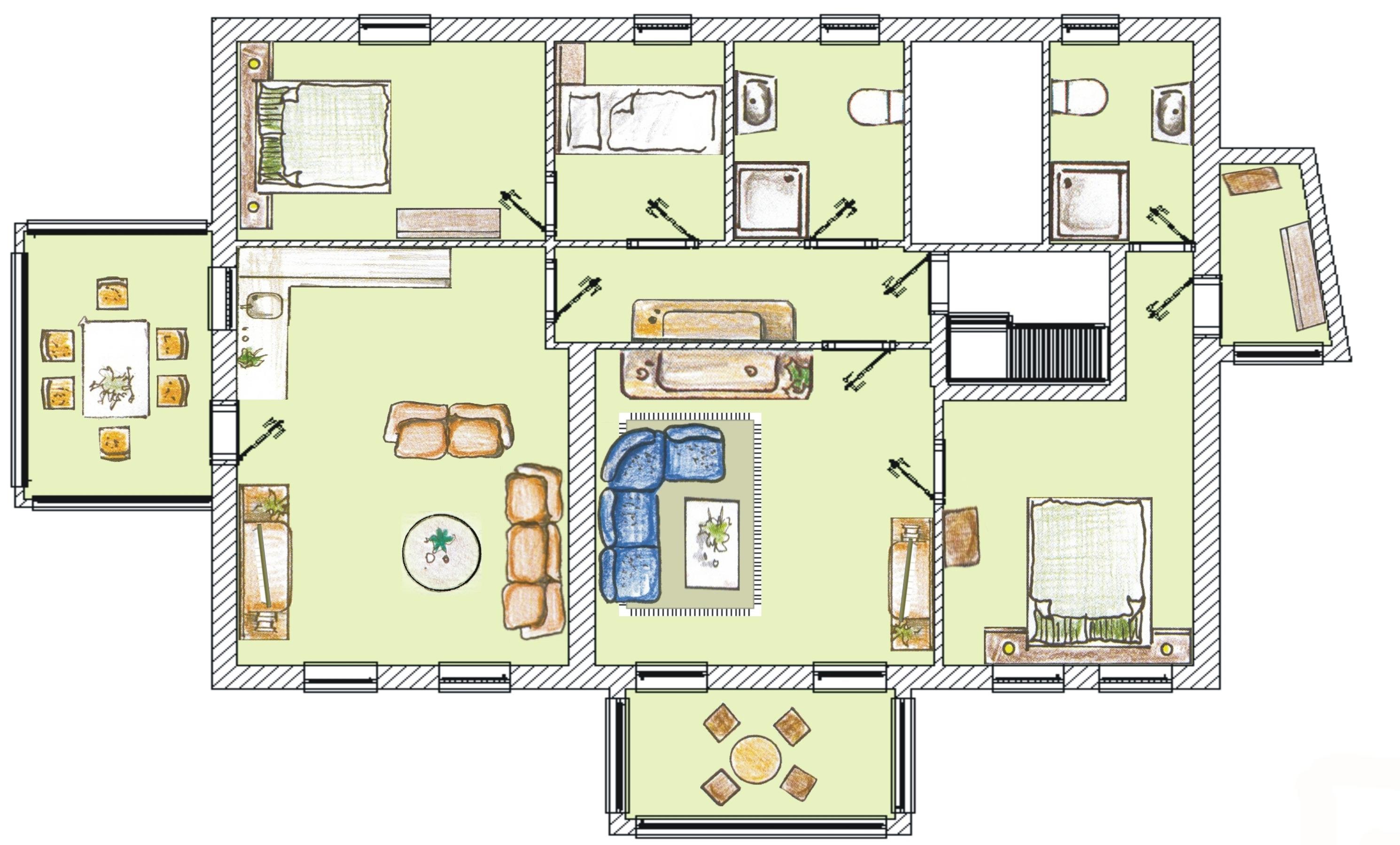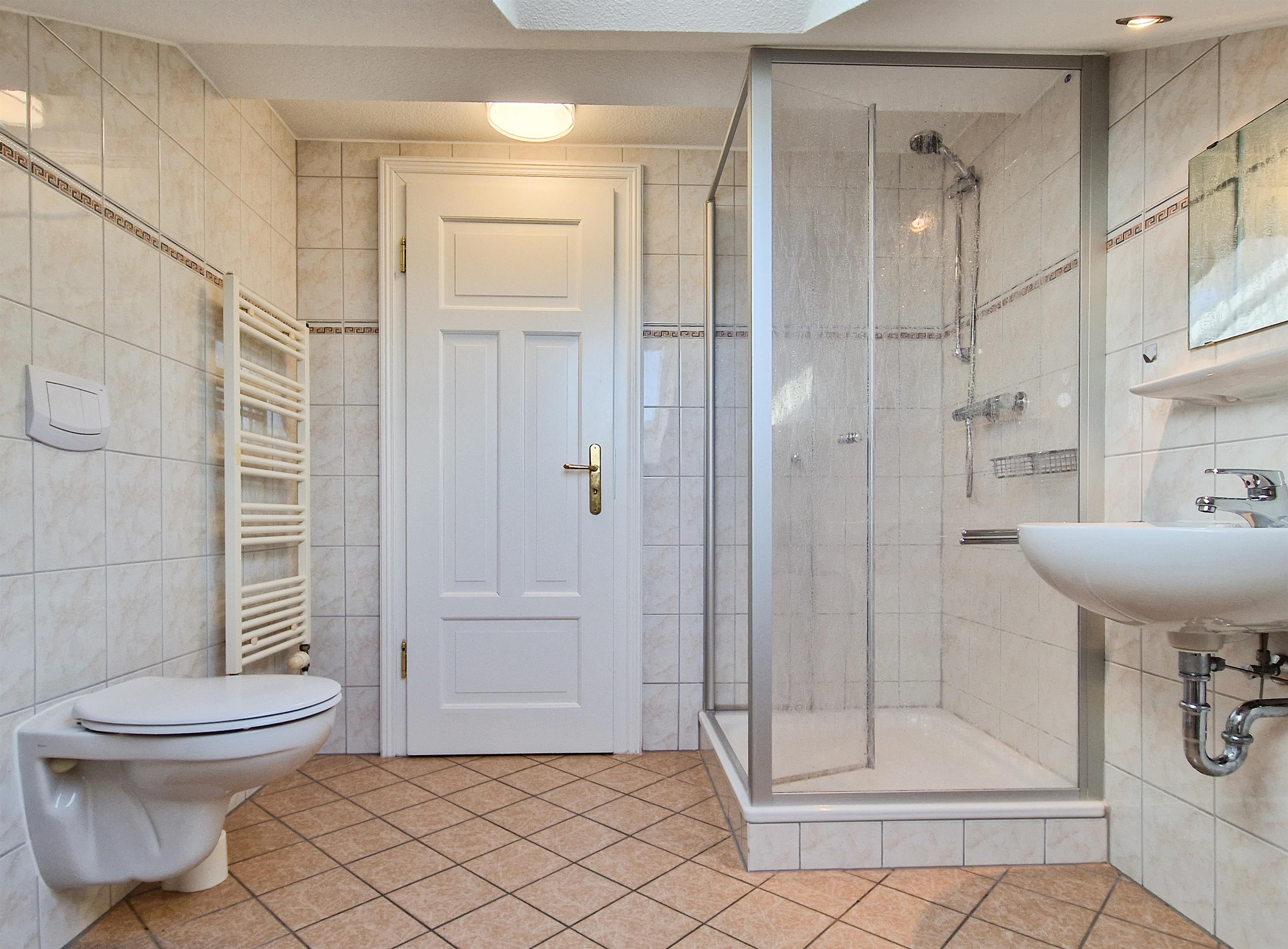 Diese interessante, großzügige Dachgeschoss-Wohnung (Achtung eingeschränkte Deckenhöhe) im 2. Obergeschoß, über den Dächern von Ahlbeck, bietet Ihnen zwei gemütliche Wohnräume, drei Schlafräume und 2 Loggien. Ein heller freundlicher Wohnraum empfängt Sie mit einer großzügigen Polstergruppe (Schlafplatz für die 6. Person) und Flat TV. Die angrenzende Loggia lädt auf ein Gläschen Wein oder zum Lesen und Spielen ein. Im kleineren Wohnraum, ebenfalls mit Sitzgruppe und TV, ist die moderne Küche incl. Geschirrspüler, Cerankochfeld, Backofen Kühlschrank offen integriert. Ein separater Esstisch steht Ihnen in der angrenzenden Loggia mit schönem Blick über die Dächer von Ahlbeck zur Verfügung. Zwei Schlafräume sind mit einem Doppelbett mit getrennten Matratzen (90x200) und ein Schlafzimmer mit einem Einzelbett (90 x 190) eingerichtet. Das kleine Schlafzimmer mit dem Einzelbett ist ein Durchgangszimmer. Zwei gleichwertige Bäder mit Dachfenster bieten eine Dusche und Waschbecken/WC.