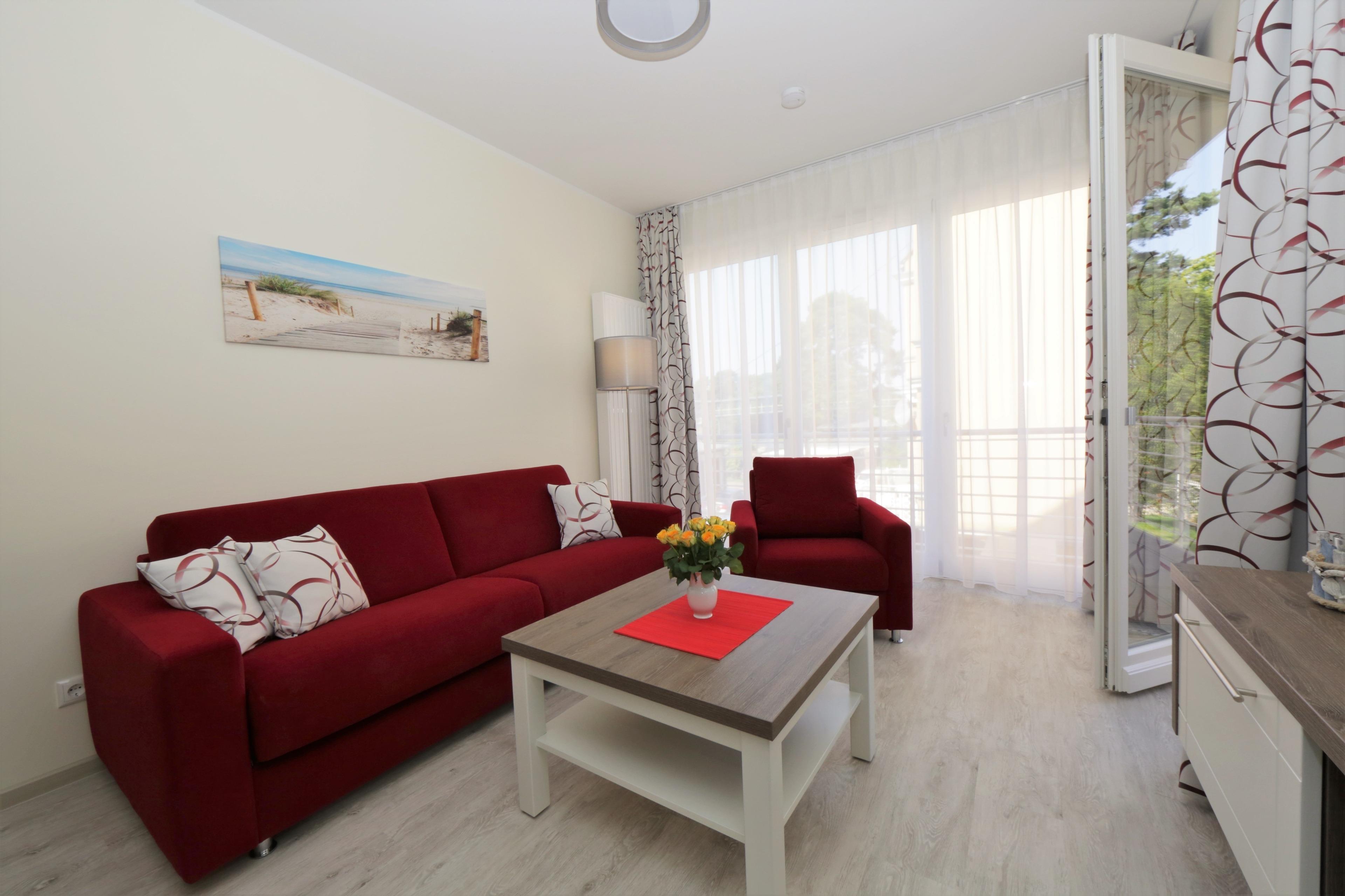 Dieses hochwertige, moderne 2-Zimmer Appartement ist 58 qm groß und befindet sich im 1. Obergeschoss der 2018 neu erbauten Strandresidenz. Die Wohnung ist für 2-4 Personen geeignet. Im Wohnbereich erwartet Sie eine bequeme Polstergarnitur mit Schlaffunktion (Matratze 160 x 200), ein Couchtisch und Flat TV sowie ein Esstisch für gemeinsame Mahlzeiten. Die Küche mit Cerankochfeld, Backofen, Mikrowelle, Geschirrspülmaschine, Kühlschrank etc. ist ebenfalls offen im Wohnraum integriert. Über den Wohnbereich sowie das Schlafzimmer erreichen Sie den zur Promenade und nach Westen ausgerichteten überdachten Balkon von dem aus Sie das Meer, eingeschränkt durch Kiefern, sehen können. Das Schlafzimmer verfügt über ein komfortables Doppelbett mit getrennten Matratzen (90 x 200), einen Kleiderschrank und Flat TV. Das großzügige moderne Badezimmer ist mit einer bodengleichen Dusche mit Echtglasabtrennung und Waschtisch/WC ausgestattet.
