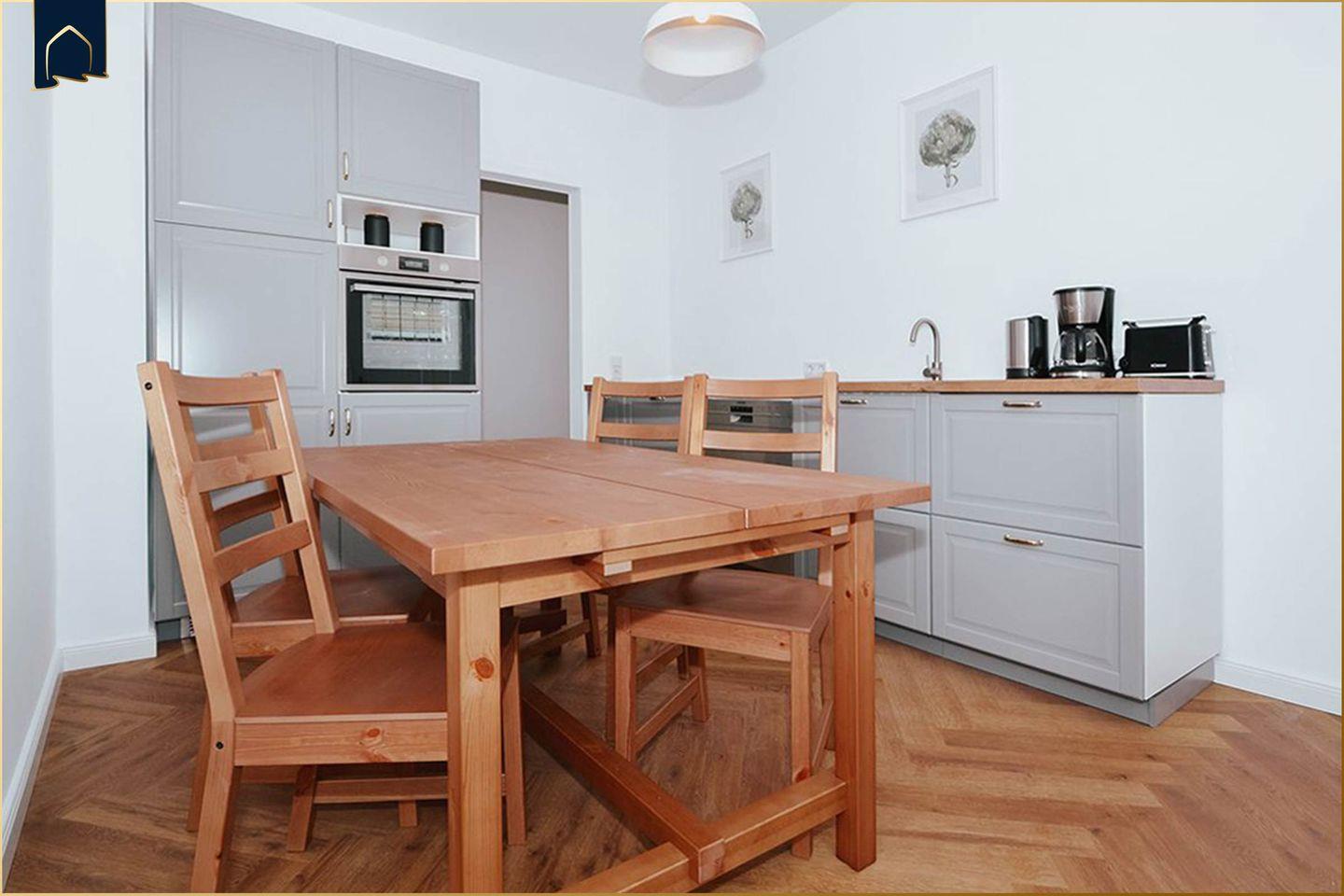 In dieser modernen, ca. 70?m² großen Ferienwohnung erwartet dich ein stilvoll eingerichtetes Zuhause auf Zeit – perfekt für Familien, Paare oder Freunde. Die Unterkunft verfügt über zwei separate Schlafzimmer, ein helles Wohnzimmer mit gemütlicher Sitzecke sowie einen Essbereich mit großem Tisch. Die offene Küche ist voll ausgestattet – inklusive Backofen, Herd, Spülmaschine, Mikrowelle, Kühlschrank mit Gefrierfach, Kaffeemaschine, Wasserkocher und Toaster. Das Badezimmer ist mit einer Badewanne und WC komfortabel ausgestattet. Zwei Fernseher, kostenloses WLAN und ein praktischer Schreibtisch ergänzen das Angebot – ideal auch für eine entspannte Workation auf Usedom.