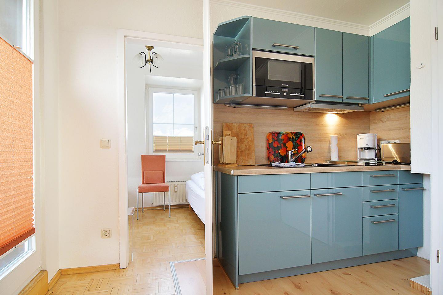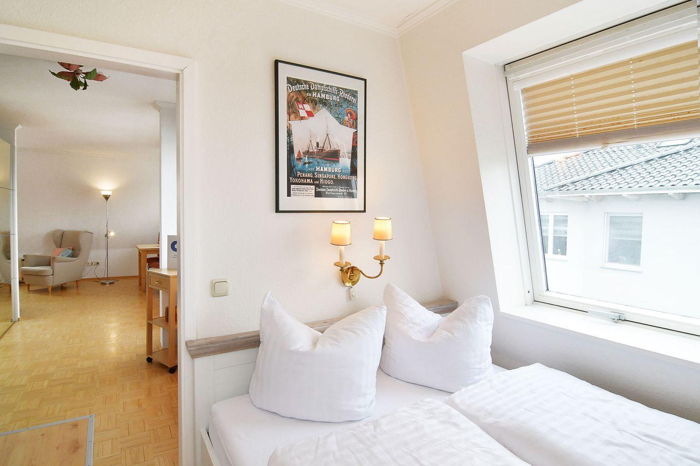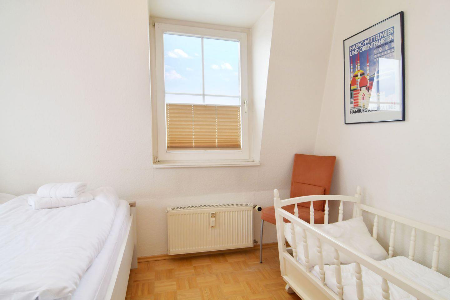 Die nach Westen ausgerichtete 41 m² große Wohnung 08 liegt im 3.OG der Villa Hamburg und bietet einen gemütlichen Wohnraum mit Essplatz und eine offene Küchenzeile. Im Schlafraum gibt es ein Bett 140x200 cm und ein wunderschönes, romantisches Kinderbettchen. Im Wohnzimmer gibt es eine Schlafcouch mit vollwertigem Lattenrost aus der man eine richtige Matratze (125x200 cm) ausklappt.
