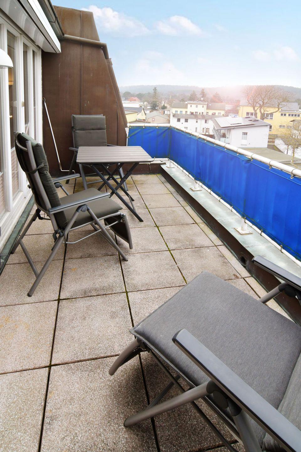 Eine große Dachterrasse ist mit Möbeln bestückt und lädt zum Sonnen ein. Für unsere Gäste, die es nicht ganz so sonnig mögen zaubert eine Markise Schatten auf die Fläche.