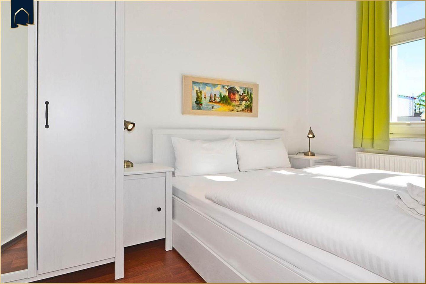 Die helle, modern eingerichtete Wohnung verfügt über ein separates Schlafzimmer mit gemütlichem Bett und viel Stauraum, sowie über ein Badezimmer mit Dusche, Waschbecken, WC und Haartrockner. Im Wohnzimmer erwartet Sie eine komfortable Sofaecke mit TV und Esstisch – ideal zum Entspannen oder für gemeinsame Mahlzeiten.