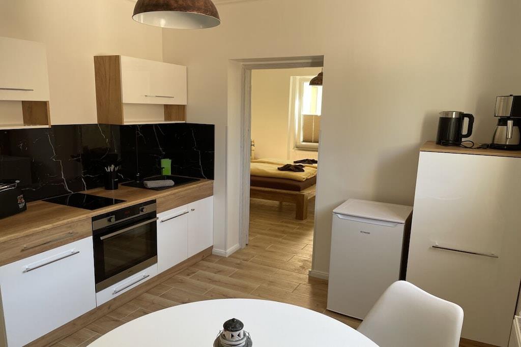 Gemütliche Ferienwohnung Haus Anna in Bansin mit voll ausgestatteter Küche und Fitnessstudio, ideal für einen entspannten Urlaub zu zweit.