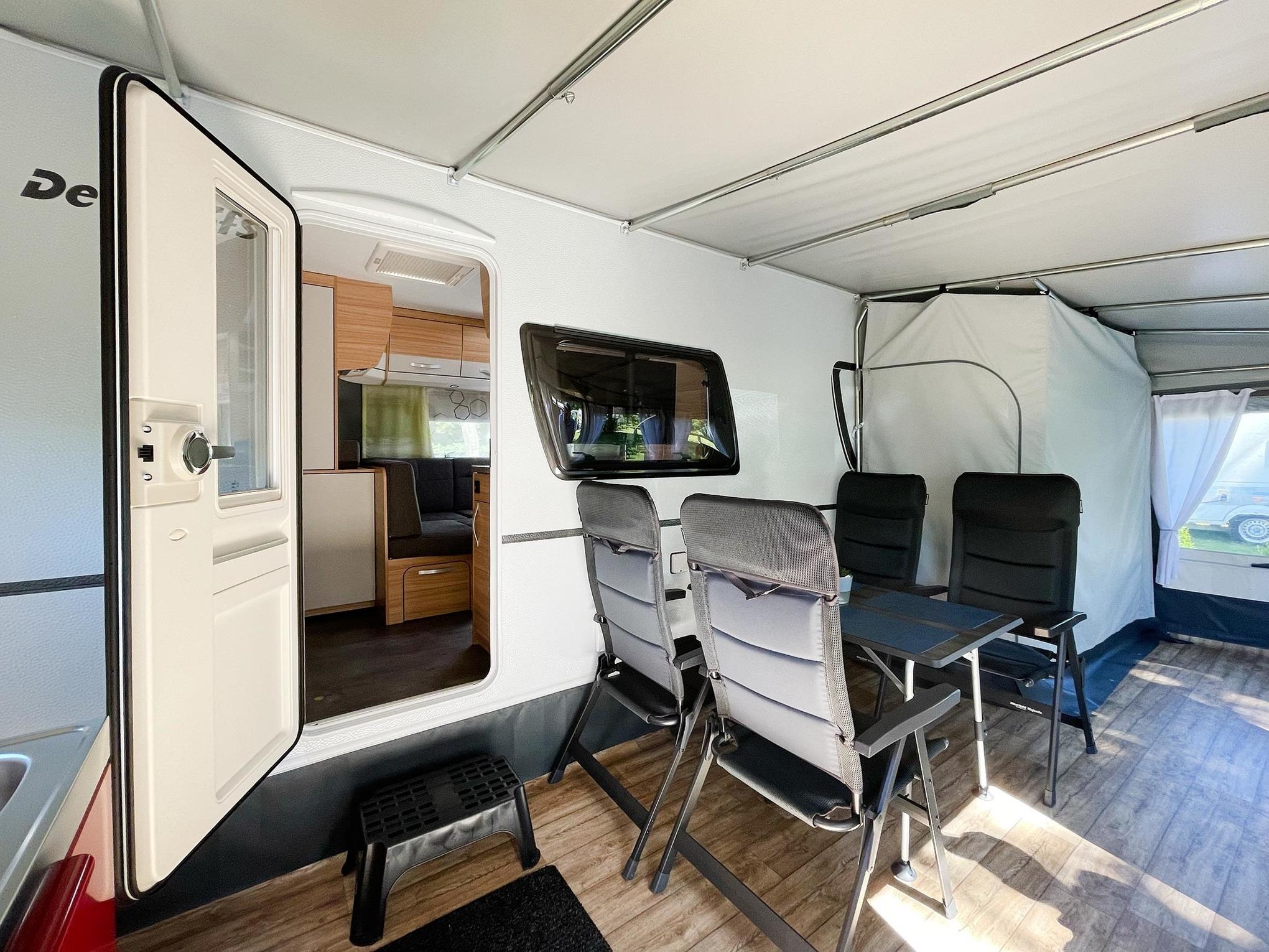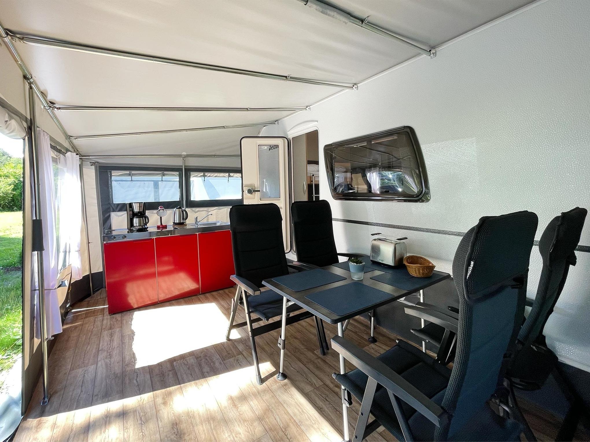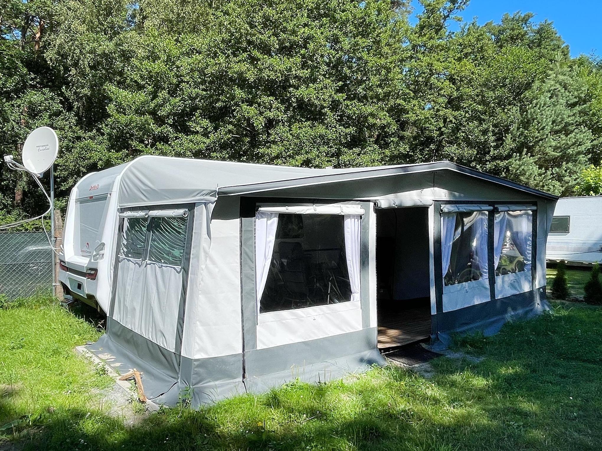 Gemütlicher Wohnwagen in ruhiger Lage nahe Strand mit moderner Ausstattung und Vorzelt.