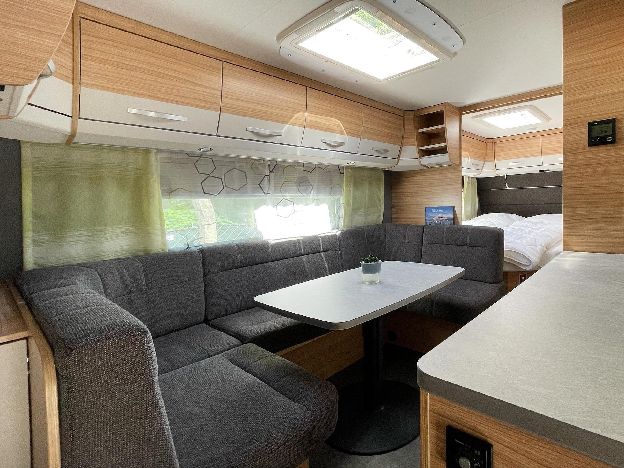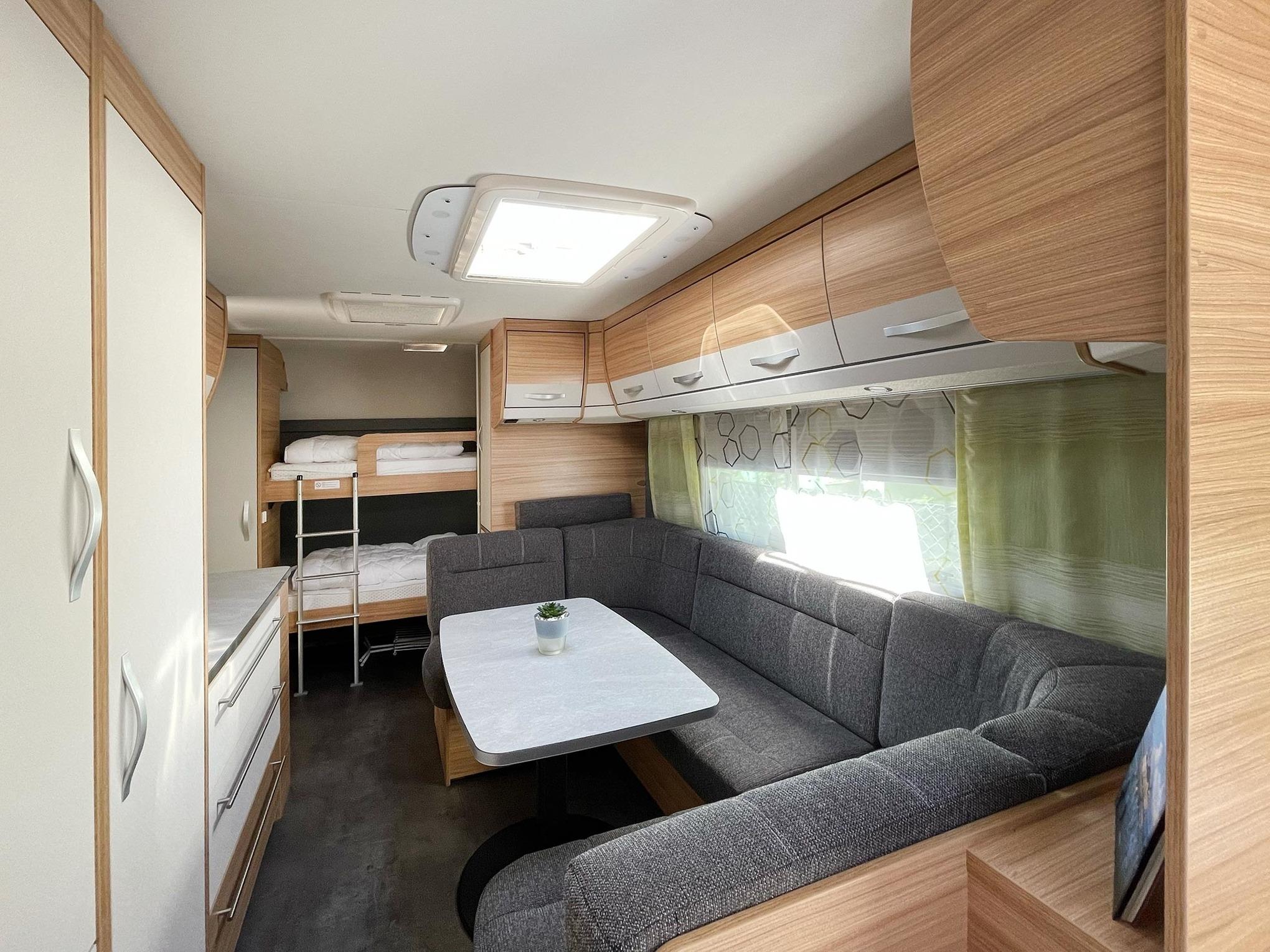 Im hinteren Teil des Wohnwagens befindet sich separat eine Toilette; ein Waschbecken steht im Schlafraum zur Verfügung. Des Weiteren befindet sich im mittleren Teil des Wohnwagens ein Tisch mit großzügiger Sofaecke und einem Fernseher, der auch zum Vorzelt hin schwenkbar ist und somit das Fußballspiel auch im Vorzelt genossen werden kann. Dank des durchdachten Designs bietet das Innere des Wohnwagens viel Stauraum.