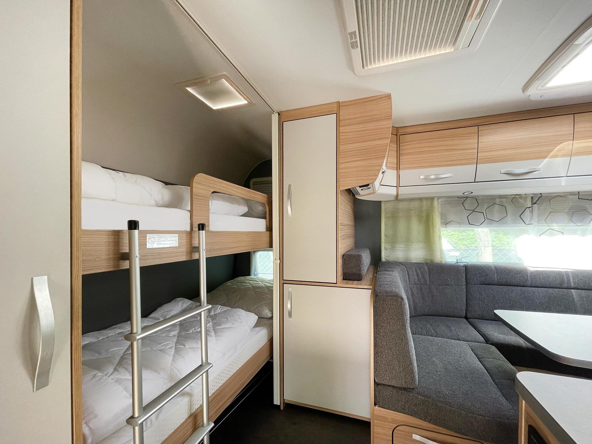 Als Schlafmöglichkeit dient ein großzügiges Ehebett und ein Doppelstockbett.