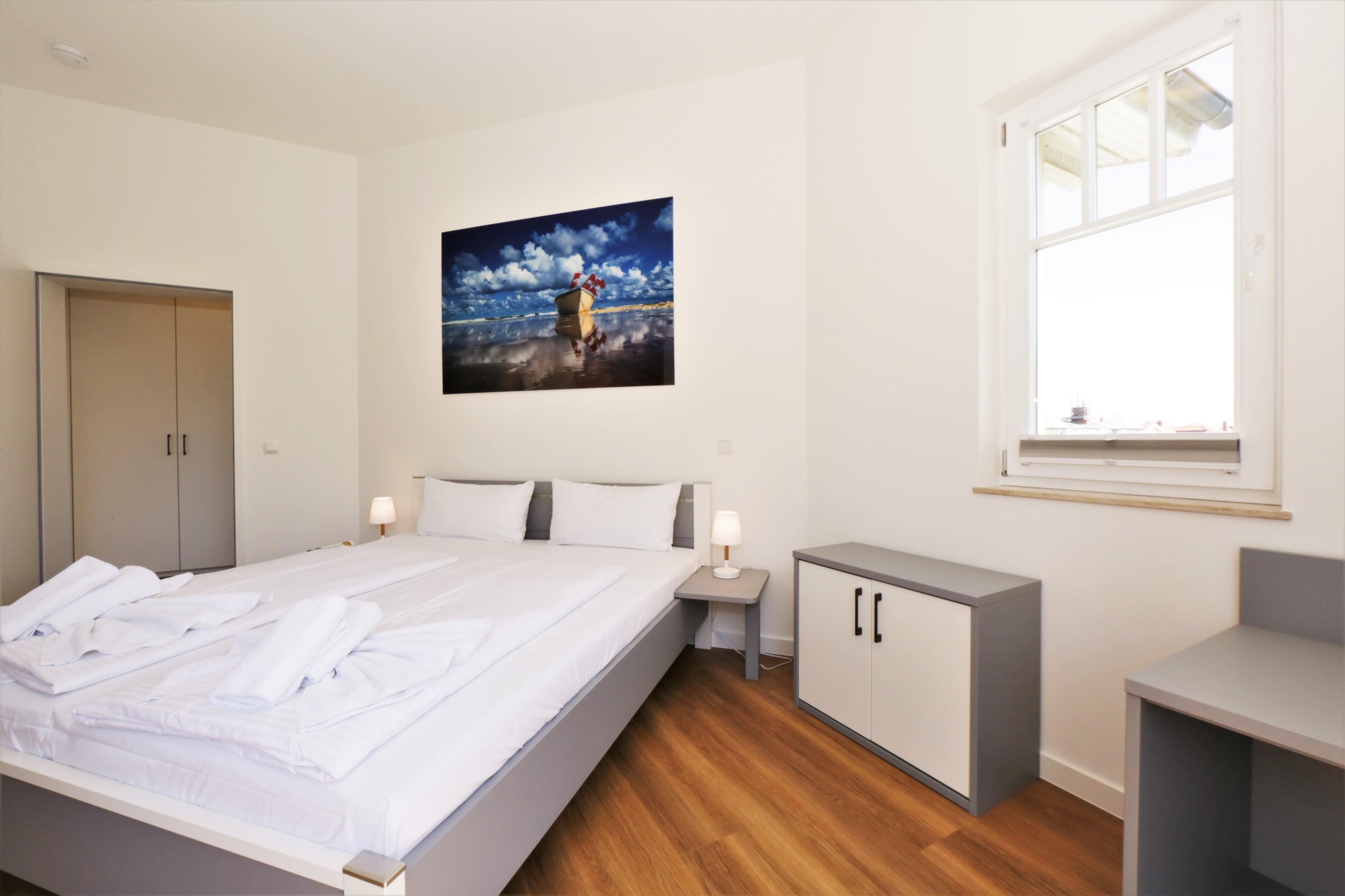 Diese modern eingerichtete 3-Zimmer Wohnung ist 67 qm groß und liegt im 1. Obergeschoss. Sie bietet 4 Personen viel Platz für einen erholsamen Ostseeaufenthalt. Der helle Wohnraum verfügt über eine Couch, Couchtisch und zwei gemütliche Sessel sowie einen großen Flat TV. Offen im Wohnraum integriert wurde die Vollküche incl. Geschirrspüler, Ceranfeld, Backofen, Mikrowelle, Kühlschrank etc. Der Essplatz am Fenster lädt zu gemeinsamen Mahlzeiten ein. Auf dem überdachten Balkon zum Süden, der von einem der Schlafzimmer begehbar ist, ist Sonne garantiert. Die Schlafzimmer sind jeweils mit einem komfortablen Doppelbett mit getrennten Matratzen (90 x 200), ausreichend Schrankraum und Kofferablage eingerichtet. Ein Schlafzimmer bietet den Gästen einen zusätzlichen Flat-TV. Das Bad mit Fenster ist sowohl mit Badewanne als auch mit Dusche und Waschtisch/WC ausgestattet. Ein Pkw-Stellplatz, der der Wohnung zugeordnet ist, steht den Gästen am Haus zur Verfügung. Der Fahrradraum als auch Waschmaschine und Trockner im Keller kann von den Gästen genutzt werden.